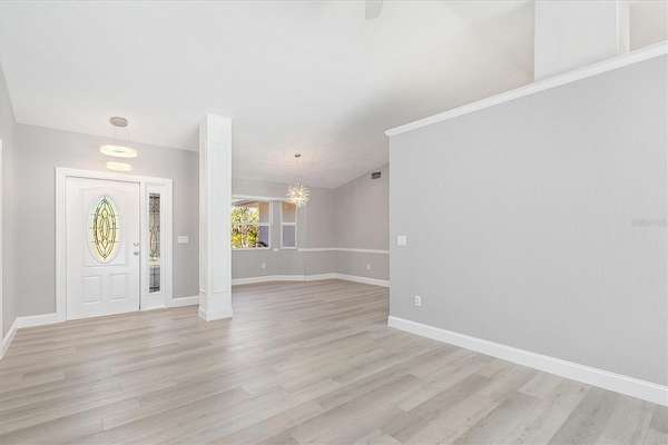 - Cathedral Ceiling(s), Ceiling Fans(s), Chair Rail, Crown Molding, Eat-In Kitchen, High Ceilings, Kitchen/Family Room Combo, Living Room/Dining Room Combo, Open Floorplan, Primary Bedroom Main Floor, Solid Surface Counters, Solid Wood Cabinets, Split Bedroom, Thermostat, Walk-In Closet(s)