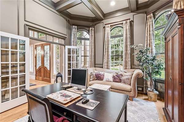 Through stately double wooden doors, you are greeted by an expansive marble foyer floor that immediately sets the tone for the home's romantic beauty. To the right, graceful columns frame the dining room, while to the left, French doors open to a richly appointed office with walls of windows. Moving forward, the two-story great room impresses with floor-to-ceiling bookshelves showcasing intricate millwork and breathtaking seasonal views of the creek at the top of Allmond Lake through its tall windows.