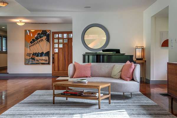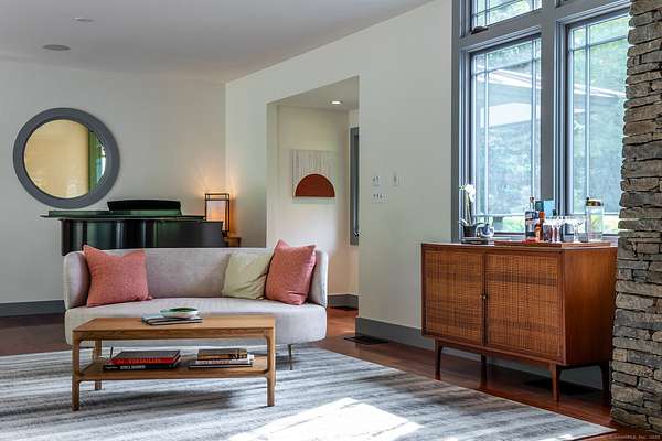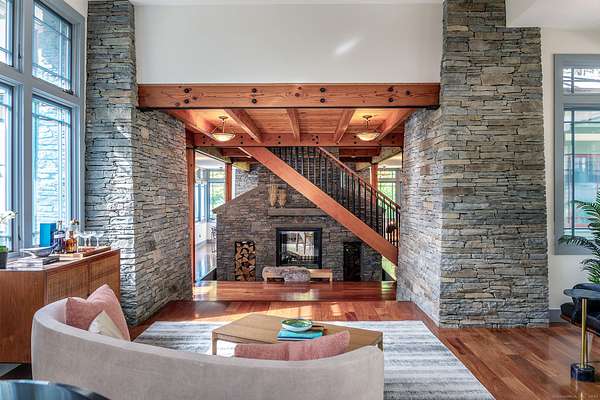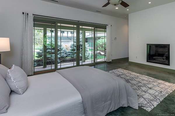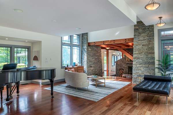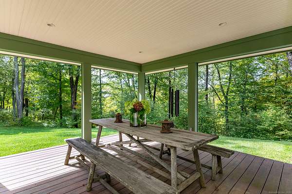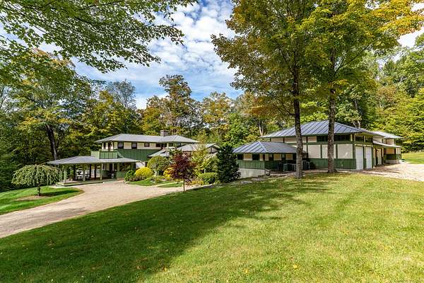 This extraordinary residence is a masterful blend of timeless architectural inspiration and modern luxury, offering a rare opportunity to own a home that is both a work of art and a private retreat. Designed in homage to the style of Frank Lloyd Wright, it features hipped roofs with wide eaves, long horizontal lines, and a seamless integration with the natural landscape. The house is set well back from the road and approached by a meandering driveway that crosses Jack Brook, enhancing both privacy and the sense of arrival. Situated on more than 22 wooded acres, the home provides unmatched seclusion, with nearly every room opening to outdoor living spaces, including covered porches, open terraces, and a serene Zen-inspired courtyard. A dramatic two-sided stone fireplace anchors the main living area, complemented by soaring ceilings and French doors throughout. The chef's kitchen is equipped with a Wolf stove, Sub-Zero refrigerator, center island, and breakfast bar, and opens to a covered porch with seasonal views. The first-floor primary suite, entered through a den with custom built-ins, offers a fireplace, two walk-in closets, a spa-like bath with infinity tub and shower, as well as a sunroom and covered porch overlooking the gardens. Additional spaces include a bedroom/office on the main level and two bedrooms with a sitting area upstairs.