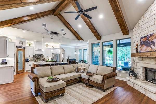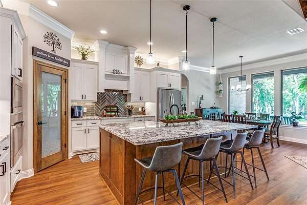 Welcome home! Discover your own private paradise in this stunning home that is nestled among 2 acres of lush greenery, amazing wildlife, and mature trees. This remarkable property is a perfect retreat for those who want to escape to a more rural lifestyle. In addition to the beautifully designed custom home, the property also includes a large, air-conditioned workshop that features top notch amenities. Every detail of the home and shop reflects meticulous care taken by the owners. Upon entering the home, you are welcomed by a spacious open floor plan that seamlessly integrates the living, dining, and kitchen areas. The bright and airy living space invites relaxation, while the beautiful sparkling kitchen, boasts ample counter space, modern appliances, and a gorgeous massive island, ideal for cooking and entertaining. The large, plentiful windows flood the living space with beautiful natural light that offers a splendid view of the surrounding landscape and the abundant wildlife. Located in a NON-HOA neighborhood, it is the ideal retreat for nature lovers and those seeking a peaceful lifestyle. Enjoy the ultimate in luxury and comfort in the primary suite, complete with an incredible en-suite bathroom. This exquisitely designed space is elegantly appointed and offers a truly exceptional experience with a spa-like atmosphere. The shop boasts over 1500 SQUARE FEET of space under roof, including 900 square feet of air-conditioned space with an extra bathroom. Complete with its own water filtration system and hard wired high-speed internet capabilities, the possibilities are endless for any type of projects, storage, office space, gym or it can even be used as living space. There is also large door perfect for your RV & boat parking. Located just a short drive from local amenities, this country home offers the perfect balance of rural charm and modern convenience. *The owners are willing to do a VA assumable loan for qualified buyers. Ask agent for more details.