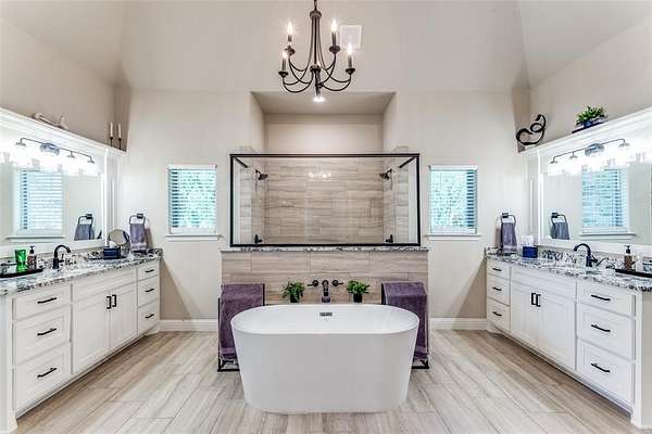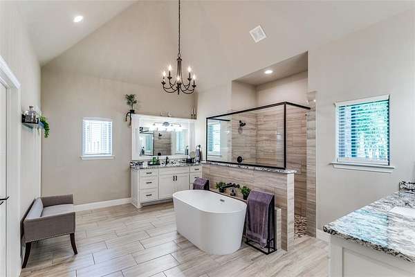 - Cable TV Available, Cathedral Ceiling(s), Chandelier, Decorative Lighting, Double Vanity, Eat-In Kitchen, Flat Screen Wiring, Granite Counters, High Speed Internet Available, Kitchen Island, Open Floorplan, Pantry, Vaulted Ceiling(s), Walk-In Closet(s), Wired For Data