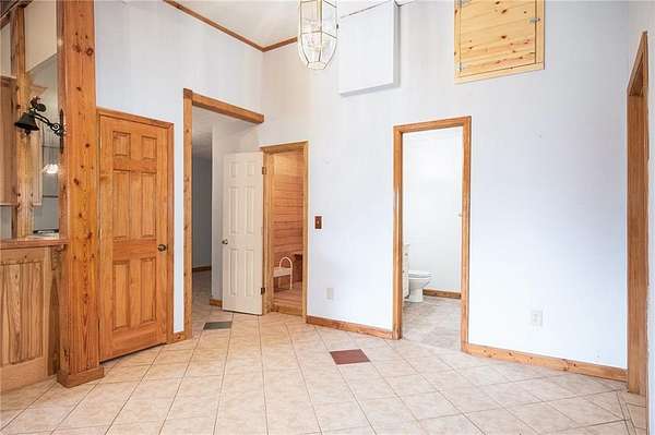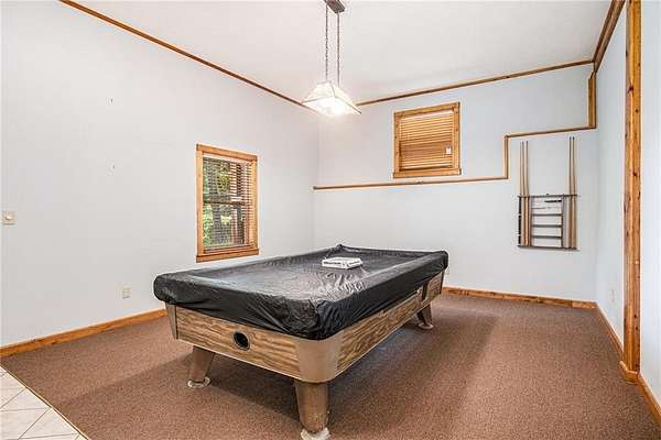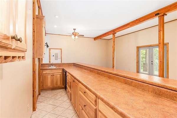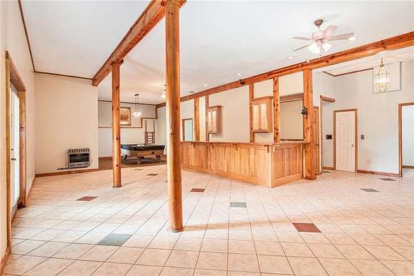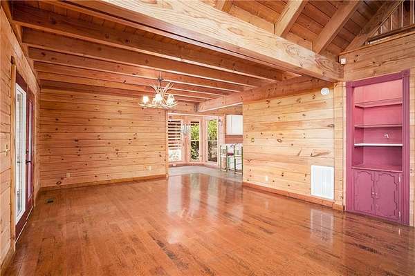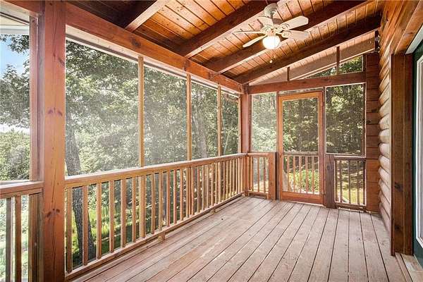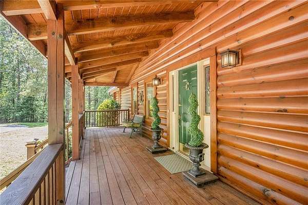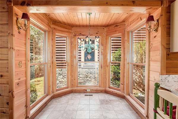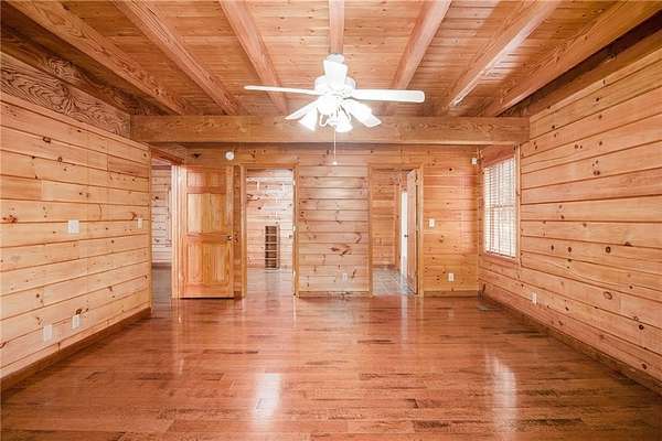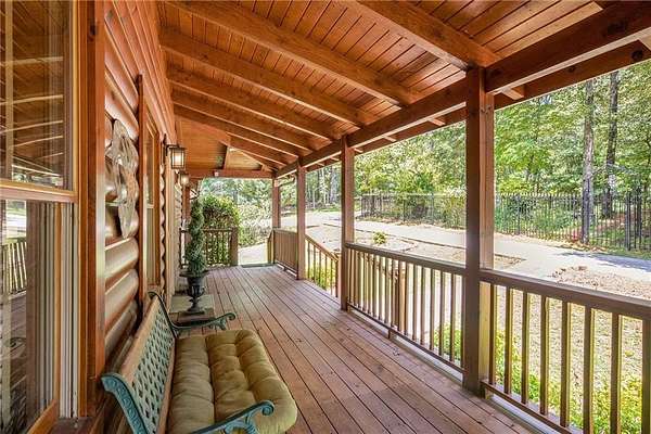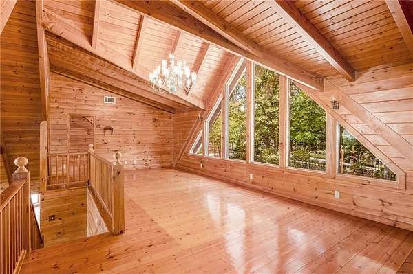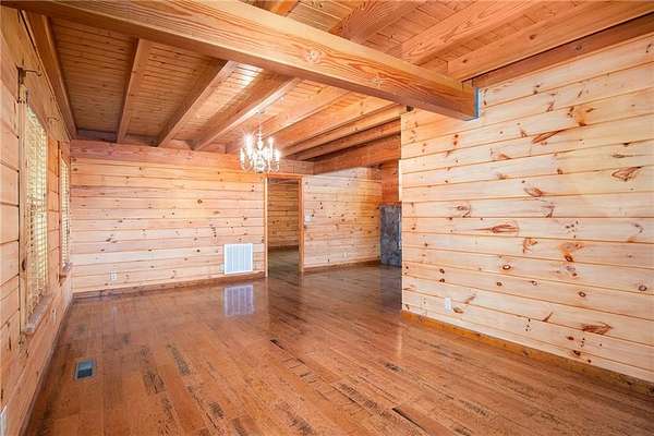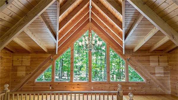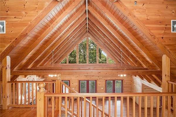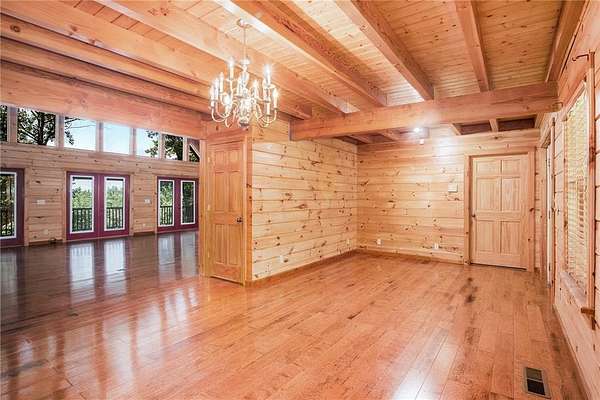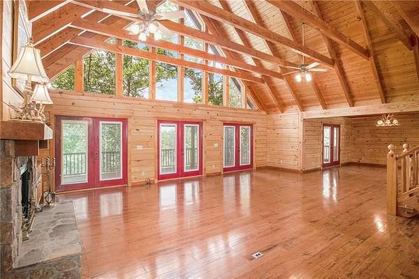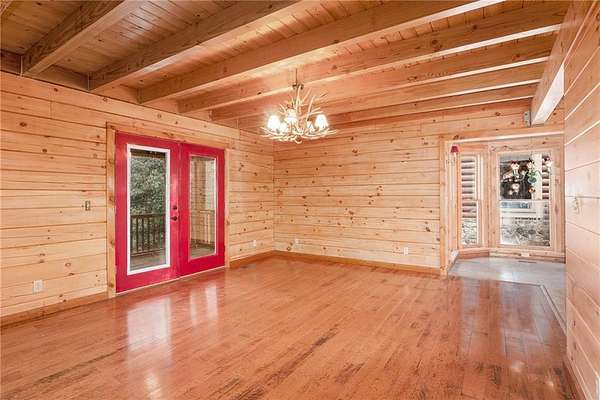 Step into the spacious open foyer, ideal for showcasing unique rustic furnishings. The great room welcomes you with exposed wood beams, a gorgeous rock fireplace that warms the entire space, and multiple French doors leading to the covered back deck--perfect for enjoying peaceful views of the mountain ridge, especially stunning during fall and winter.