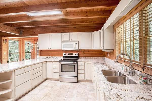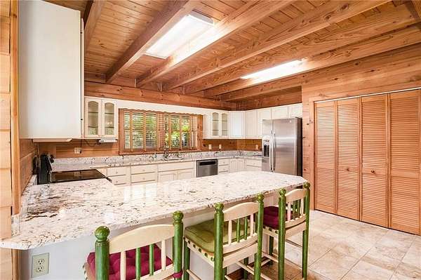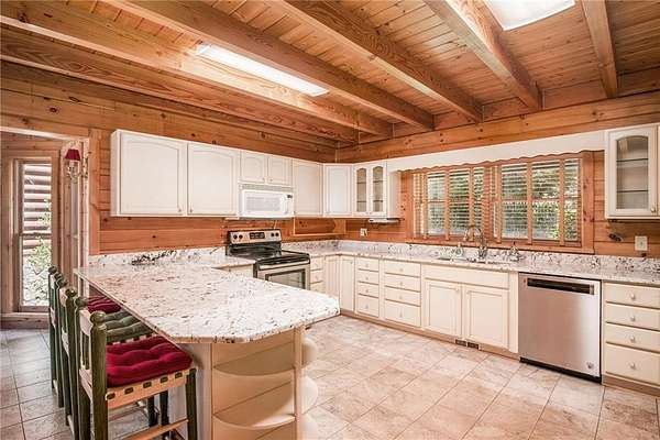 The open-concept dining area seats 12+ with room to spare for a large hutch and a statement deer antler chandelier imported from Wyoming. Just off the dining area, the kitchen features brand-new granite countertops, stainless steel appliances, and a cozy bay-window breakfast nook.