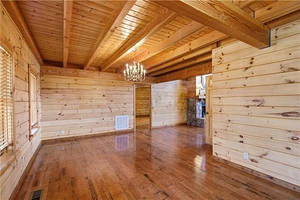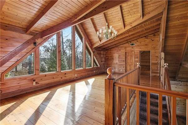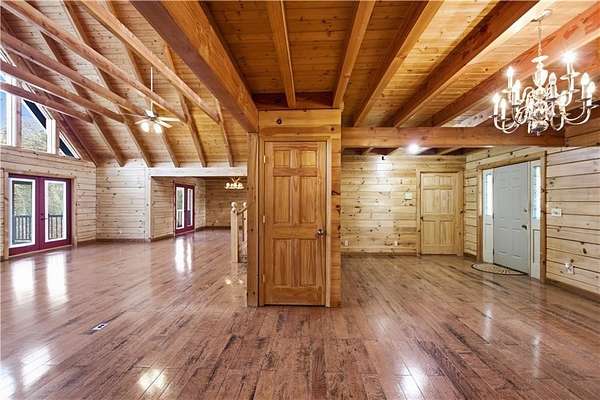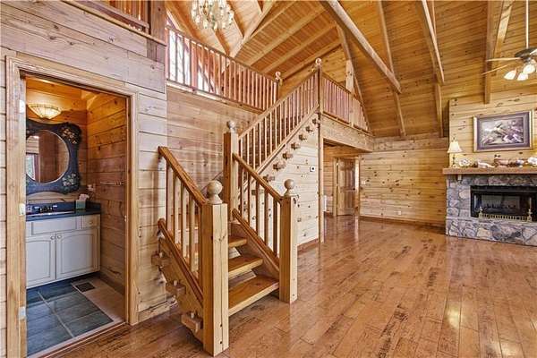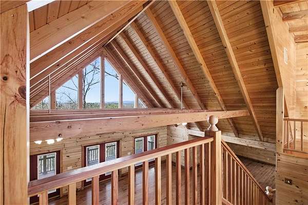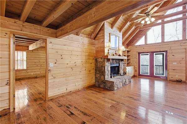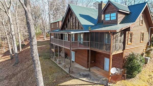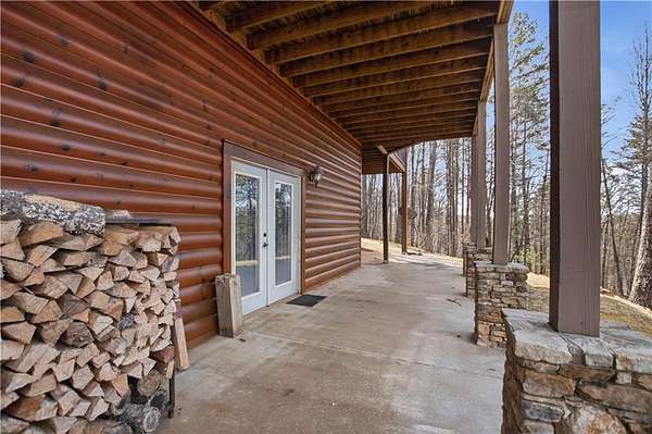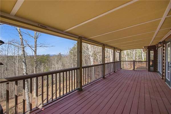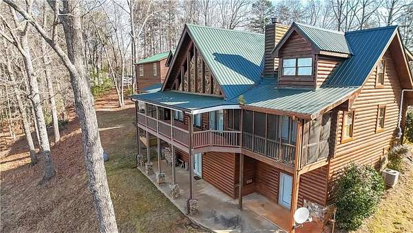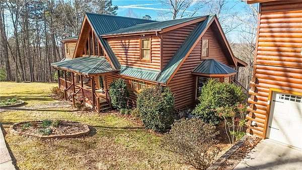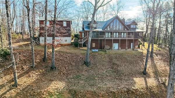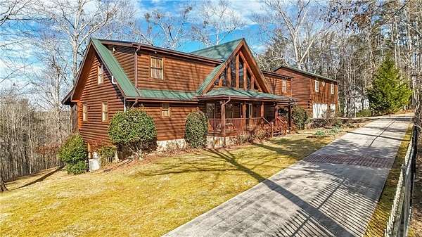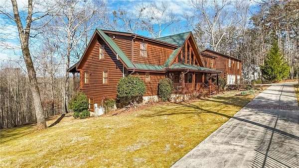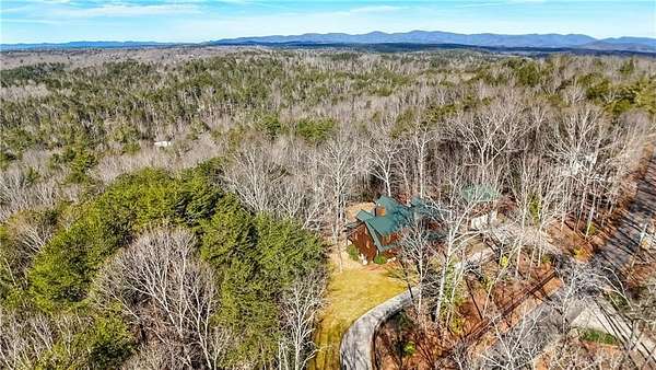 Custom-built log home perched on a private hilltop with breathtaking long-range mountain views and convenient access from county-maintained paved roads, just minutes from downtown Dahlonega, Helen, wineries, hiking, and all that North Georgia has to offer. The main house features 4 bedrooms and 4.5 baths with walls of windows across the front and back, filling the home with natural light while showcasing the mountain ridgeline. The great room offers exposed wood beams, a stunning floor-to-ceiling stone fireplace, and French doors leading to a covered back deck perfect for enjoying the views year-round, while the covered front porch overlooks a fenced garden area. The spacious dining area accommodates 12+ guests and flows into the updated kitchen with new granite countertops, stainless steel appliances, and a bay-window breakfast nook. The owner's suite includes a private screened patio retreat. Upstairs, a large loft captures mountain views and natural light, with two generously sized bedrooms on opposite ends, each with its own en-suite bath. The finished terrace level is designed for entertaining with a wet bar featuring built-in cabinetry, a regulation-size pool table, sauna, large flex/media space, private lower-level bedroom, patio wired for a hot tub, and a propane backup heater capable of heating the entire basement. Dual HVAC systems provide efficient climate control. The detached oversized 3-car garage includes a finished upper-level 1 bedroom, 1 bath suite ideal for guests, office space, or potential rental income, plus a separate basement under the garage with private road access for workshop or additional storage. An exceptional opportunity for full-time living, second home, or income-producing mountain retreat.