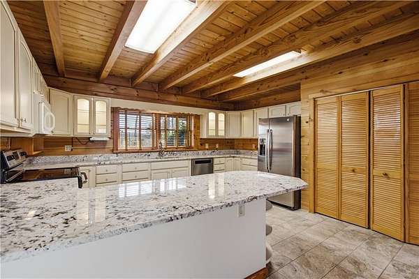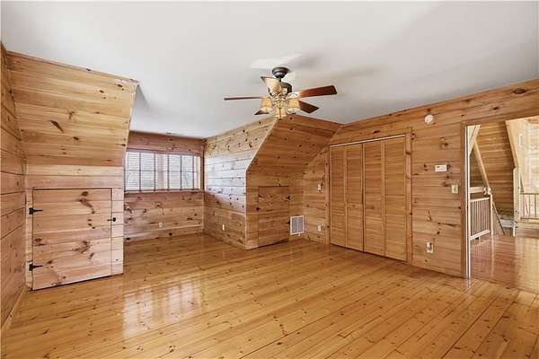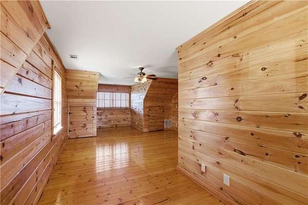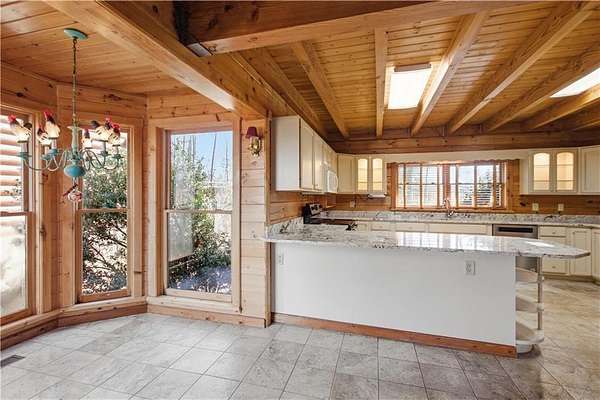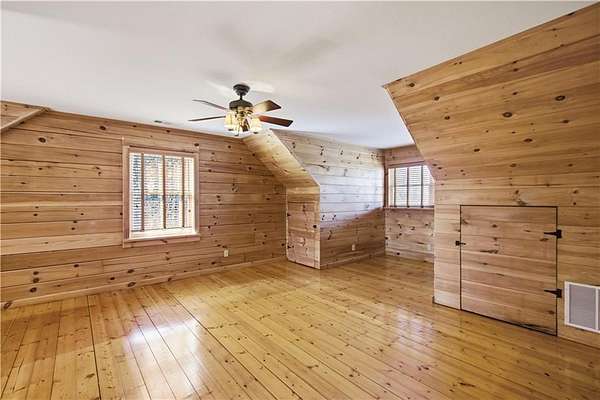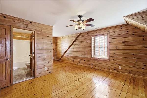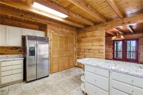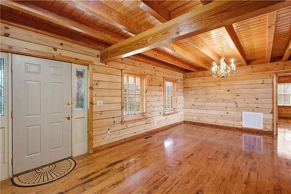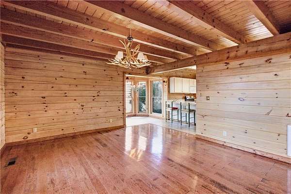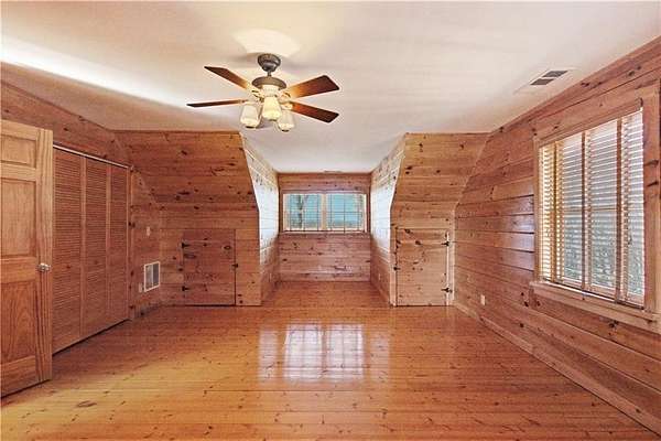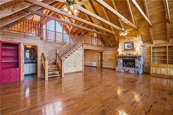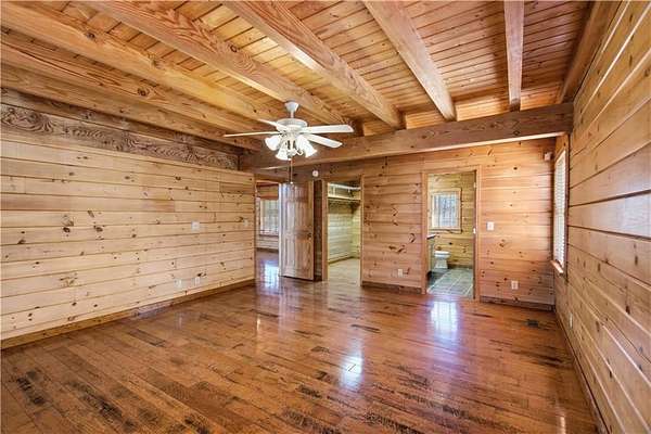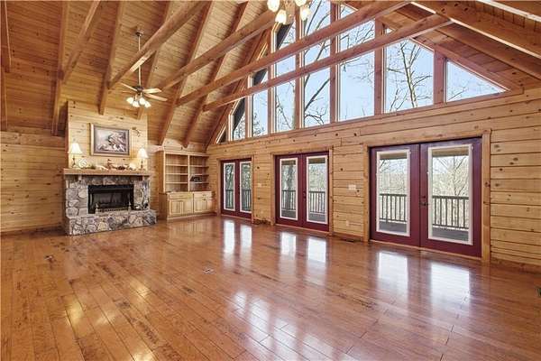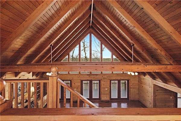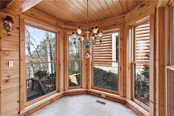Custom-built log home perched on a private hilltop with breathtaking long-range mountain views and convenient access from county-maintained paved roads, just minutes from downtown Dahlonega, Helen, wineries, hiking, and all that North Georgia has to offer. The main house features 4 bedrooms and 4.5 baths with walls of windows across the front and back, filling the home with natural light while showcasing the mountain ridgeline. The great room offers exposed wood beams, a stunning floor-to-ceiling stone fireplace, and French doors leading to a covered back deck perfect for enjoying the views year-round, while the covered front porch overlooks a fenced garden area. The spacious dining area accommodates 12+ guests and flows into the updated kitchen with new granite countertops, stainless steel appliances, and a bay-window breakfast nook. The owner's suite includes a private screened patio retreat. Upstairs, a large loft captures mountain views and natural light, with two generously sized bedrooms on opposite ends, each with its own en-suite bath. The finished terrace level is designed for entertaining with a wet bar featuring built-in cabinetry, a regulation-size pool table, sauna, large flex/media space, private lower-level bedroom, patio wired for a hot tub, and a propane backup heater capable of heating the entire basement. Dual HVAC systems provide efficient climate control. The detached oversized 3-car garage includes a finished upper-level 1 bedroom, 1 bath suite ideal for guests, office space, or potential rental income, plus a separate basement under the garage with private road access for workshop or additional storage. An exceptional opportunity for full-time living, second home, or income-producing mountain retreat.
