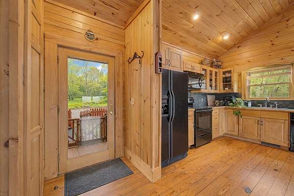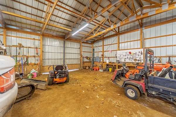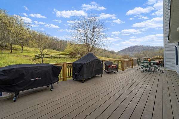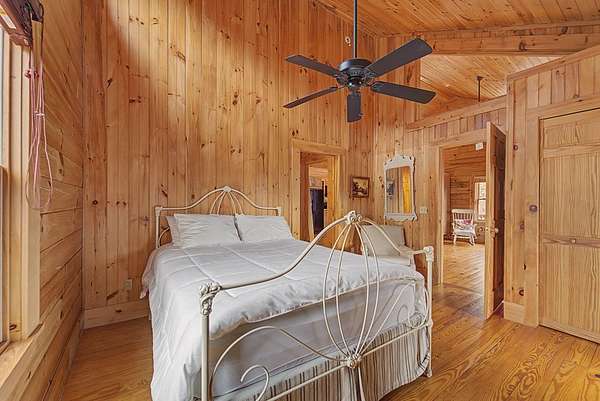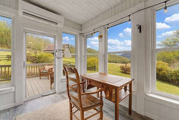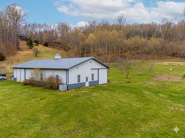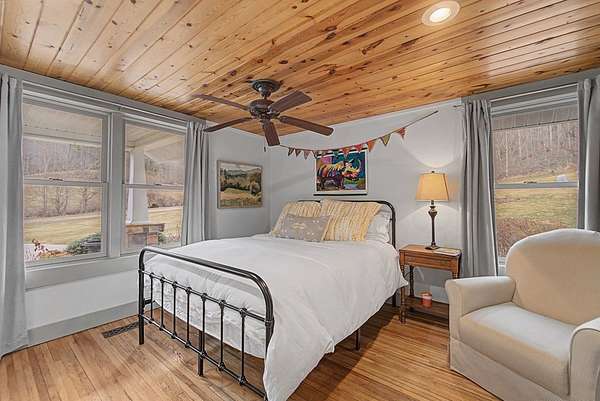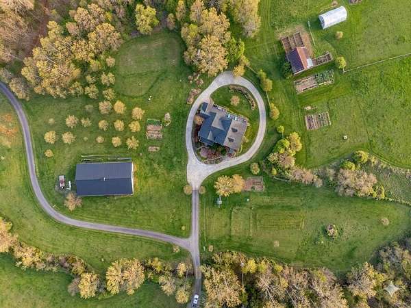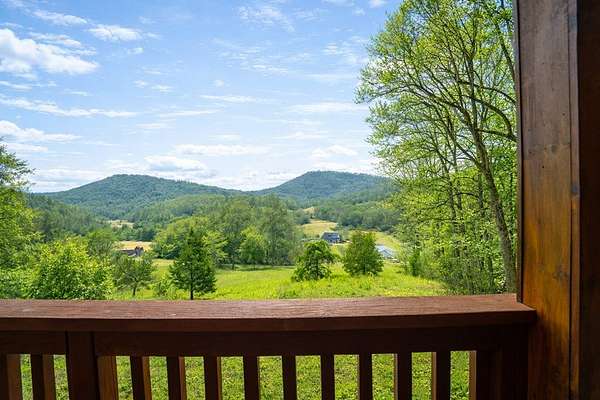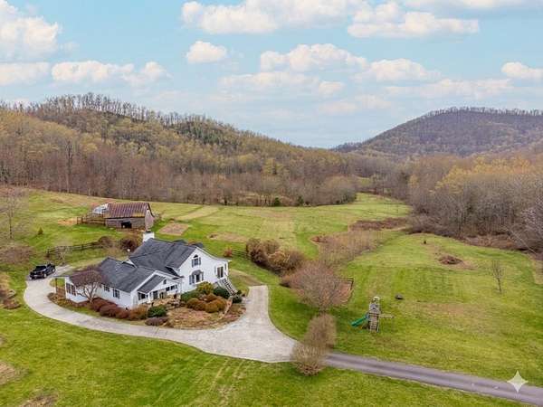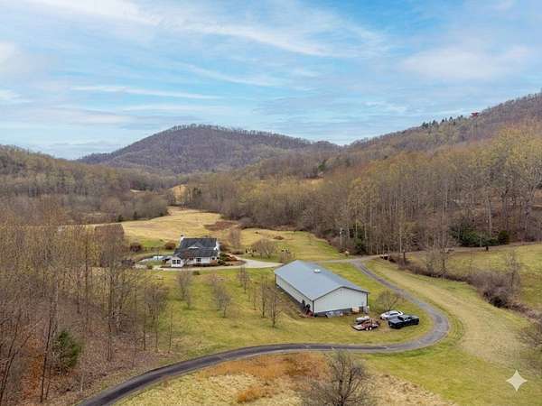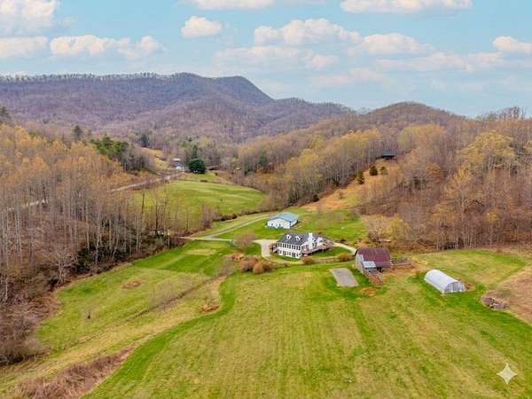 An exceptional high elevation mountain estate offering 2 homes on nearly 10 acres at 3,200 feet with sweeping long-range views, bold creek, fruit orchard, lush pasture, and gently rolling, highly usable land. Ideal for those seeking space, privacy, and a true Western NC mountain lifestyle. The modern farmhouse blends warmth and character with thoughtful updates, featuring 4BR/2BA with a loft and an expansive primary suite designed as a private retreat with generous space and comfort. The great room is anchored by a striking rock fireplace, complemented by formal dining and a modern kitchen created for gathering. Flexible living areas include a sunroom ideal for indoor gardening or relaxation, plus a spacious lower level suited for den, office, or recreation. Starlink internet installed. Expansive outdoor living spaces overlook the farm and surrounding mountains. A stunning 2BR/1BA log cabin with loft offers privacy for guests, rental or multigenerational living. The impressive 75x42 Morton metal building with backup generator, picturesque functional log barn, greenhouse, and established garden areas complete this rare Western NC mountain homestead built for self-sufficient living.