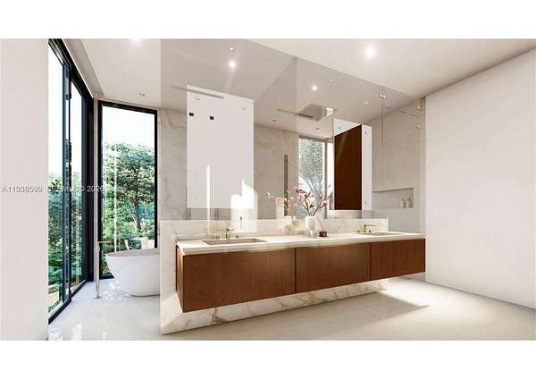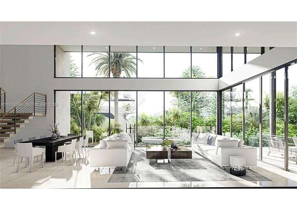 Property features direct ocean access with one fixed bridge (appx. 13 ft clearance) and ample space for future dockage, providing convenient boat access to Biscayne Bay & Haulover Inlet. Architectural plans by SDH Studio are available for a striking 6,264 SF modern residence with 6 bedrooms plus a study, den, and 6.5 baths, designed for luxury waterfront living and seamless indoor-outdoor flow.