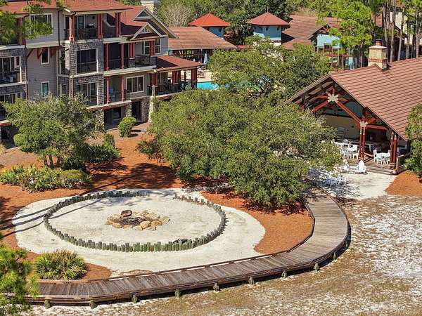 Going west on Hwy 98, turn right into the Wild Heron community on Wild Heron Way. Go through the security gate. Turn left onto Trumpet Trail.