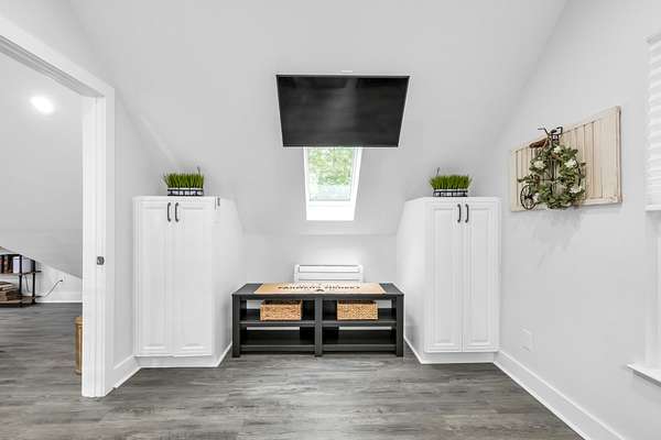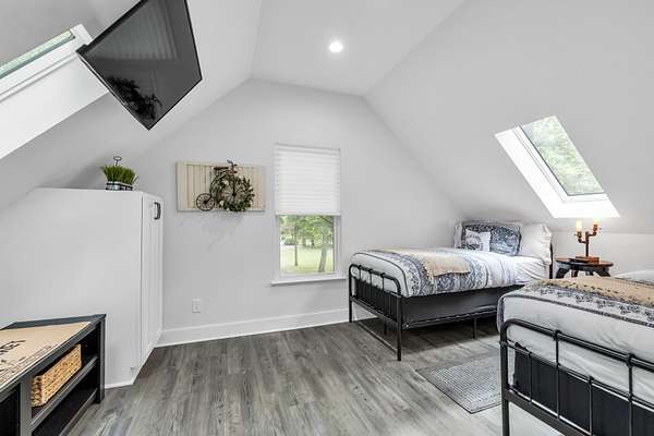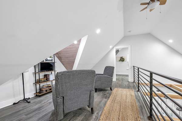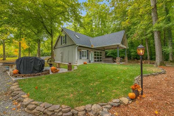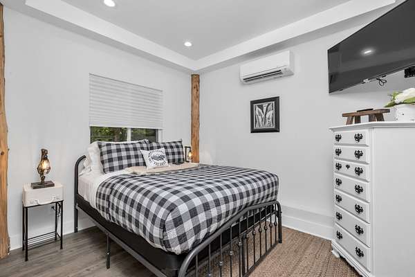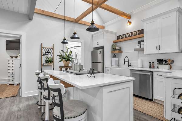 Modern barn chalet with two bedrooms, one full bath, chef's kitchen, and opening garage doors to covered porch with income potential as well.