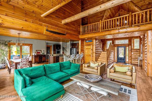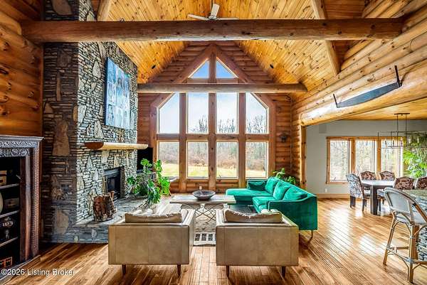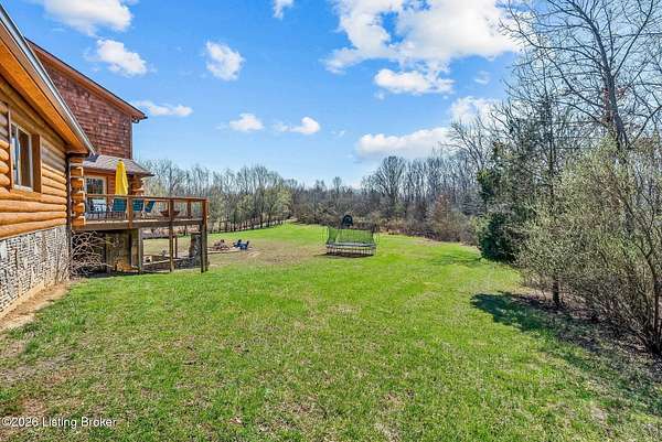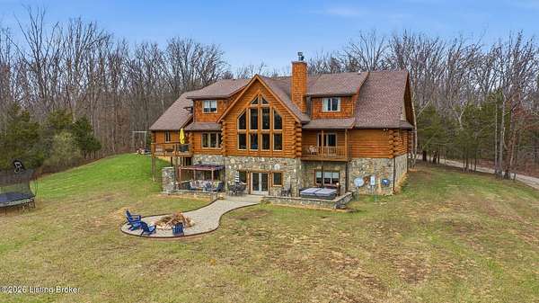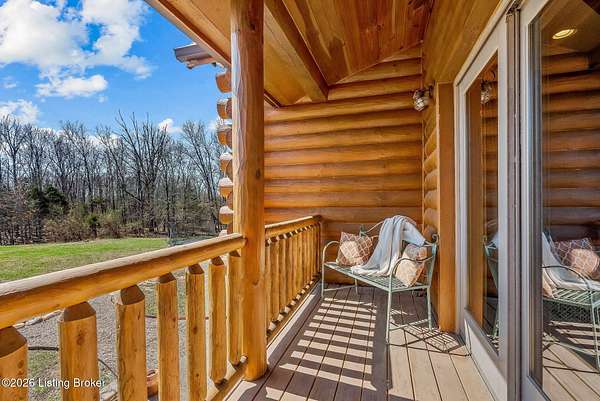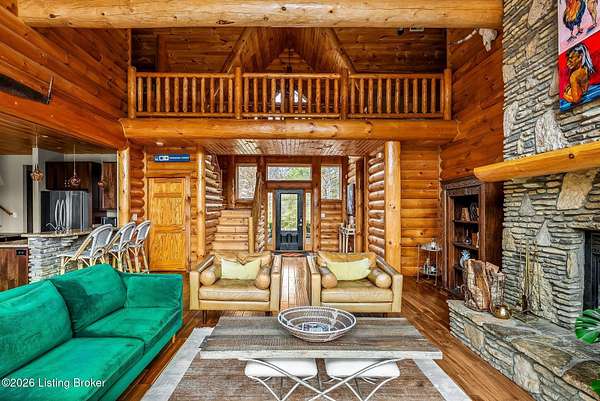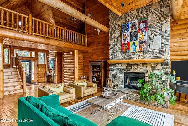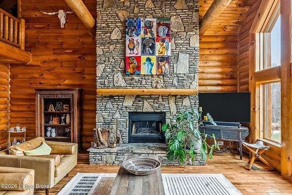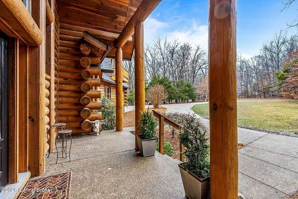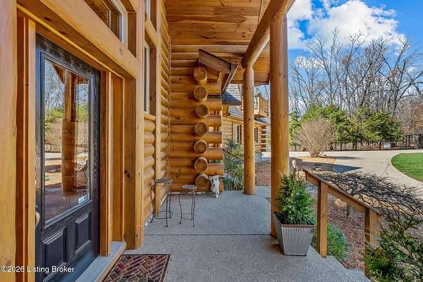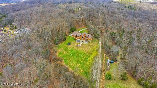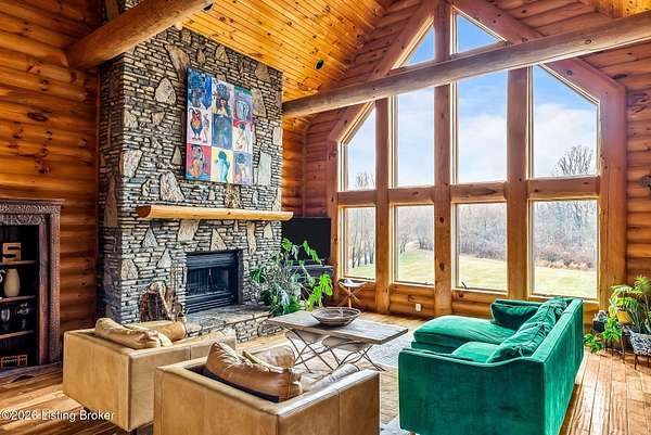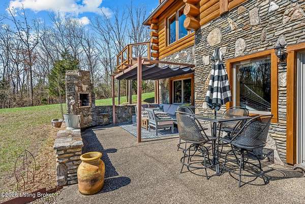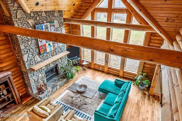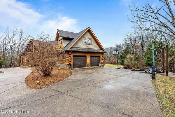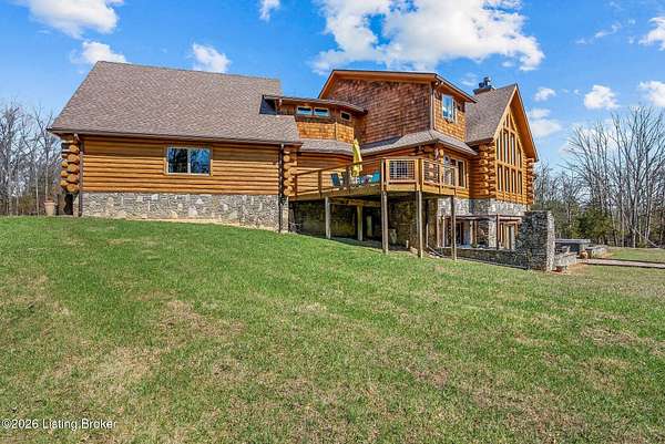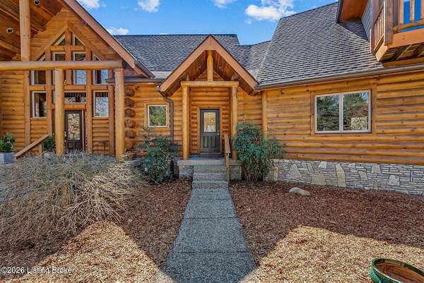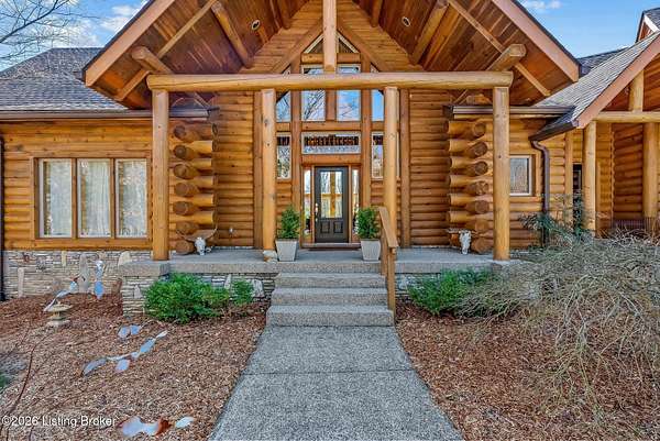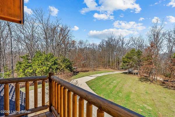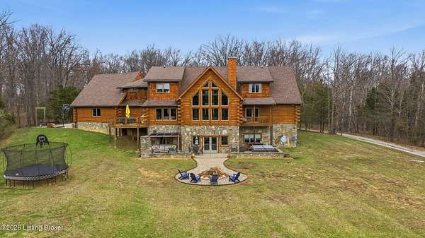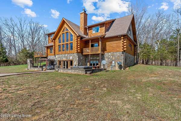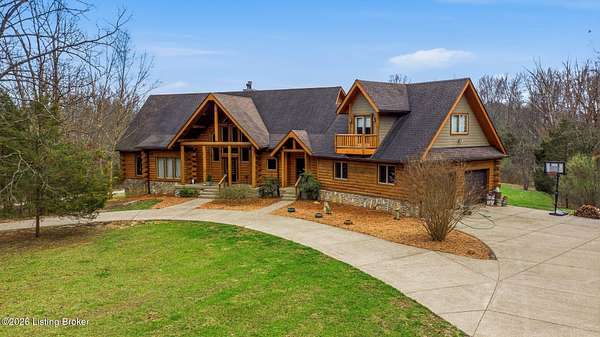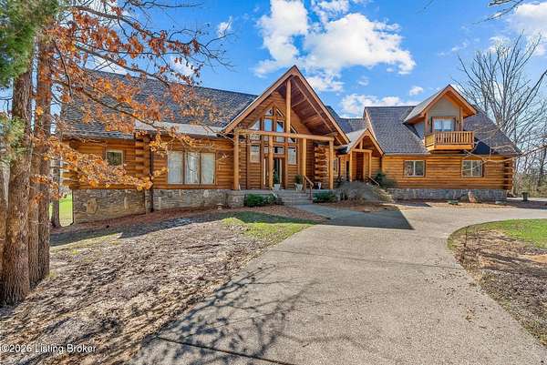 Welcome to 2212 Ballard School Rd in LaGrange, a spectacular custom-built log estate set on 16 private acres with breathtaking views of woods and pasture in every direction. Tucked 1/4 mile off the main road, this property offers exceptional privacy while still being just minutes from LaGrange shopping, dining, and I-71. Step inside to a breathtaking great room defined by a dramatic 2.5-story vaulted ceiling and an expansive A-frame wall of windows that fills the space with sunlight and captures sweeping views of the peaceful surroundings. Extraordinary, handcrafted stone masonry anchors the room with a beautiful fireplace and continues throughout both the interior and exterior of the home, highlighting the craftsmanship of this one-of-a-kind property. Acacia wood floors run through the entry, great room, kitchen, and primary suite, adding warmth and character. The first-floor primary suite offers a relaxing retreat with a trey ceiling, sitting area, dual walk-in closets, and private deck overlooking the rear property. The spacious bath includes dual vanity, large tub and walk in shower creating a comfortable and functional layout. Designed for everyday living and entertaining, the kitchen opens to the dining and living areas and includes an oversized pantry, mudroom, and convenient laundry access with direct entry to the oversized two-car garage. Built-in speakers enhance both the kitchen and outdoor deck spaces. Off the dining area, a large deck provides the perfect setting for enjoying the surrounding countryside. Upstairs, you'll find four generously sized bedrooms, including one with a private balcony overlooking the front of the property and another with an en-suite bath. The upper level also features a loft and an additional full bathroom. The finished walkout lower level offers additional living and entertaining space, featuring a bar area and a beautifully crafted hearth with a wood stove, along with doors that open to the rear patio and outdoor gathering area. An additional 1,600+ square feet of unfinished basement provide excellent expansion potential, including two framed and electrically wired rooms ready to be finished and plumbing already installed for a future basement bathroom. Outdoor living is equally impressive with five patios and decks, including the private primary suite balcony. The property also features an outdoor firepit, stone pizza oven, outdoor grilling area, deer stands, dog kennels, and even an ATV included with the property, making the acreage a true outdoor playground. Recent improvements include newly stripped and resealed logs along the rear of the home and rebuilt balcony railings. The home is also equipped with dual geothermal heat pump systems and a whole-house Culligan water filtration system with separate drinking water filtration including a new water heater (2025). With 16 acres of rolling land, partial woods, expansive views, and unmatched privacy, this extraordinary property offers the perfect blend of rustic elegance, modern efficiency, and convenient location. A rare opportunity to own this one-of-a-kind property that offers privacy, character, and incredible craftsmanship while still being conveniently located near LaGrange amenities.