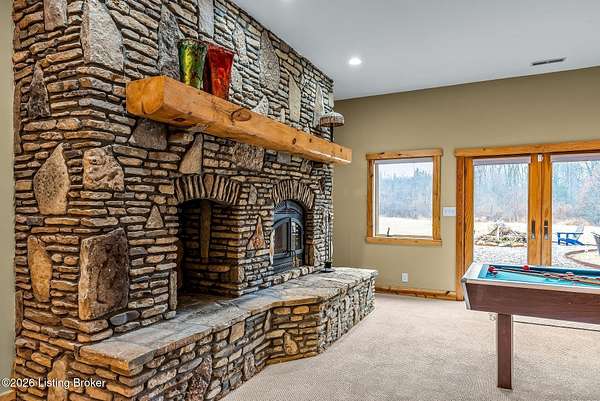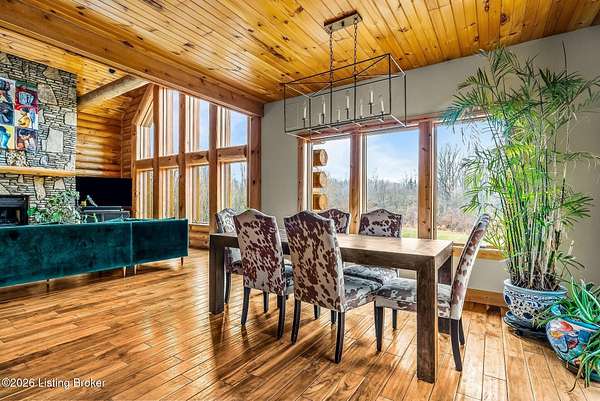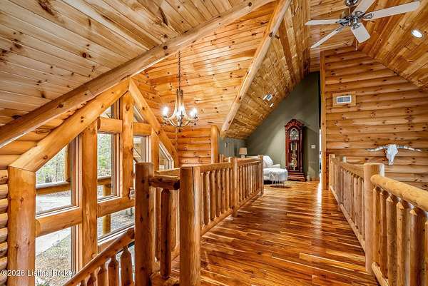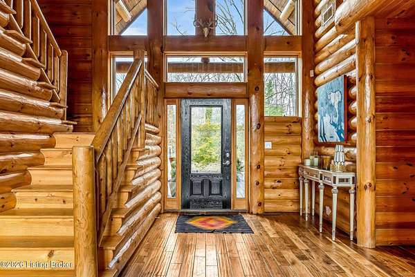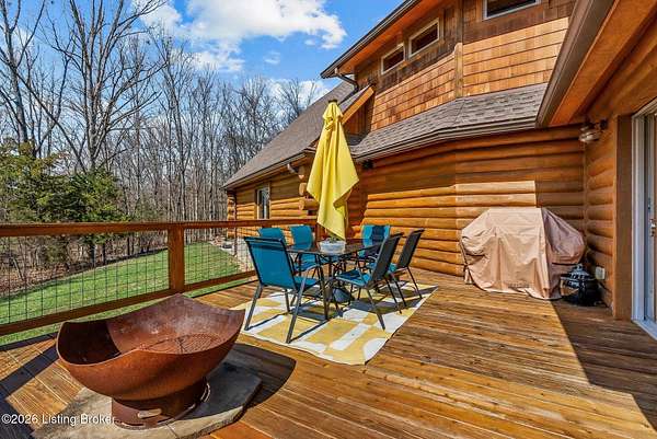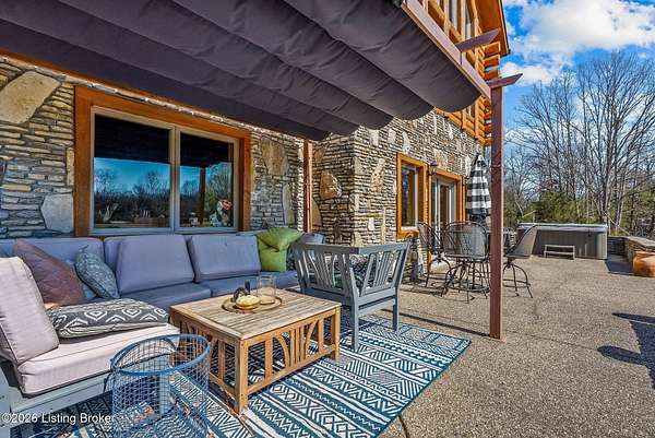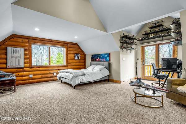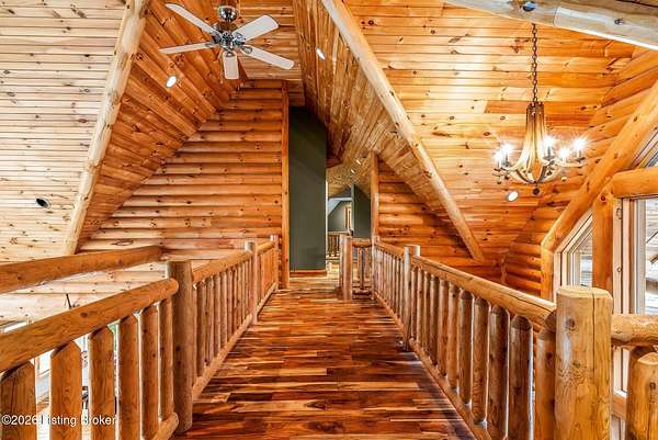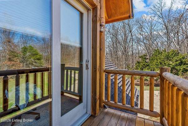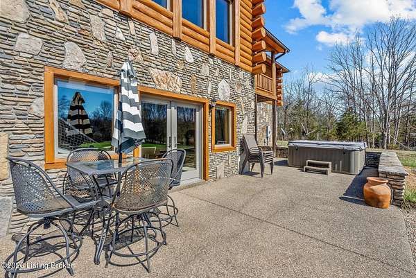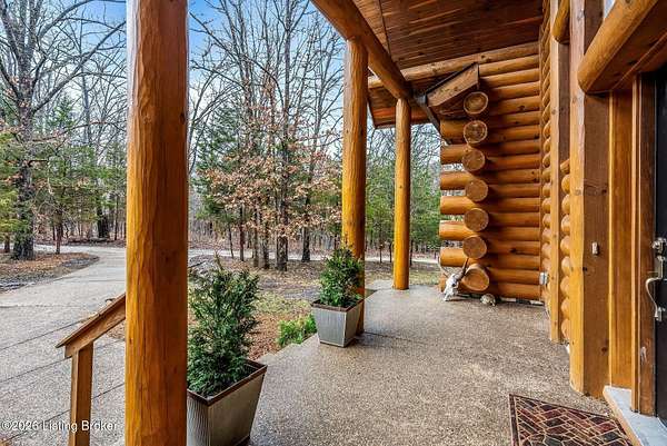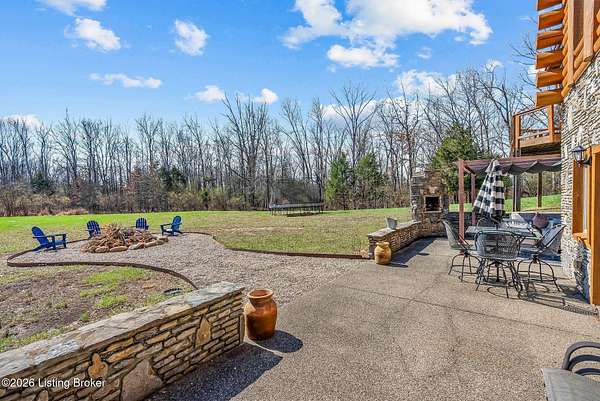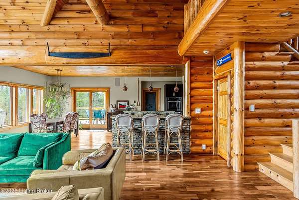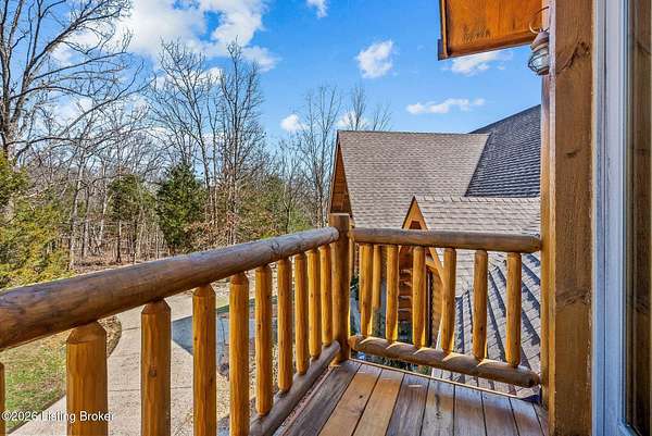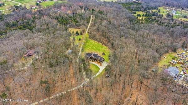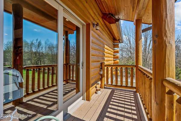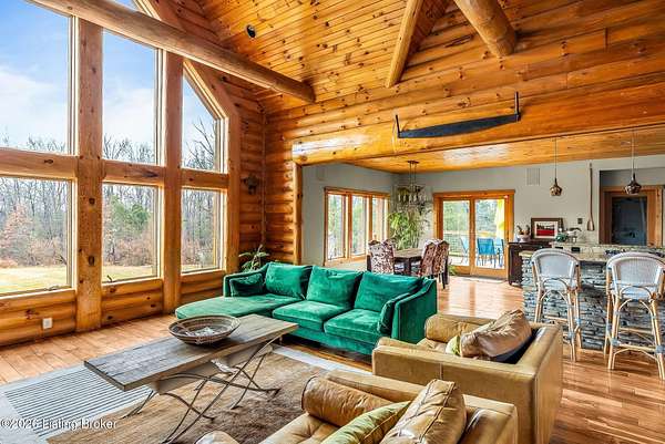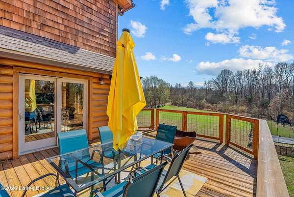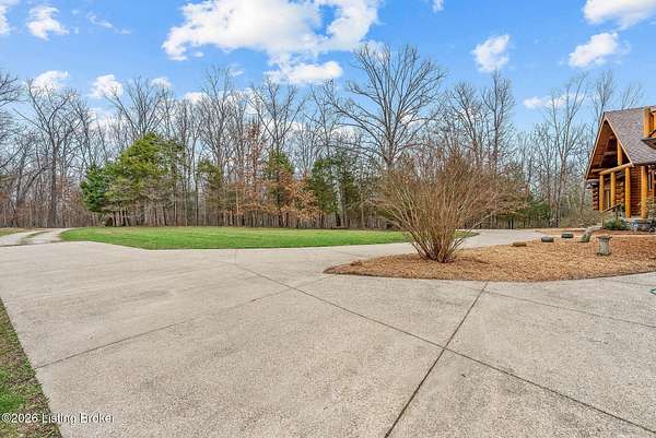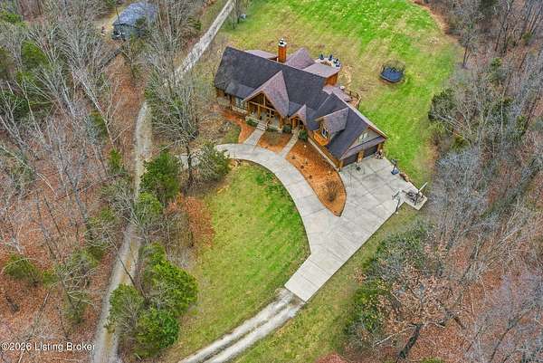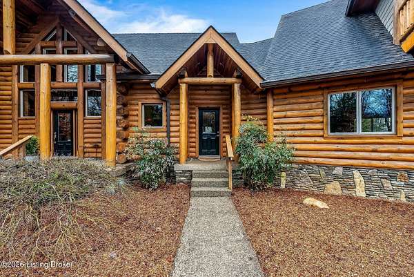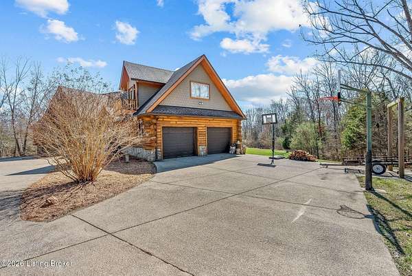 Welcome to 2212 Ballard School Rd in LaGrange, a spectacular custom-built log estate set on 16 private acres with breathtaking views of woods and pasture in every direction. Tucked 1/4 mile off the main road, this property offers exceptional privacy while still being just minutes from LaGrange shopping, dining, and I-71. Step inside to a breathtaking great room defined by a dramatic 2.5-story vaulted ceiling and an expansive A-frame wall of windows that fills the space with sunlight and captures sweeping views of the peaceful surroundings. Extraordinary, handcrafted stone masonry anchors the room with a beautiful fireplace and continues throughout both the interior and exterior of the home, highlighting the craftsmanship of this one-of-a-kind property. Acacia wood floors run through the entry, great room, kitchen, and primary suite, adding warmth and character. The first-floor primary suite offers a relaxing retreat with a trey ceiling, sitting area, dual walk-in closets, and private deck overlooking the rear property. The spacious bath includes dual vanity, large tub and walk in shower creating a comfortable and functional layout. Designed for everyday living and entertaining, the kitchen opens to the dining and living areas and includes an oversized pantry, mudroom, and convenient laundry access with direct entry to the oversized two-car garage. Built-in speakers enhance both the kitchen and outdoor deck spaces. Off the dining area, a large deck provides the perfect setting for enjoying the surrounding countryside. Upstairs, you'll find four generously sized bedrooms, including one with a private balcony overlooking the front of the property and another with an en-suite bath. The upper level also features a loft and an additional full bathroom. The finished walkout lower level offers additional living and entertaining space, featuring a bar area and a beautifully crafted hearth with a wood stove, along with doors that open to the rear patio and outdoor gathering area. An additional 1,600+ square feet of unfinished basement provide excellent expansion potential, including two framed and electrically wired rooms ready to be finished and plumbing already installed for a future basement bathroom. Outdoor living is equally impressive with five patios and decks, including the private primary suite balcony. The property also features an outdoor firepit, stone pizza oven, outdoor grilling area, deer stands, dog kennels, and even an ATV included with the property, making the acreage a true outdoor playground. Recent improvements include newly stripped and resealed logs along the rear of the home and rebuilt balcony railings. The home is also equipped with dual geothermal heat pump systems and a whole-house Culligan water filtration system with separate drinking water filtration including a new water heater (2025). With 16 acres of rolling land, partial woods, expansive views, and unmatched privacy, this extraordinary property offers the perfect blend of rustic elegance, modern efficiency, and convenient location. A rare opportunity to own this one-of-a-kind property that offers privacy, character, and incredible craftsmanship while still being conveniently located near LaGrange amenities.