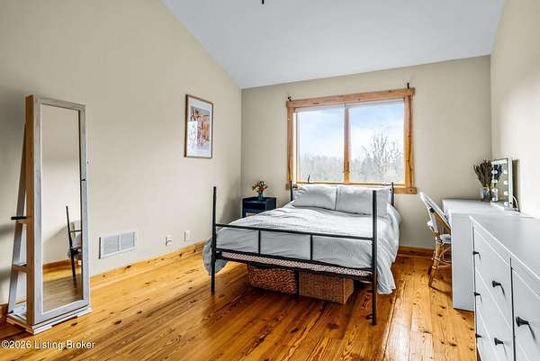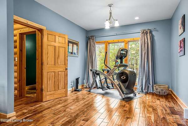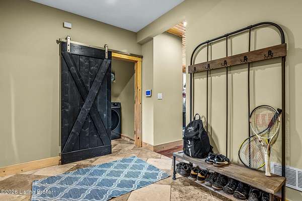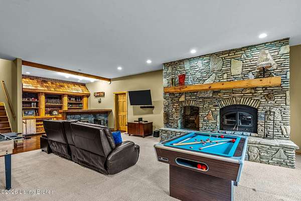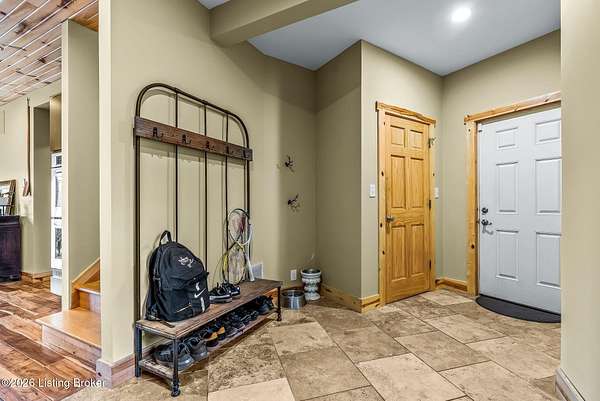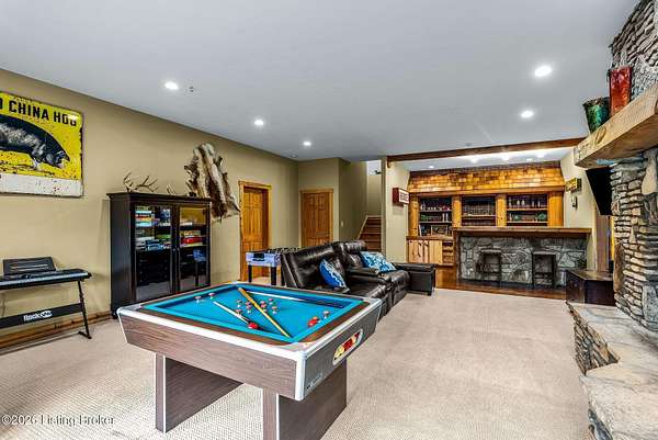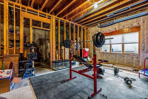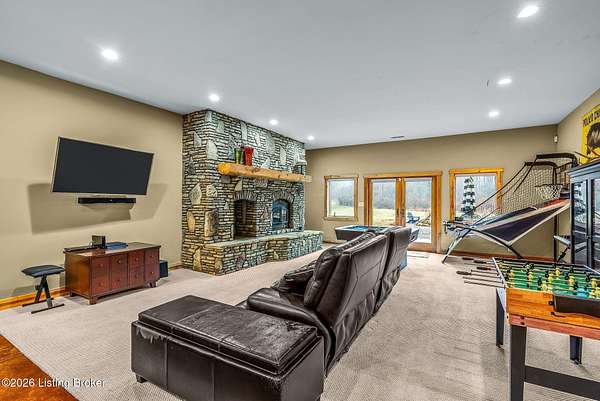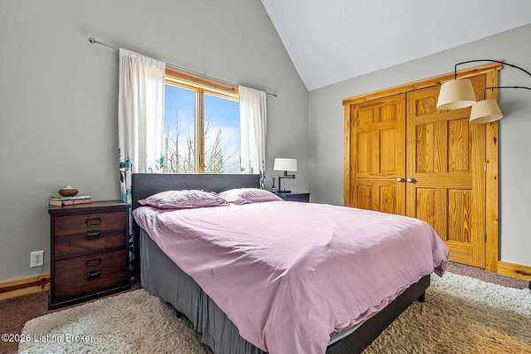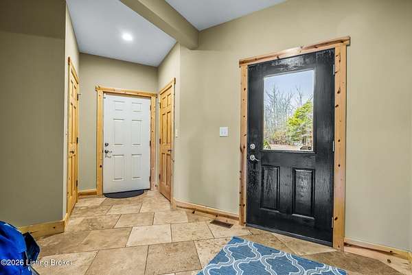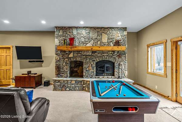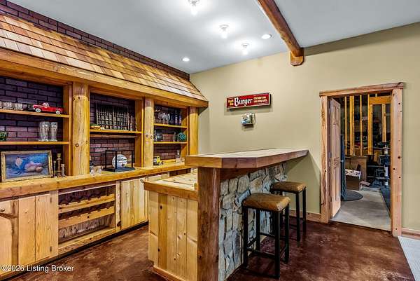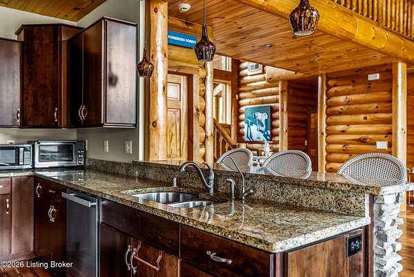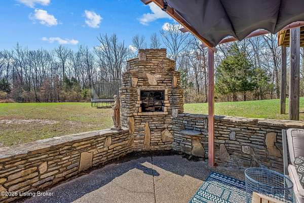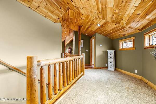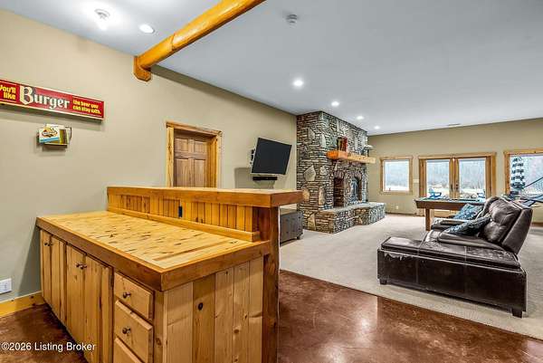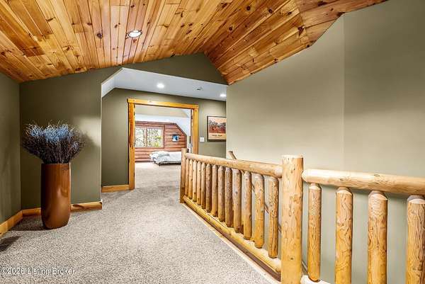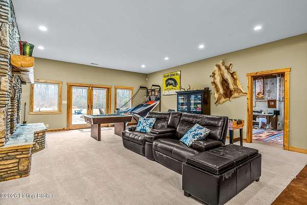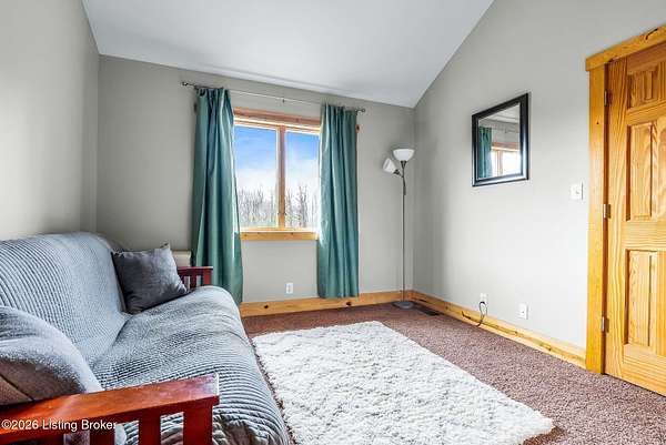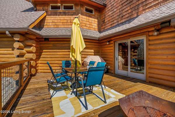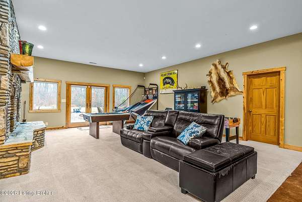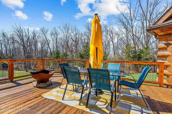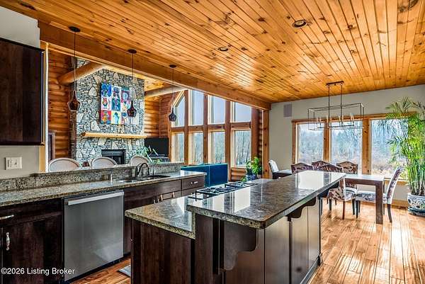 Welcome to 2212 Ballard School Rd in LaGrange, a spectacular custom-built log estate set on 16 private acres with breathtaking views of woods and pasture in every direction. Tucked 1/4 mile off the main road, this property offers exceptional privacy while still being just minutes from LaGrange shopping, dining, and I-71. Step inside to a breathtaking great room defined by a dramatic 2.5-story vaulted ceiling and an expansive A-frame wall of windows that fills the space with sunlight and captures sweeping views of the peaceful surroundings. Extraordinary, handcrafted stone masonry anchors the room with a beautiful fireplace and continues throughout both the interior and exterior of the home, highlighting the craftsmanship of this one-of-a-kind property. Acacia wood floors run through the entry, great room, kitchen, and primary suite, adding warmth and character. The first-floor primary suite offers a relaxing retreat with a trey ceiling, sitting area, dual walk-in closets, and private deck overlooking the rear property. The spacious bath includes dual vanity, large tub and walk in shower creating a comfortable and functional layout. Designed for everyday living and entertaining, the kitchen opens to the dining and living areas and includes an oversized pantry, mudroom, and convenient laundry access with direct entry to the oversized two-car garage. Built-in speakers enhance both the kitchen and outdoor deck spaces. Off the dining area, a large deck provides the perfect setting for enjoying the surrounding countryside. Upstairs, you'll find four generously sized bedrooms, including one with a private balcony overlooking the front of the property and another with an en-suite bath. The upper level also features a loft and an additional full bathroom. The finished walkout lower level offers additional living and entertaining space, featuring a bar area and a beautifully crafted hearth with a wood stove, along with doors that open to the rear patio and outdoor gathering area. An additional 1,600+ square feet of unfinished basement provide excellent expansion potential, including two framed and electrically wired rooms ready to be finished and plumbing already installed for a future basement bathroom. Outdoor living is equally impressive with five patios and decks, including the private primary suite balcony. The property also features an outdoor firepit, stone pizza oven, outdoor grilling area, deer stands, dog kennels, and even an ATV included with the property, making the acreage a true outdoor playground. Recent improvements include newly stripped and resealed logs along the rear of the home and rebuilt balcony railings. The home is also equipped with dual geothermal heat pump systems and a whole-house Culligan water filtration system with separate drinking water filtration including a new water heater (2025). With 16 acres of rolling land, partial woods, expansive views, and unmatched privacy, this extraordinary property offers the perfect blend of rustic elegance, modern efficiency, and convenient location. A rare opportunity to own this one-of-a-kind property that offers privacy, character, and incredible craftsmanship while still being conveniently located near LaGrange amenities.