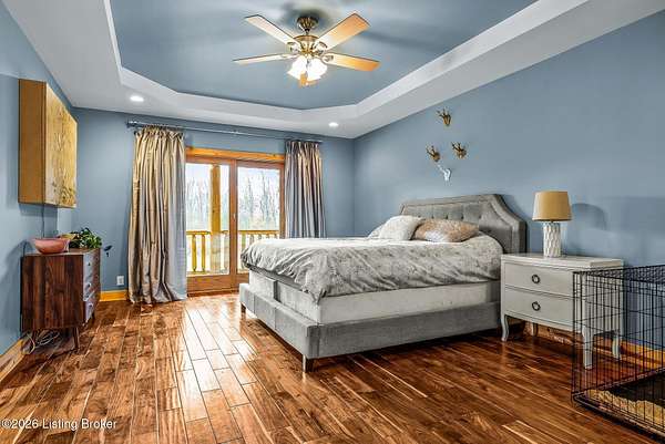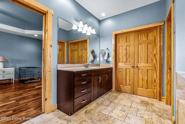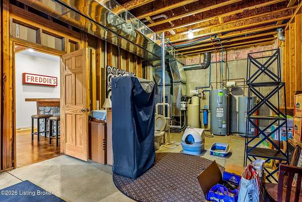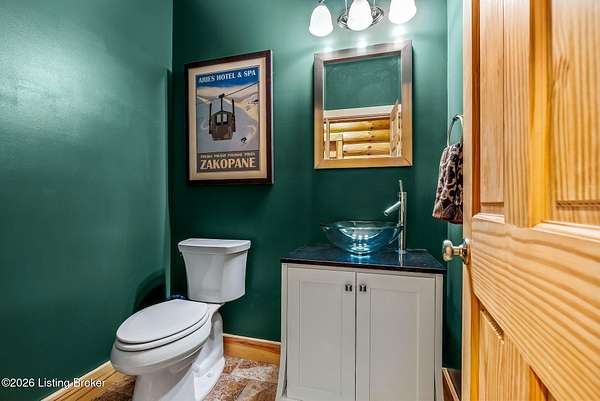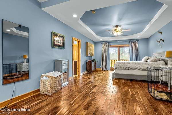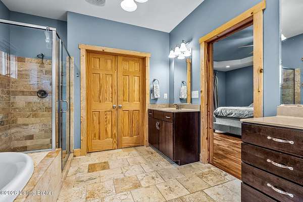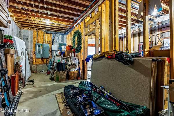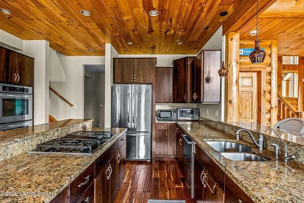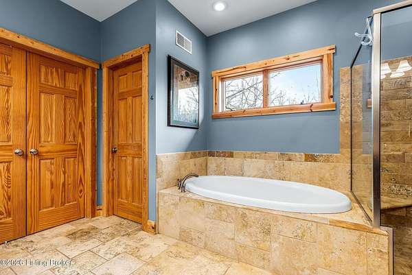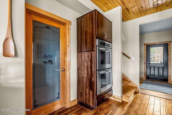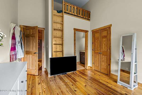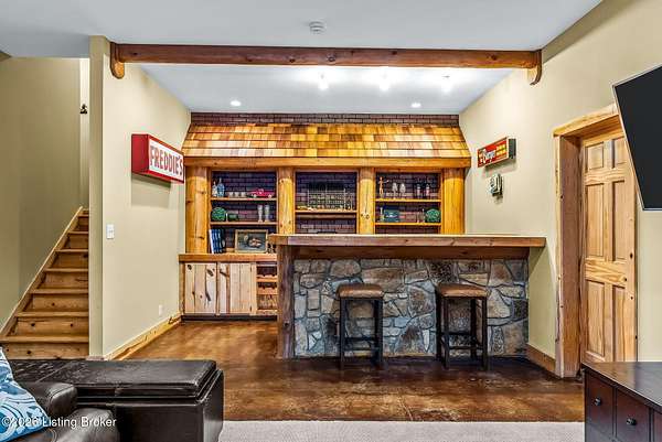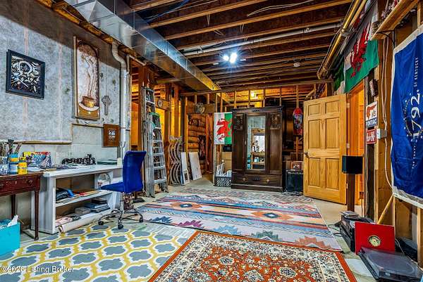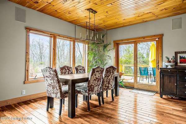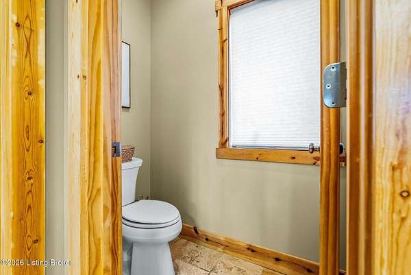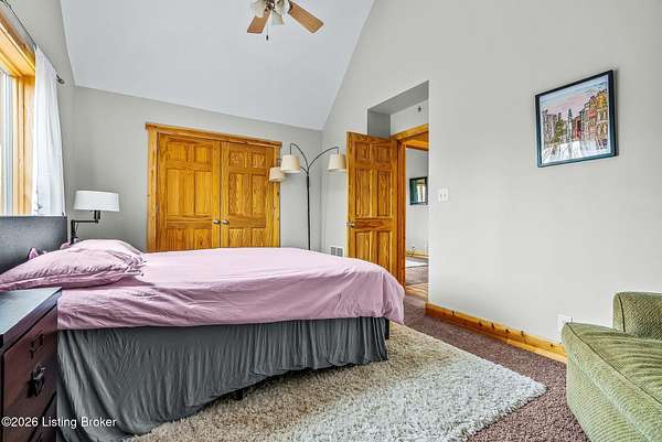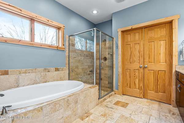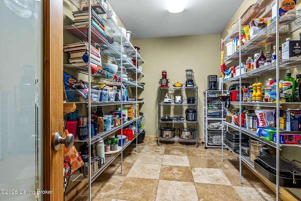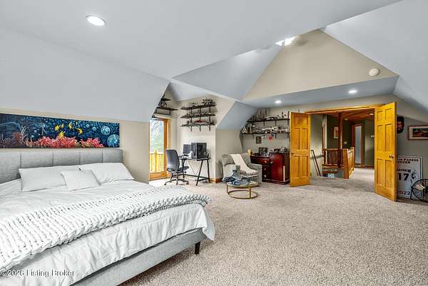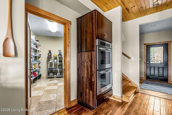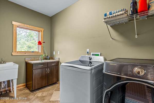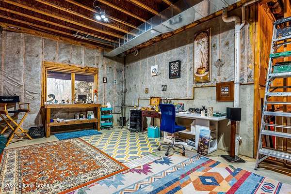 Welcome to 2212 Ballard School Rd in LaGrange, a spectacular custom-built log estate set on 16 private acres with breathtaking views of woods and pasture in every direction. Tucked 1/4 mile off the main road, this property offers exceptional privacy while still being just minutes from LaGrange shopping, dining, and I-71. Step inside to a breathtaking great room defined by a dramatic 2.5-story vaulted ceiling and an expansive A-frame wall of windows that fills the space with sunlight and captures sweeping views of the peaceful surroundings. Extraordinary, handcrafted stone masonry anchors the room with a beautiful fireplace and continues throughout both the interior and exterior of the home, highlighting the craftsmanship of this one-of-a-kind property. Acacia wood floors run through the entry, great room, kitchen, and primary suite, adding warmth and character. The first-floor primary suite offers a relaxing retreat with a trey ceiling, sitting area, dual walk-in closets, and private deck overlooking the rear property. The spacious bath includes dual vanity, large tub and walk in shower creating a comfortable and functional layout. Designed for everyday living and entertaining, the kitchen opens to the dining and living areas and includes an oversized pantry, mudroom, and convenient laundry access with direct entry to the oversized two-car garage. Built-in speakers enhance both the kitchen and outdoor deck spaces. Off the dining area, a large deck provides the perfect setting for enjoying the surrounding countryside. Upstairs, you'll find four generously sized bedrooms, including one with a private balcony overlooking the front of the property and another with an en-suite bath. The upper level also features a loft and an additional full bathroom. The finished walkout lower level offers additional living and entertaining space, featuring a bar area and a beautifully crafted hearth with a wood stove, along with doors that open to the rear patio and outdoor gathering area. An additional 1,600+ square feet of unfinished basement provide excellent expansion potential, including two framed and electrically wired rooms ready to be finished and plumbing already installed for a future basement bathroom. Outdoor living is equally impressive with five patios and decks, including the private primary suite balcony. The property also features an outdoor firepit, stone pizza oven, outdoor grilling area, deer stands, dog kennels, and even an ATV included with the property, making the acreage a true outdoor playground. Recent improvements include newly stripped and resealed logs along the rear of the home and rebuilt balcony railings. The home is also equipped with dual geothermal heat pump systems and a whole-house Culligan water filtration system with separate drinking water filtration including a new water heater (2025). With 16 acres of rolling land, partial woods, expansive views, and unmatched privacy, this extraordinary property offers the perfect blend of rustic elegance, modern efficiency, and convenient location. A rare opportunity to own this one-of-a-kind property that offers privacy, character, and incredible craftsmanship while still being conveniently located near LaGrange amenities.