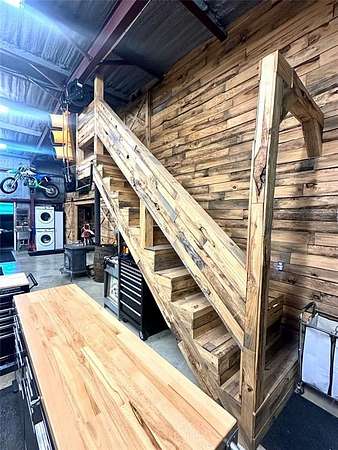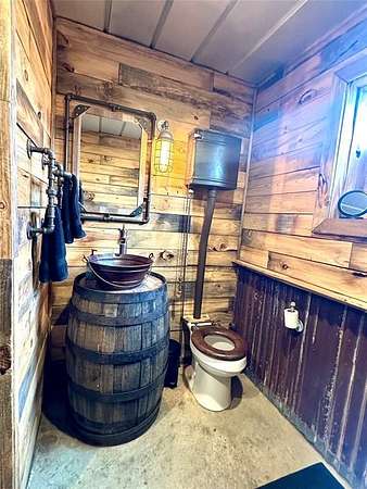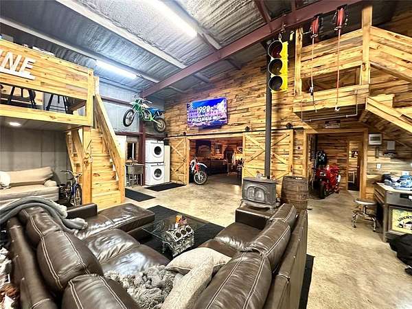 To a luxury rustic apartment. Creatively is an understatement, Whiskey Barrel sink Copper pull chain toilet, stainless kitchen island toolbox, Even an 80s theme Loft Bar complete with a Vintage Pac-Man machine, A gigantic wraparound couch, big enough for all your friends to put your feet on the engine block coffee table. Sitting right next to the cast-iron potbelly stove. There is so much more to see here that I cant begin to describe. The most amazing discovery is that it all works so extremely well together