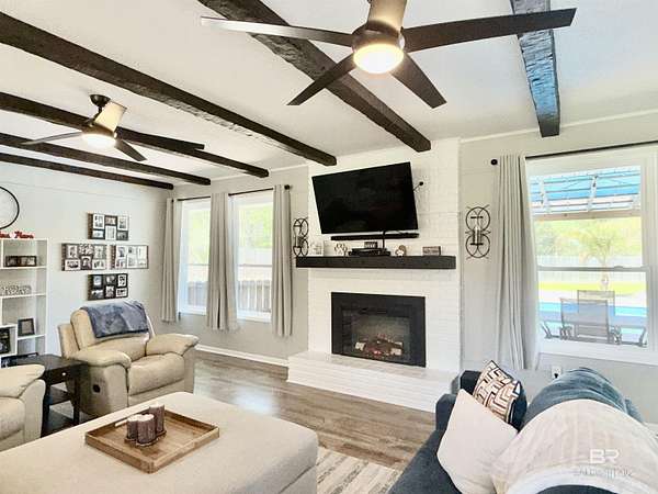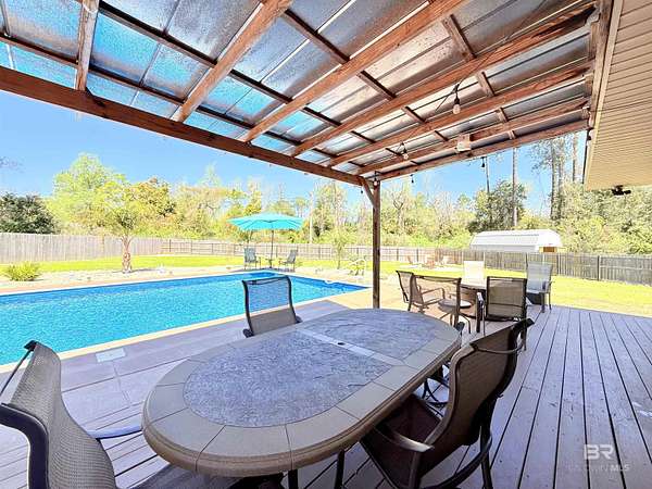 Tucked at the end of a cul de sac, is a move-in ready contemporary home offering a rare blend of privacy, thoughtful upgrades, and a true park-like setting on just over 1.5 acres. From the moment you arrive, stunning stained glass French doors set the tone for the character and warmth found here. Recent improvements include a 2021 FORTIFIED ROOF, 2022 HVAC system, added INSULATION, continuous FLOORING, HIGH END IMPACT-RESISTANT WINDOWS, fully renovated bathrooms, updated lighting, GUTTERS, fresh PAINT and a GENERATOR QUICK CONNECT, and more.Inside, the spacious living room feels both open and inviting, featuring exposed beam ceilings, and electric fireplace. Throughout the home, oversized windows frame peaceful, park-like scenery views from your own meticulously landscaped yard!Wide open doorways, lead to the kitchen/dining areas. Perfectly, updated kitchen is both functional and well-appointed with abundant cabinetry, solid surface countertops, stainless steel appliances, a farmhouse sink, wrap around breakfast bar, and double pantry. Flexible dining spaces offer versatility, including an ideal home office option with those pool and/or park like views.The primary suite offers room for a sitting area, a large walk-in closet, and a bathroom with ample storage. Two additional bedrooms are generously sized, with ample closet space.Step outside to your own backyard oasis featuring a 40 x 20 saltwater pool, hot tub, and over 13,000 sq feet of fenced area with space for fur babies to roam. The covered porch and extended deck provide ideal spaces for relaxing, dining, or entertaining while enjoying gorgeous sunsets or a just quiet morning.Additional features include a pristine, finished side-entry garage, versatile mudroom, and a 20 ft storage shed with loft. Termite bond with Arrow transferable. Shopping, walking trails and schools nearby while tucked away between the 2 roadways paving the pathway from the interstate to the beautiful sugar Buyer to verify all informatio