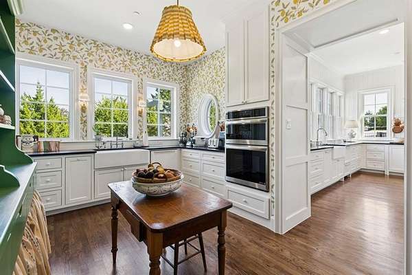 Step inside to discover a home that's both breathtaking and functional. At its heart lies a marble-topped kitchen island, illuminated by a wall of windows overlooking mature trees and impeccable landscaping. The kitchen showcases professional grade appliances- an ILVE 8-burner gas range, GE Monogram paneled refrigerator and freezer, dual dishwasher drawers, and abundant custom cabinetry.The prep kitchen enhances the space with additional storage, a second dishwasher, wall oven, and instant hot and cold filtered water system.