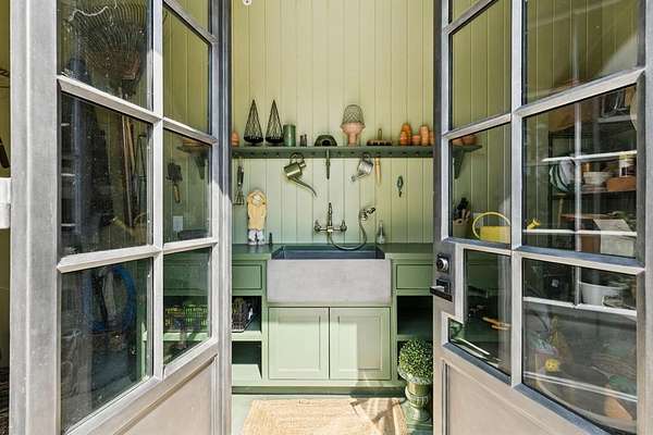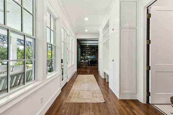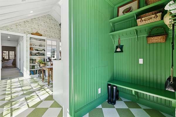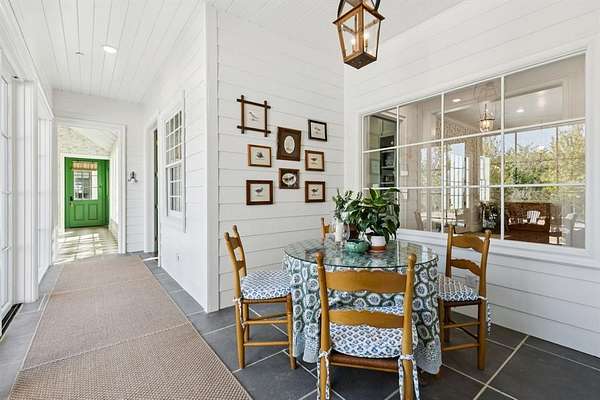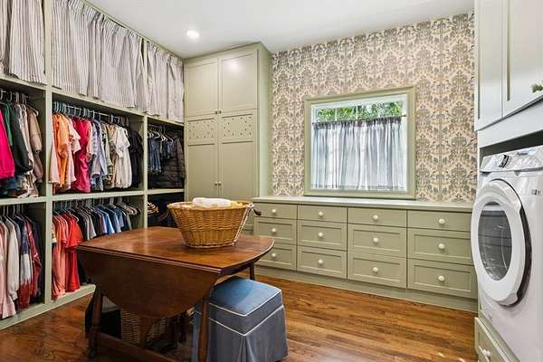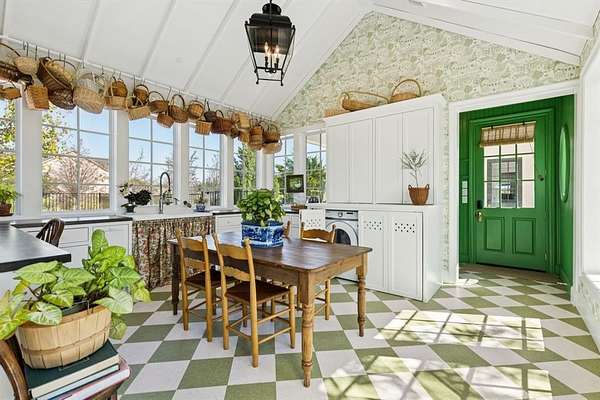 The open layout flows effortlessly into the breakfast and sunroom, where PA bluestone tile and Sierra Pacific windows flood the space with natural light. The main laundry room feels like a page from BHG magazine,featuring elegant cabinetry,a Kohler Farmstead sink, shiplap walls, and beamed ceiling.