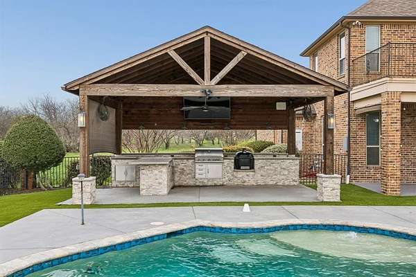 Step outside and discover a true backyard oasis. The resort-style setting features a sparkling pool and hot tub, all surrounded by a wrought iron fence and lush privacy shrubs that create a peaceful retreat. The outdoor living space was designed with entertaining in mind, complete with a new pergola, mounted TV, and built-in BBQ grilling area, perfect for hosting unforgettable gatherings or enjoying quiet evenings under the Texas sky.
