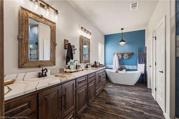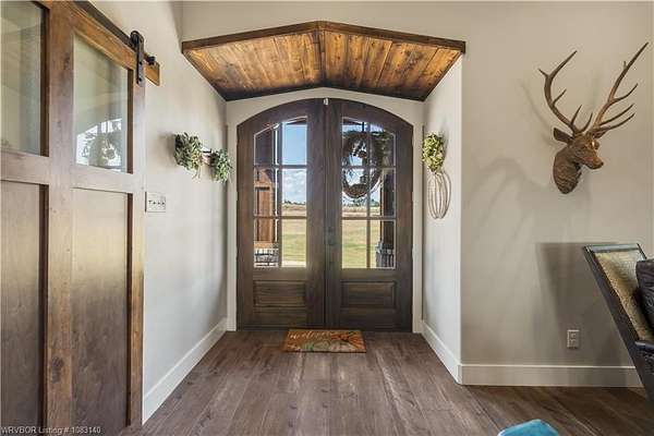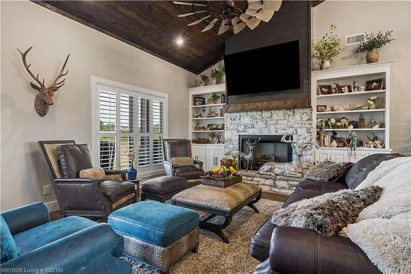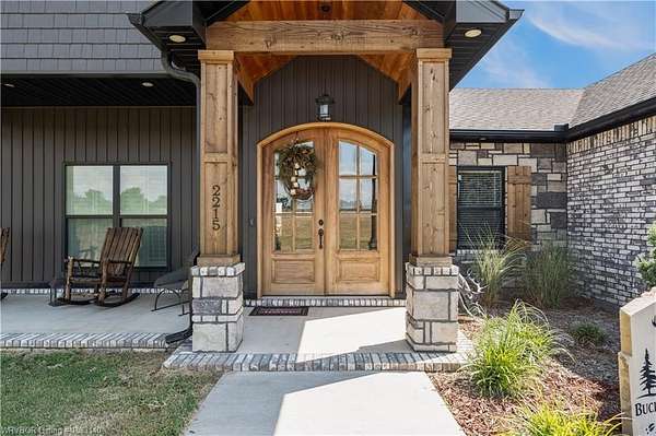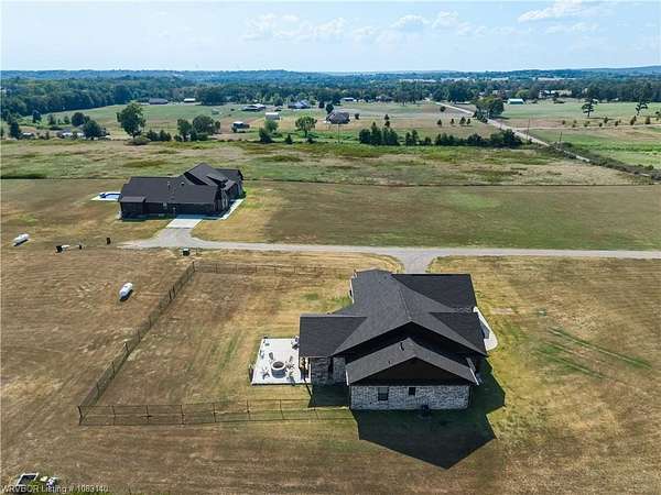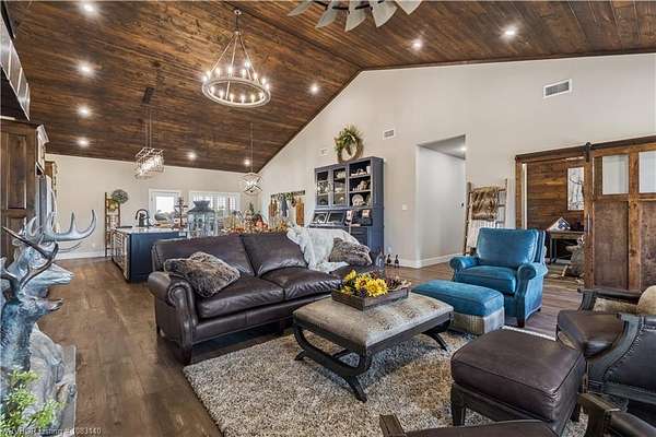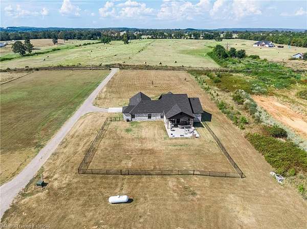 This home seamlessly combines rustic charm with contemporary comforts for a welcoming and cozy lifestyle. The property features 2 acres with a smaller fenced area in the backyard. The outdoor living has a covered porch with a propane fireplace and a patio with a wood fire pit. The heart of this home is a spacious open-concept living area that includes the living room, dining room, and a eat-in kitchen all sitting under a soaring ship-lap cathedral ceiling. The kitchen boasts of a chef-ready propane gas range and ample storage space, while the custom cabinetry and sleek countertops offer a perfect blend of style and functionality. Custom blinds throughout and living room and dining room have plantation shutters. The master suite has a shiplap ceiling, a private en-suite bathroom, huge shower, soaking tub, walk-in closet and a hidden saferoom/storm shelter. The counter tops throughout are quartz-Cambria designed for both beauty and durability. The personalized lighting adds the finishing touch! Don't miss this opportunity to own a unique and inviting home where every detail tells the story.