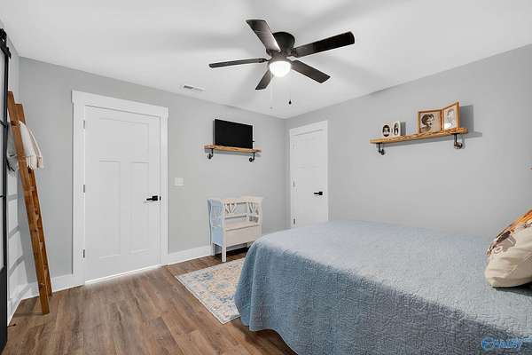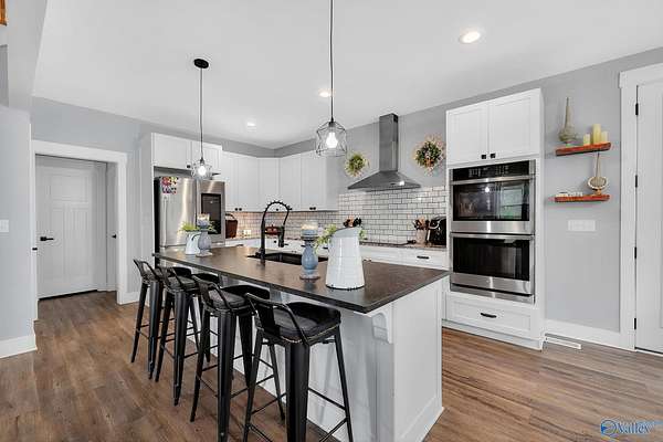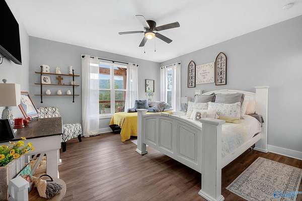 This newer 2023 craftsman-style home offers breathtaking views of Lake Guntersville and the surrounding mountains. Featuring 3 spacious master suites, each with its own tile shower and walk-in closet, plus an additional half bath, this home is designed for comfort and privacy. The open layout highlights LVP flooring, a cozy electric fireplace, and a gourmet kitchen with granite countertops and WiFi-controlled smart appliances. Step outside to relax in the hot tub on the side patio or unwind on the large covered front porch overlooking the lake. Built with Hardiboard siding and an encapsulated crawlspace for efficiency, it also includes a 40x30 detached garage with workshop space.