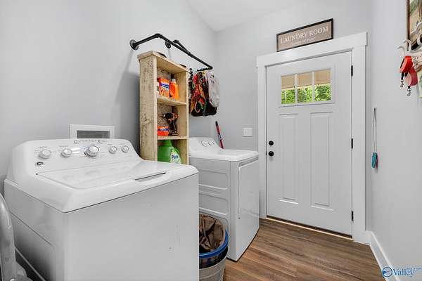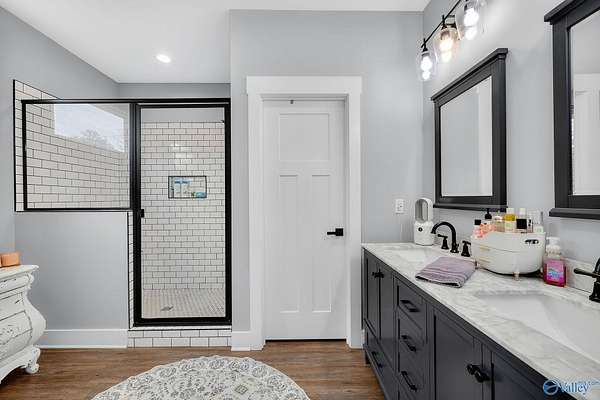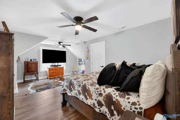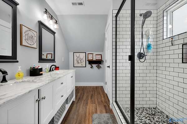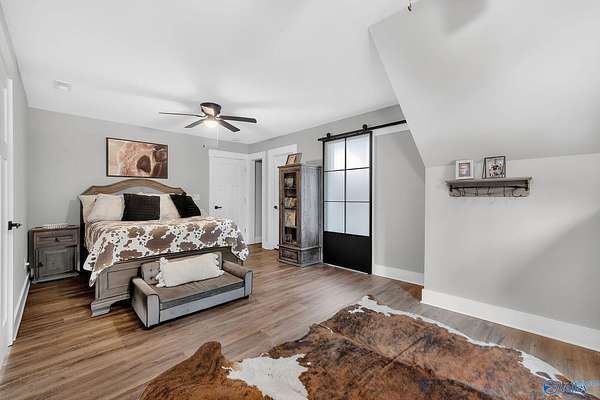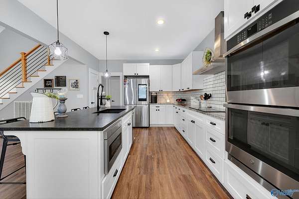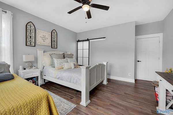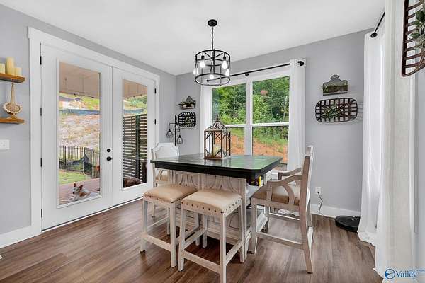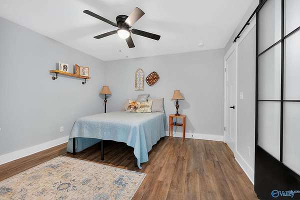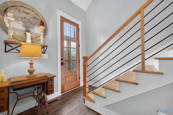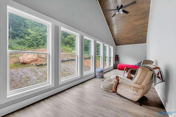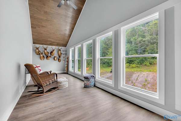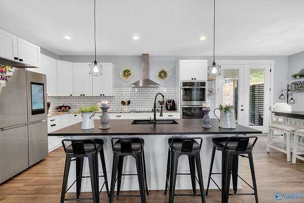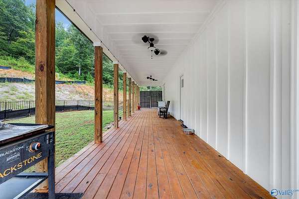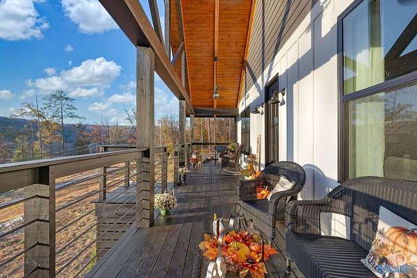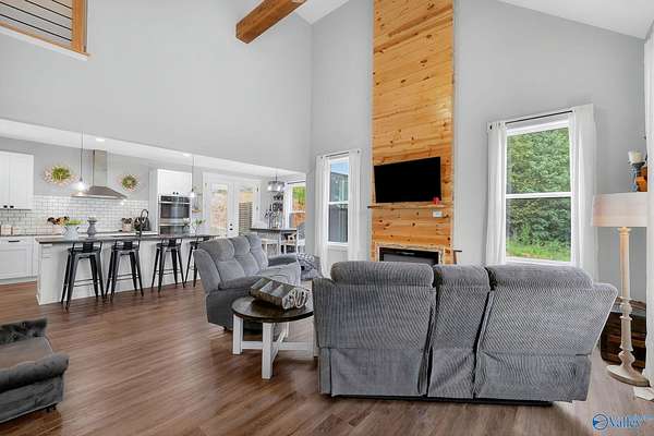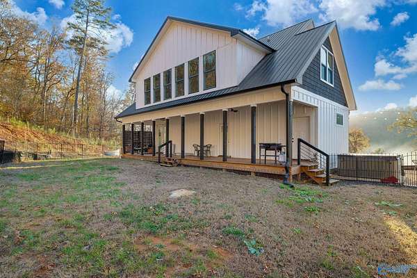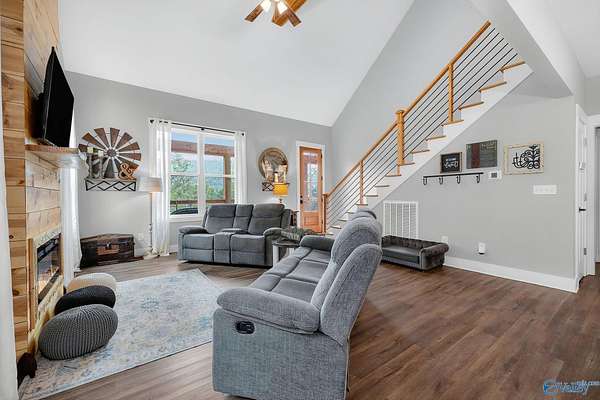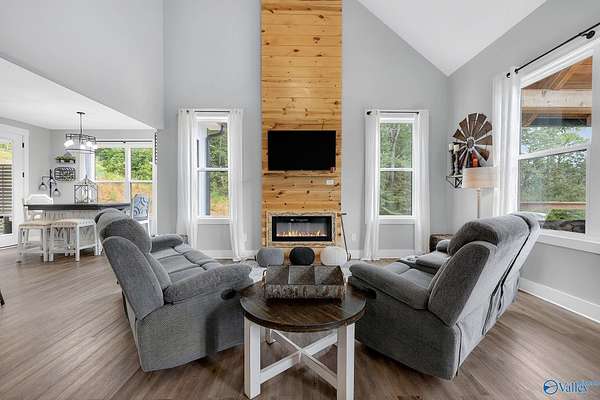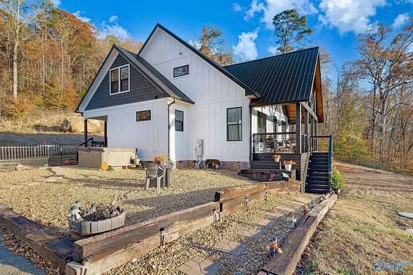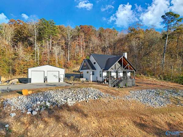 This newer 2023 craftsman style home offers breathtaking views of Lake Guntersville and the surrounding mountains. Featuring three spacious master suites, each with its own tile shower and walk in closet, plus an additional half bath, the home is designed for comfort and privacy. The open layout showcases LVP flooring, a cozy electric fireplace, and a gourmet kitchen with granite countertops and WiFi controlled smart appliances. Step outside to relax in the hot tub on the side patio or unwind on the large covered front porch overlooking the lake. Built with Hardiboard siding and an encapsulated crawlspace for efficiency, the property also includes a 40x30 detached garage with workshop space.