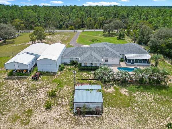 Where else can you find this much space, flexibility, and value in Rainbow Lakes Estates? With approximately 3,600 sq. ft. of combined living space between the main home and guest house plus a 4,000+ sq. ft. workshop, this multi-structure retreat is truly unmatched at this price. Set on 2.48 fully fenced acres, the property delivers room to live, work, create, and entertain with NO HOA. The beautifully maintained 2,600 sq. ft. main home features an open layout with abundant natural light, a cozy gas fireplace, and a spacious kitchen and dining area ideal for gatherings. The primary suite includes a walk-in closet and peaceful privacy, while two additional bedrooms gives versatility for guests, hobbies, or office needs. A detached 1,000 sq. ft. guest house adds tremendous flexibility with 2 bedrooms, 2.5 baths, a full kitchen, and a private enclosed patio--perfect for multi-generational living, extended visitors, or private workspace needs. Step outside and experience true Florida living: an in-ground pool, multiple covered parking pads, an RV garage, and the massive workshop featuring oversized bays, a lift, RV/boat storage, and an unfinished apartment ready for customization. With this amount of living space, storage, and multi-use potential, there is simply nothing comparable in Rainbow Lakes Estates at this price. Located just minutes from Dunnellon's shopping and dining, with nearby community parks, trails, and lakes for recreation. A rare find with space to live, grow, and create.