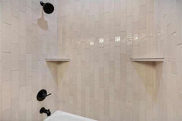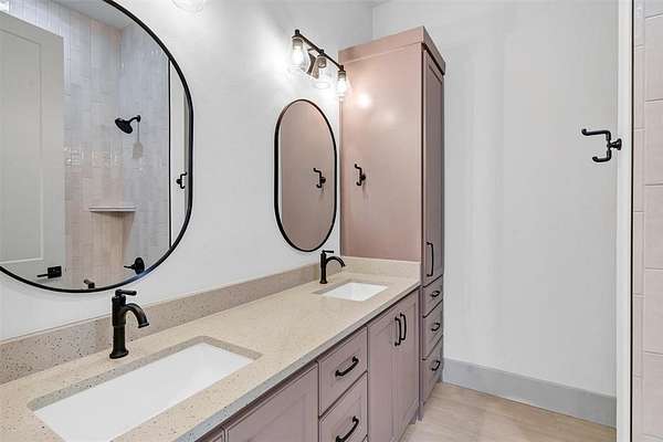 Inside, the living room is anchored by a gas fireplace with floor-to-ceiling tile surround and custom built-in cabinetry on both sides, creating a stunning focal point with warmth and symmetry. LVP flooring flows throughout the home, complemented by black plumbing and lighting fixtures that add a modern, cohesive look.