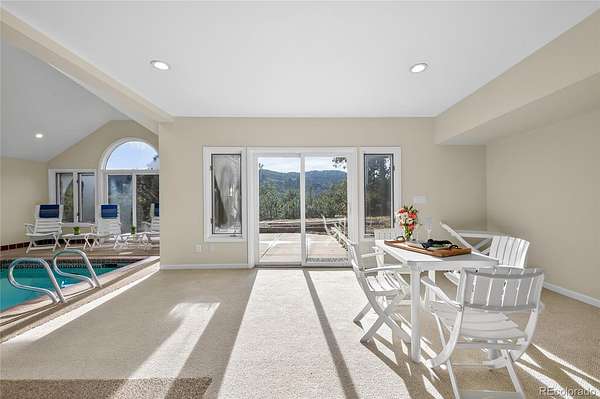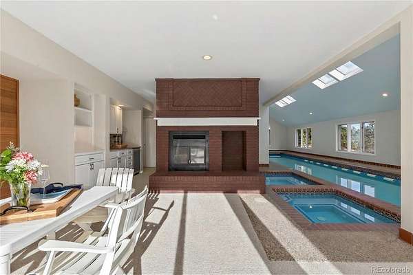 Set on 17 acres within a secluded mountain community, this fully remodeled home blends refined design with the beauty & recreation of Colorado’s foothills. Surrounded by trees & frequent wildlife visitors, the property offers exceptional privacy while just minutes from Evergreen and 25 minutes to Downtown Denver or the Tech Center. Step Inside, a grand entry opens to a main level designed for everyday living & gatherings. The chef's kitchen & dining areas flow together & connect to a living room anchored by a floor-to-ceiling double-sided brick fireplace. The kitchen features SS appliances, granite counters and lots of cabinets. Large windows fill the home w/light, complemented by elegant fixtures. The main level includes a sunroom, laundry room w/ storage, powder room, & a primary suite w/ a spa-like five-piece bath. Upstairs offers a loft area, 3 additional beds, & a full bath. The walk-out basement is designed for entertaining w/ a wet bar & bar fridge, an indoor pool, kiddie pool, & hot tub area perfect for year-round fun! The lower level also features a brick fireplace, two bedrooms, & two full bathrooms. You are sure to be delighted by the grandeur, livability & mountain charm! Convenient access to Hwy 285 for an easy drive to Denver. A circular driveway leads to the residence & a three-car garage. Smart locks on the front, garage, & pool entry provide modern convenience. The property has both public water & a well, which supplies the pool & hot tub & includes large reserves for added peace of mind. Outdoor living is a highlight with a welcoming covered front porch, three expansive decks, & a multi-level cascading water feature. The grounds also include a private tennis court, basketball court, & shuffleboard, creating an ideal setting for recreation & entertaining. Nearby Mt Falcon & Pence Park offer miles of hiking, biking, and horseback riding trails, while Red Rocks & countless parks are just a short drive away. Welcome HOME!