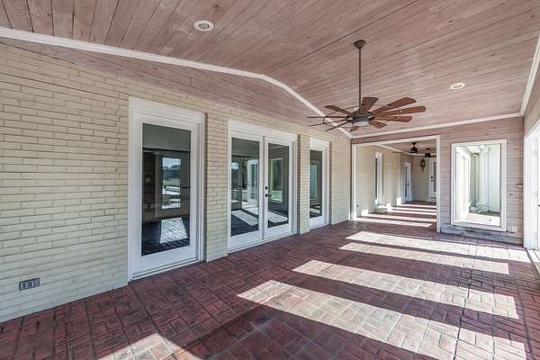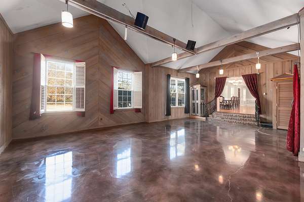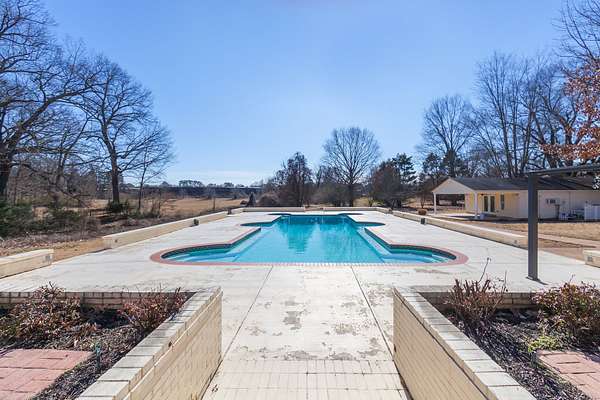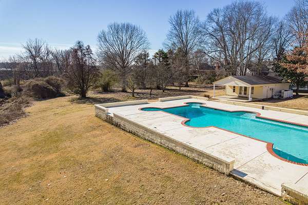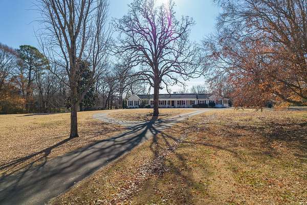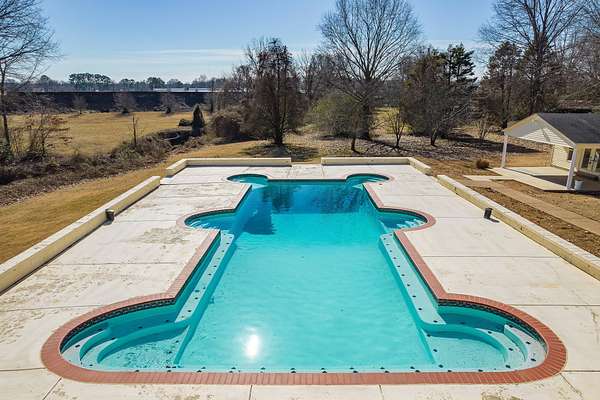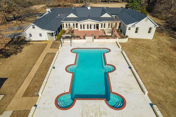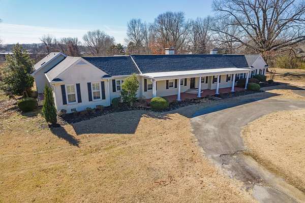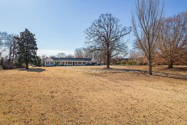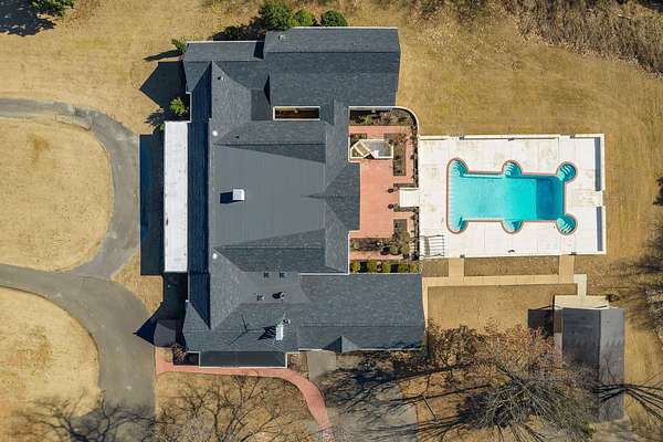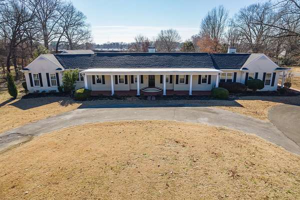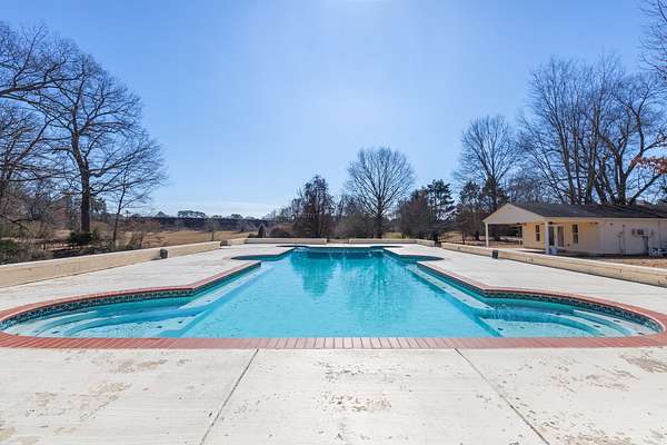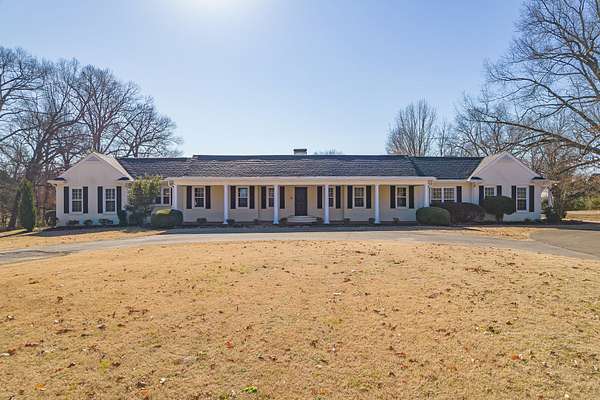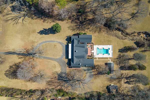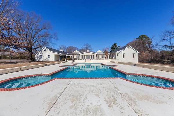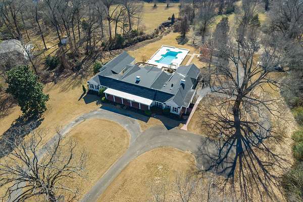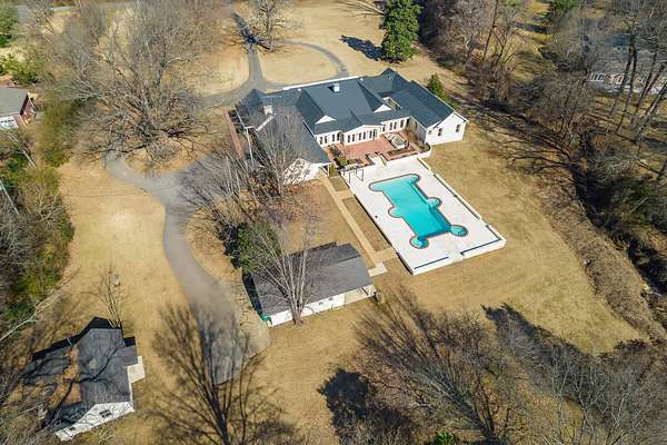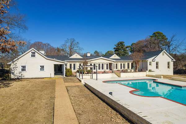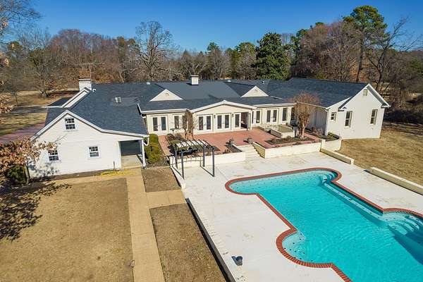 A grand circular driveway leads to this stately residence, where expansive porches and timeless charm create a welcoming first impression. The custom saltwater pool with CoolCrete-coated decking is a perfect oasis, complemented by a pool house with a spacious front porch. A three-car attached carport and detached garage/workshop with a sink offer ample parking and storage. Additional structures include a partially finished guest house, tractor shed, and expansive patio for outdoor gatherings.