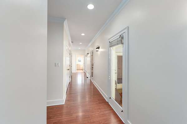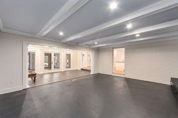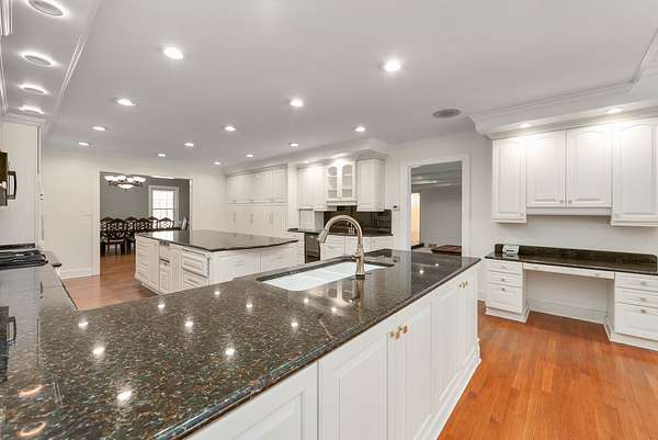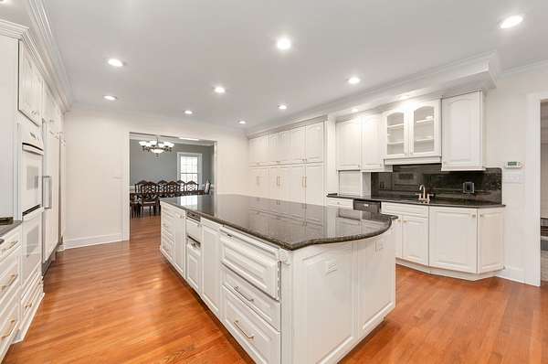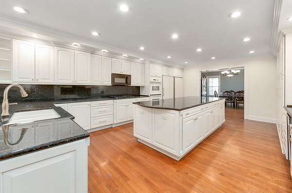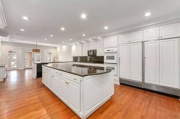 The chef's kitchen is a showstopper, boasting two Sub-Zero refrigerators, gas cooktop, double ovens, and an 11-foot island with storage. Three built-in pantries, granite countertops, a prep sink, appliance garage, workstation, and modern LED lighting complete the space.