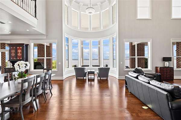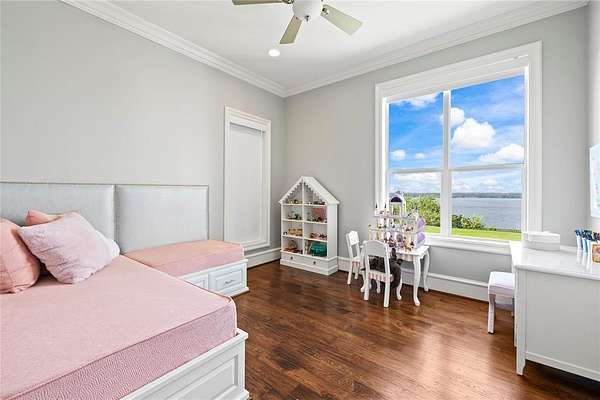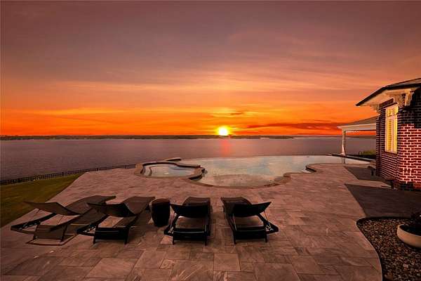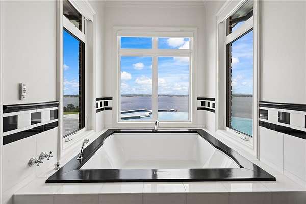 Wake to lake views from the first-floor primary suite, where expansive windows frame the infinity pool and shimmering water beyond. Two guest bedrooms and a game room also offer stunning lake vistas.