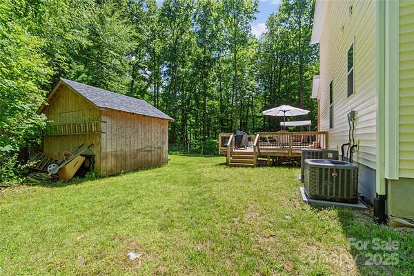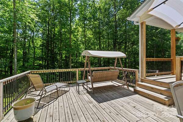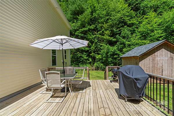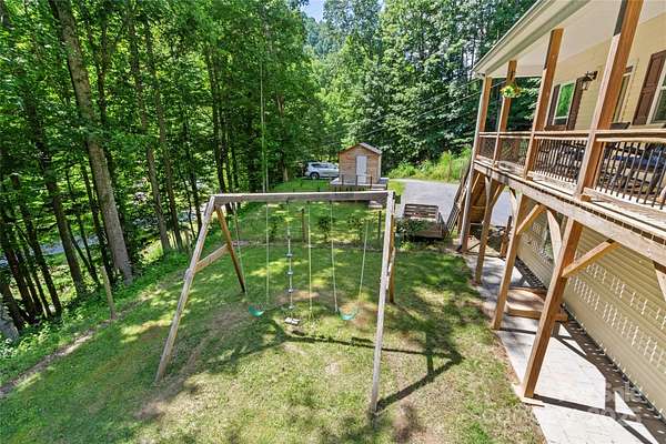 This well-maintained home is conveniently located near Weaverville, Mars Hill, and Burnsville. It features an upper driveway for easy kitchen access, a basement garage, and a storage shed. Basement has an unfinished room with exterior access that can be finished for a man cave or an office space with plenty of storage. All living area is on one floor and the guest rooms are on the upper level. The backyard is fenced for pets. Enjoy the sounds of the creek while you relax on the porch or back deck, and a play house out front. The home includes gutter guards. Property goes all the way to the mountain top and they had no damage from the Helene storm. Mostly furnished.