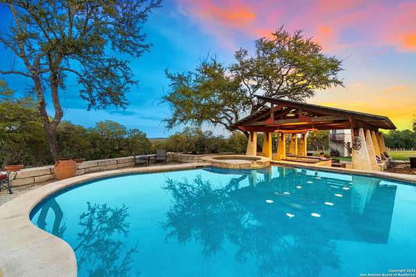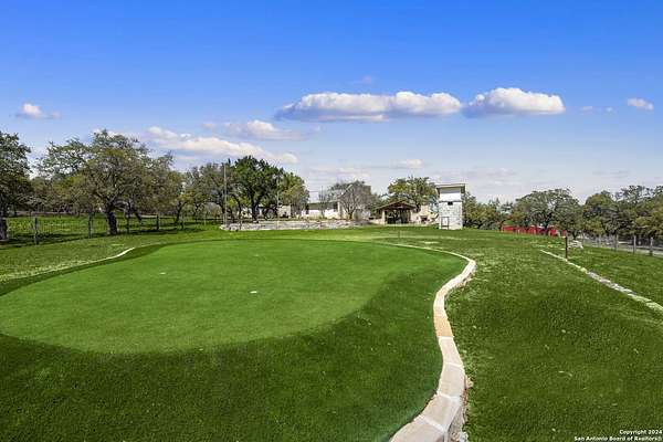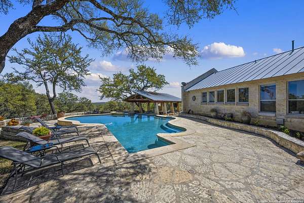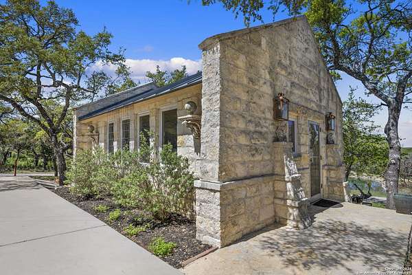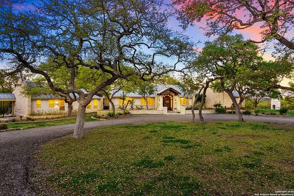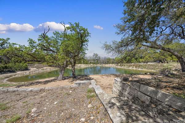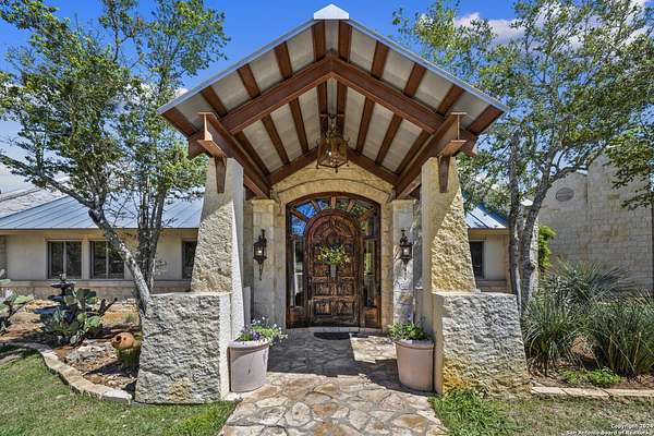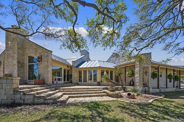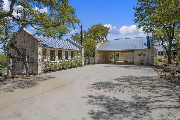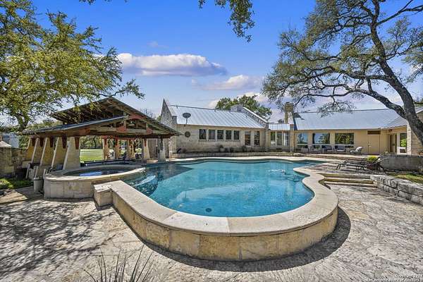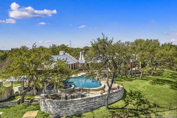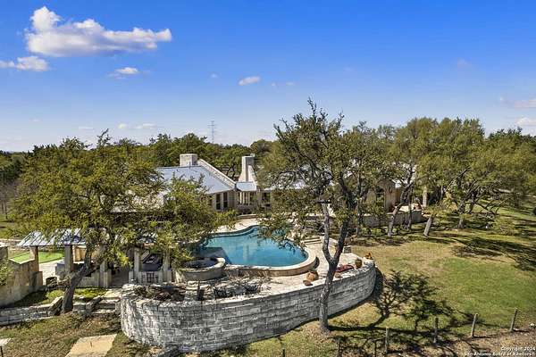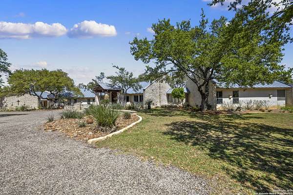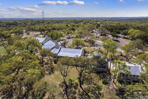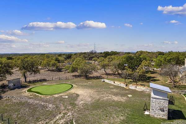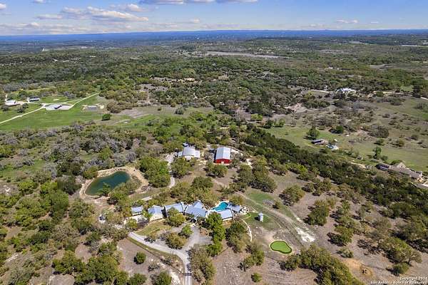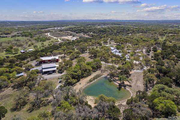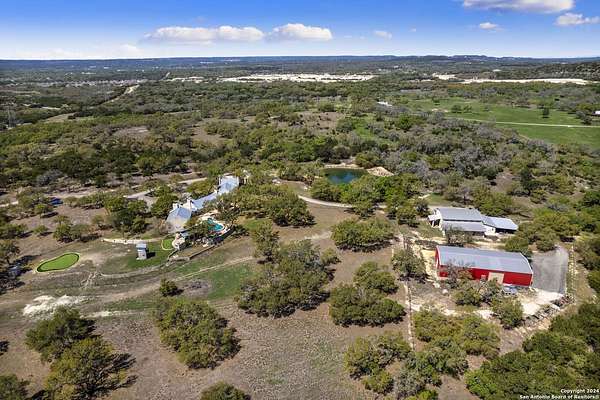 Just 3.7 miles from downtown Boerne, this 38.77-acre unrestricted Hill Country property offers privacy, versatility, and extensive amenities with wildlife exemption in place and located in Boerne ISD. The 4-bedroom, 3 bath ranch style home features stone and wood finishes, a chef's kitchen with upgraded appliances, two living areas with fireplaces, and a spacious primary suite with fireplace, soaking tub, walk in shower, and oversized closet. A detached 560 square foot casita with kitchenette and bath adds flexibility. Outdoor living includes a heated pool and spa, 5000 square foot limestone patio, and a fully equipped outdoor kitchen with gas stove, grill, and fireplace. A separate 7400 square foot building offers a 55 x 40 basketball gym, two guest apartments, a game room, and storage. Additional improvements include two lighted putting greens, a skeet range with automatic throwers, a stocked half acre fishing pond, and a 5200 square foot automotive workshop with paint booth, office, lifts, and roll up doors. Equestrian facilities include two horse barns, tack and feed room, cross fenced pastures, and an 88 x 200 roping arena. Rare acreage with significant improvements and close proximity to town.