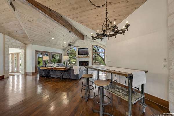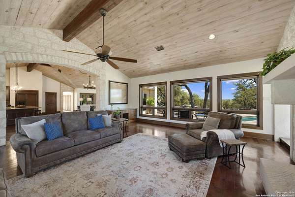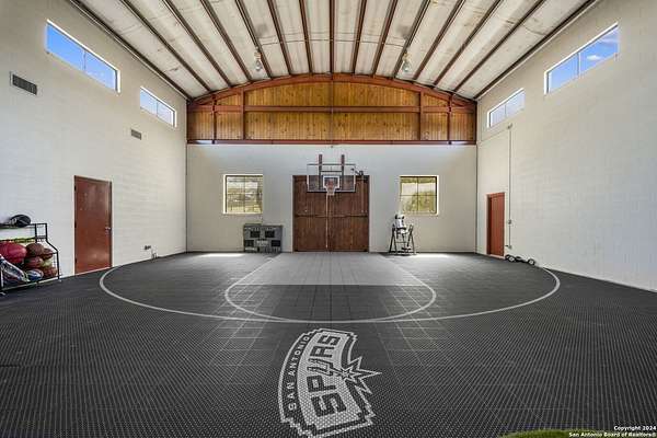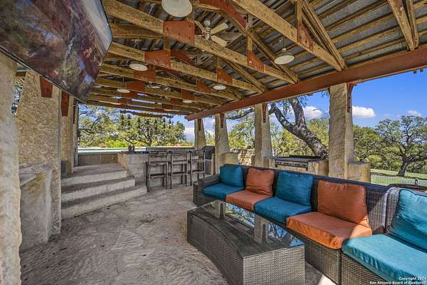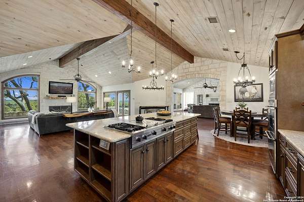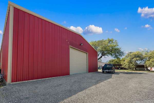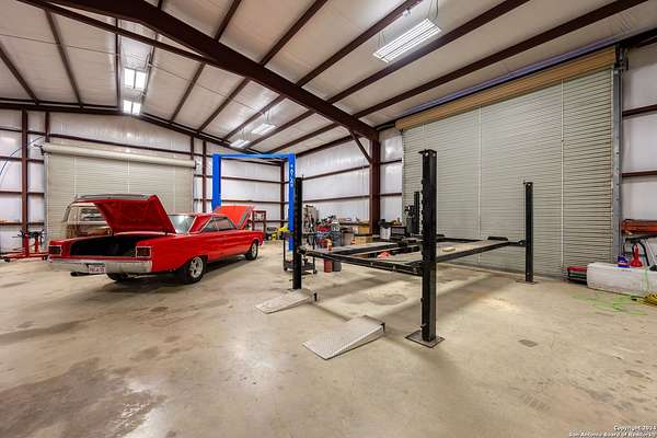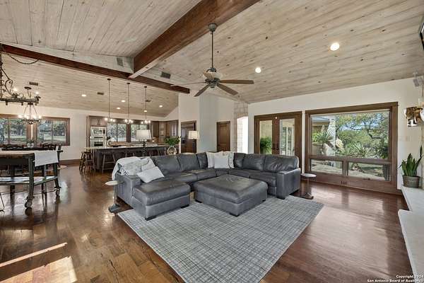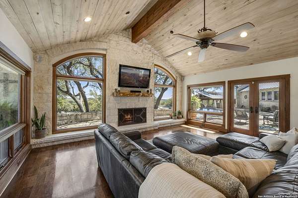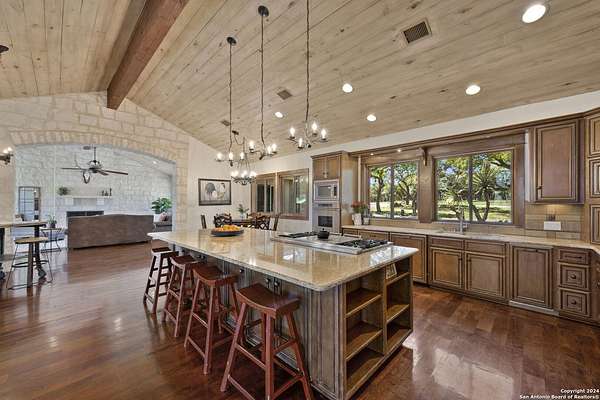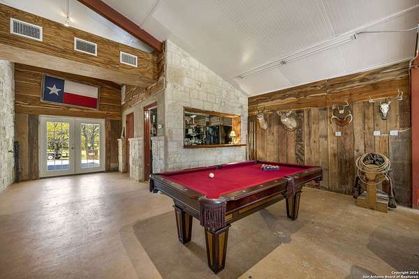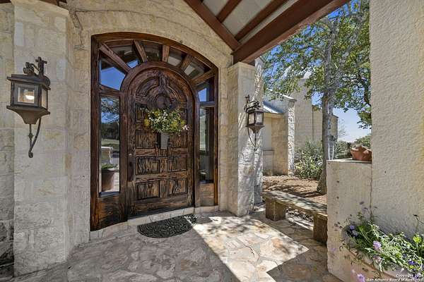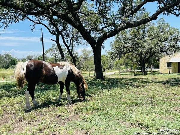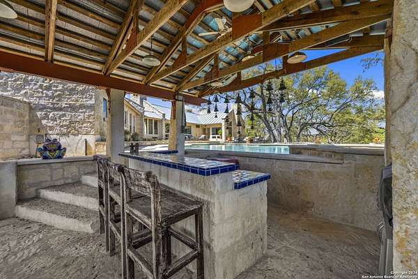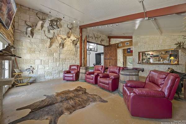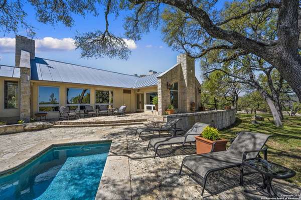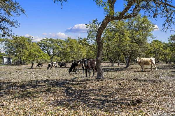 Just 3.7 miles from downtown Boerne, this 38.77-acre unrestricted Hill Country property offers privacy, versatility, and extensive amenities with wildlife exemption in place and located in Boerne ISD. The 4-bedroom, 3 bath ranch style home features stone and wood finishes, a chef's kitchen with upgraded appliances, two living areas with fireplaces, and a spacious primary suite with fireplace, soaking tub, walk in shower, and oversized closet. A detached 560 square foot casita with kitchenette and bath adds flexibility. Outdoor living includes a heated pool and spa, 5000 square foot limestone patio, and a fully equipped outdoor kitchen with gas stove, grill, and fireplace. A separate 7400 square foot building offers a 55 x 40 basketball gym, two guest apartments, a game room, and storage. Additional improvements include two lighted putting greens, a skeet range with automatic throwers, a stocked half acre fishing pond, and a 5200 square foot automotive workshop with paint booth, office, lifts, and roll up doors. Equestrian facilities include two horse barns, tack and feed room, cross fenced pastures, and an 88 x 200 roping arena. Rare acreage with significant improvements and close proximity to town.