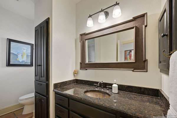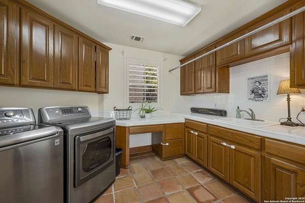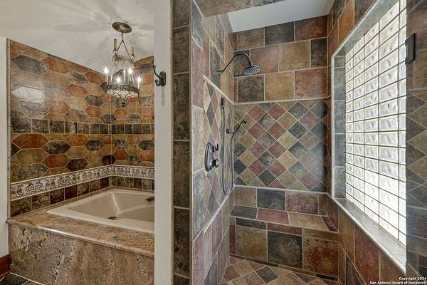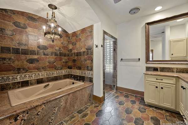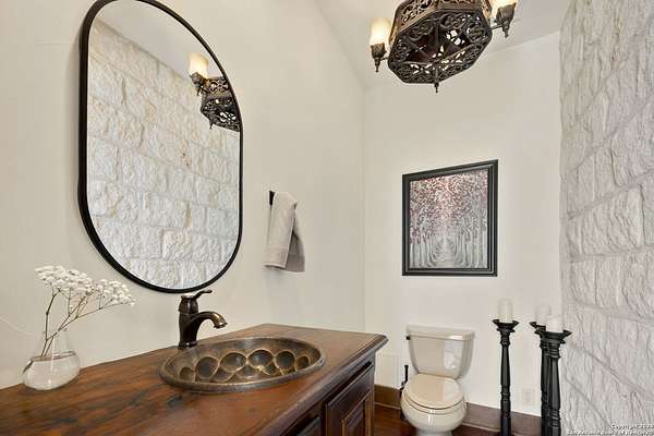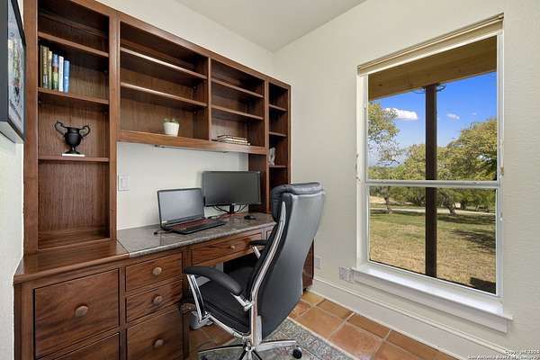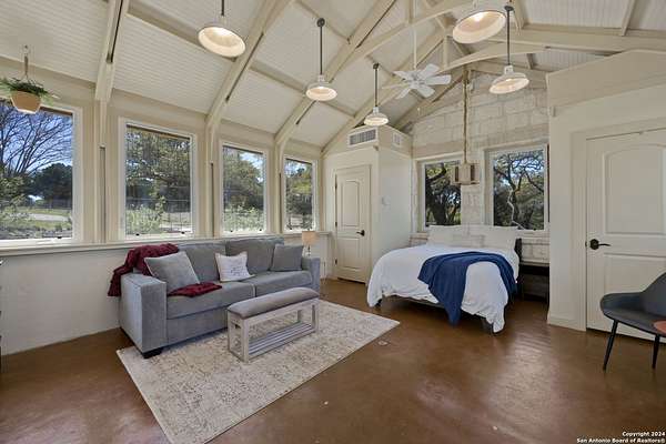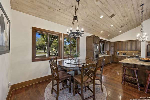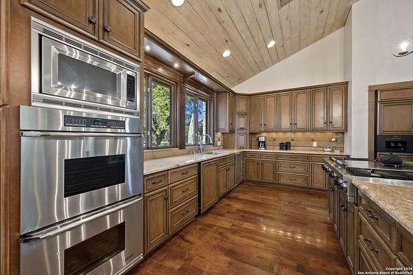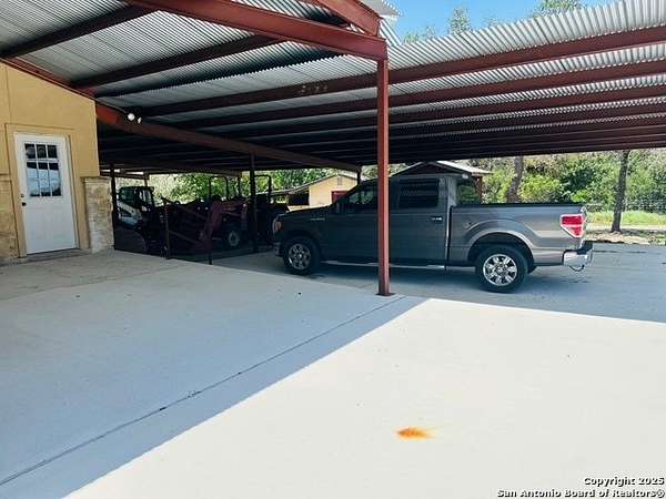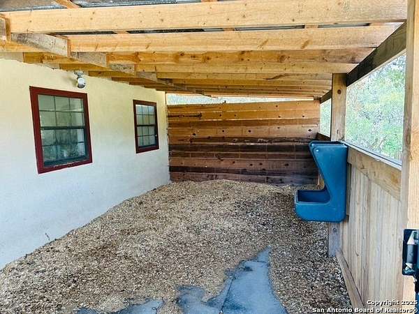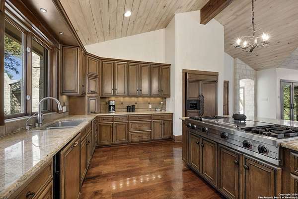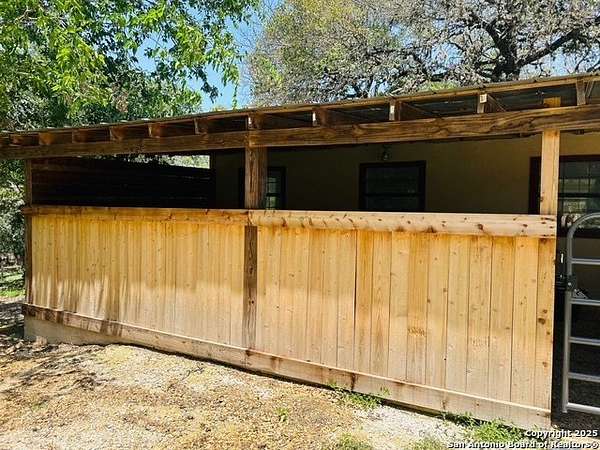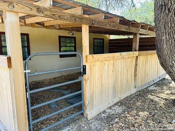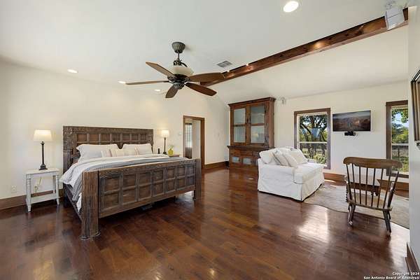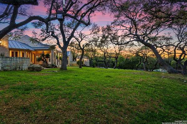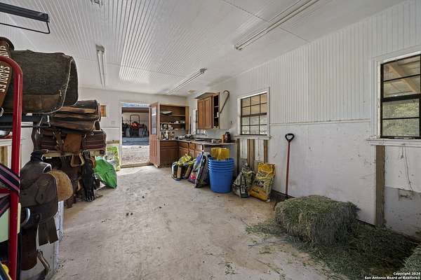 Just 3.7 miles from downtown Boerne, this 38.77-acre unrestricted Hill Country property offers privacy, versatility, and extensive amenities with wildlife exemption in place and located in Boerne ISD. The 4-bedroom, 3 bath ranch style home features stone and wood finishes, a chef's kitchen with upgraded appliances, two living areas with fireplaces, and a spacious primary suite with fireplace, soaking tub, walk in shower, and oversized closet. A detached 560 square foot casita with kitchenette and bath adds flexibility. Outdoor living includes a heated pool and spa, 5000 square foot limestone patio, and a fully equipped outdoor kitchen with gas stove, grill, and fireplace. A separate 7400 square foot building offers a 55 x 40 basketball gym, two guest apartments, a game room, and storage. Additional improvements include two lighted putting greens, a skeet range with automatic throwers, a stocked half acre fishing pond, and a 5200 square foot automotive workshop with paint booth, office, lifts, and roll up doors. Equestrian facilities include two horse barns, tack and feed room, cross fenced pastures, and an 88 x 200 roping arena. Rare acreage with significant improvements and close proximity to town.