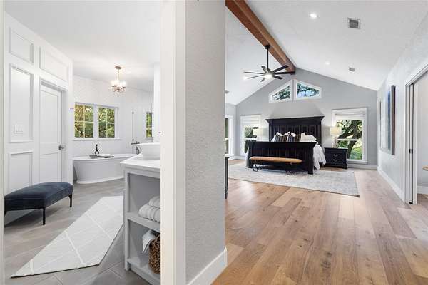 - Beamed Ceilings, Bookcases, Breakfast Bar, Built-In Features, Cathedral Ceiling(s), Ceiling Fan(s), Ceiling-High, Chandelier, Double Vanity, Entrance Foyer, Granite Counters, In-Law Floorplan, Interior Steps, Kitchen Island, Multiple Dining Areas, Multiple Living Areas, Pantry, Primary Bedroom On Main, Recessed Lighting, Soaking Tub, Walk-In Closet(s), Wet Bar, Wired For Sound