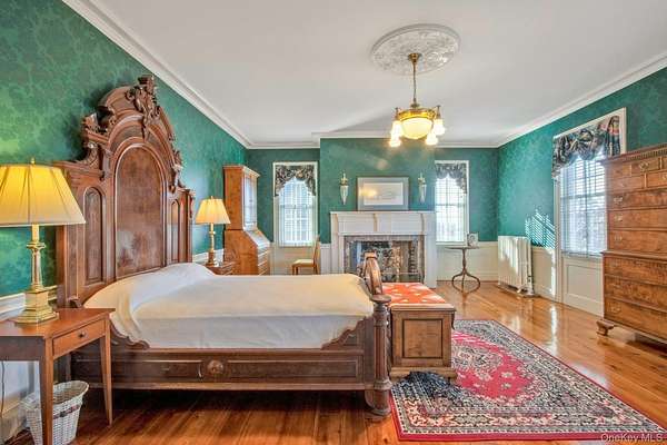 As you enter though the wide center hall, to one side is the living room, with custom-crafted archways over the windows and a warming fireplace. This leads into the adjoining sitting room with another gas fireplace. Across the hall is the banquet-sized formal dining room with the third fireplace and featuring an exquisite 12-arm custom Waterford chandelier. From here you enter the eat-in kitchen featuring the immense and warming AGA cast iron cooker and the fourth gas fireplace.