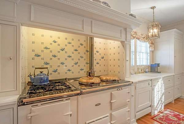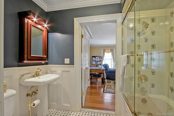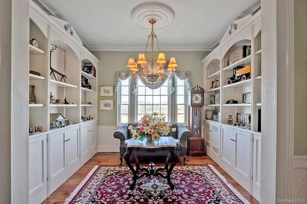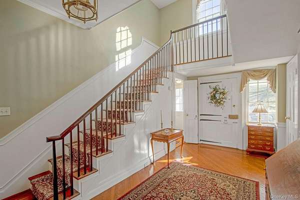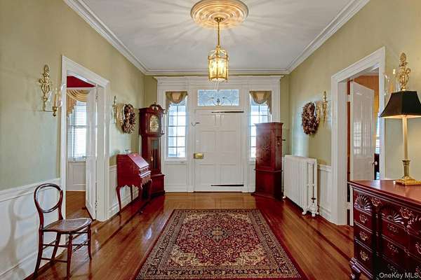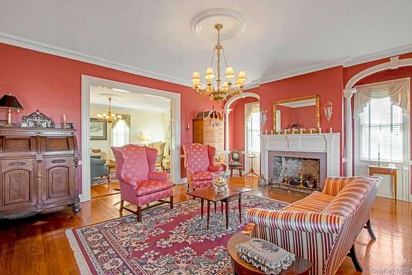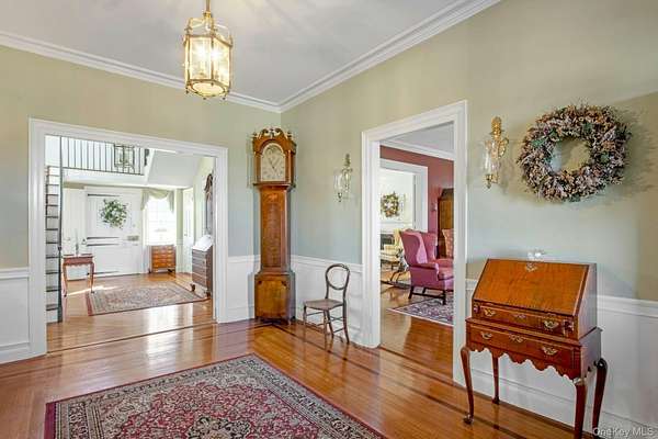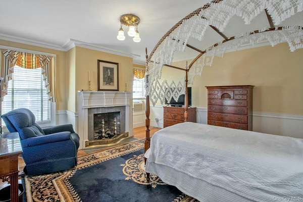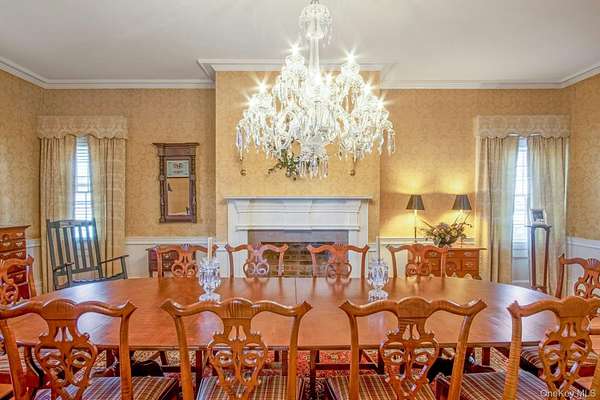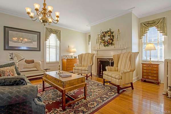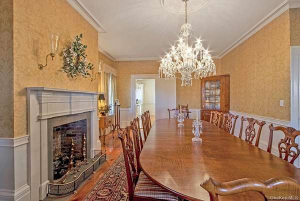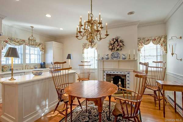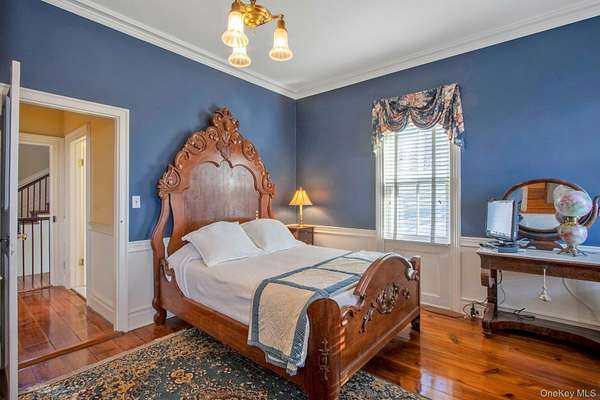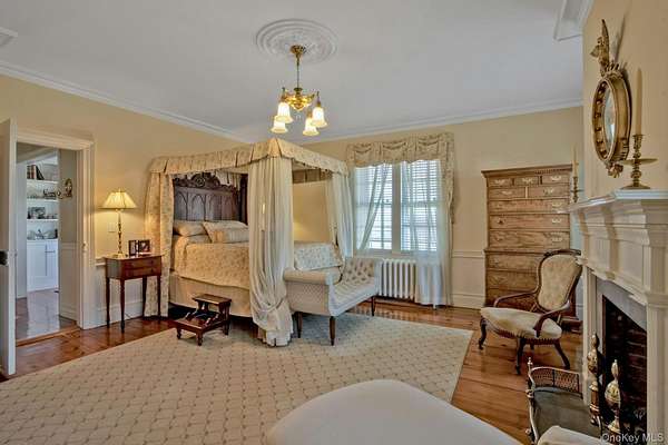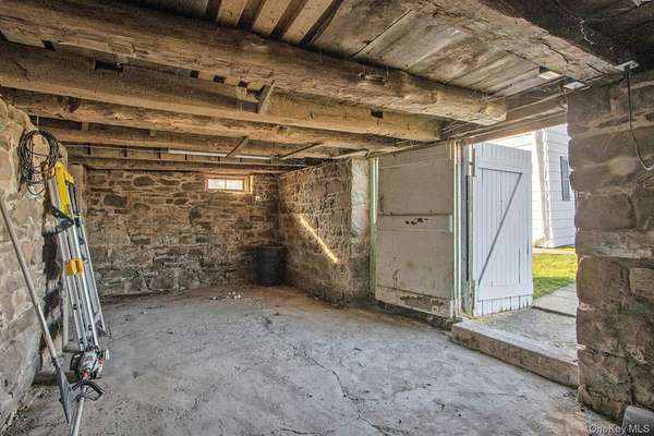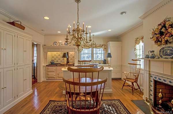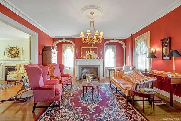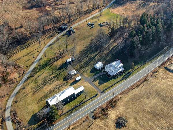 One of the original Goshen farms, built c.1770-1775, and where condensed milk was invented, this Federal-Style Colonial has been meticulously restored down to every period-correct detail with no expense spared. The 5-acre estate features the Main House, Dairy Barn, Root Cellar w Loft, 2-car Garage, Tool Shed, & Chicken Coop. Updates encompass everything - a full restoration starting from the 1993 and continuing to this day, including: 8 fireplaces (7 gas and working, 1 orig Ben Franklin decorative) - new electric from the pole throughout the house - gas line to street - plumbing - boiler - water heater - drilled well - gutters - roof - all custom millwork throughout - hand-painted Delft tiles - all metal roofs - hand laid stone wall no mortar - carport - hardwood floors - 3 room basement with poured concrete floors. Not one creak or crack in this perfectly kept home, the quality of which is rarely seen. As you enter though the wide center hall, to one side is the living room, with custom-crafted archways over the windows and a warming fireplace. This leads into the adjoining sitting room with another gas fireplace. Across the hall is the banquet-sized formal dining room with the third fireplace and featuring an exquisite 12-arm custom Waterford chandelier. From here you enter the eat-in kitchen featuring the immense and warming AGA cast iron cooker and the fourth gas fireplace. A graceful hardwood staircase ascends from the first to the third floor, with spacious landings along the way. The second level features four generously sized bedrooms, two with ensuite full bathrooms and two which share a Jack n Jill full bathroom. And of course, each bedroom has its own cozy and unique fireplace. A sun-drenched library and a convenient laundry closet complete this level. On the third floor, you'll find a spacious attic with high ceilings, multiple windows that invite natural light, and a separate bonus room, perfect for a variety of uses. The full, unfinished basement offers three rooms for ample and dry storage. This home, offering sublime privacy and tranquility, has been elegantly decorated and many of the antiques and period-correct furniture can be negotiated. Whether you're savoring sunsets from the front porch or admiring the brilliance of the night sky in your backyard, this serene retreat - truly a piece of Goshen history - provides the perfect balance of nature and comfort.