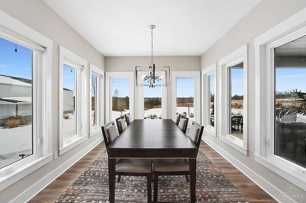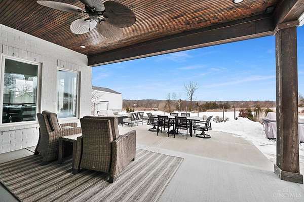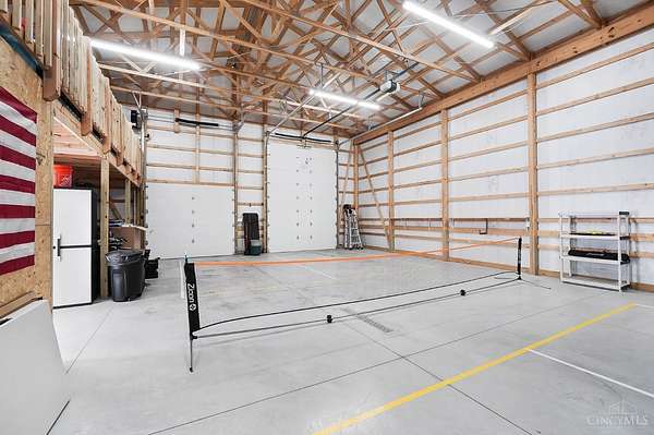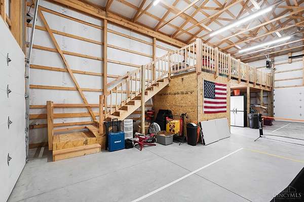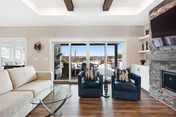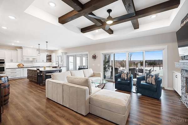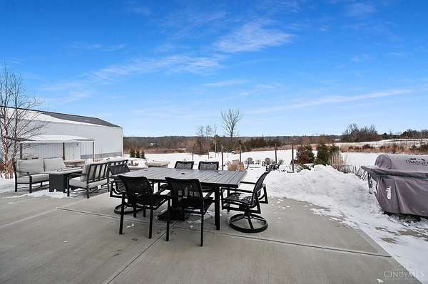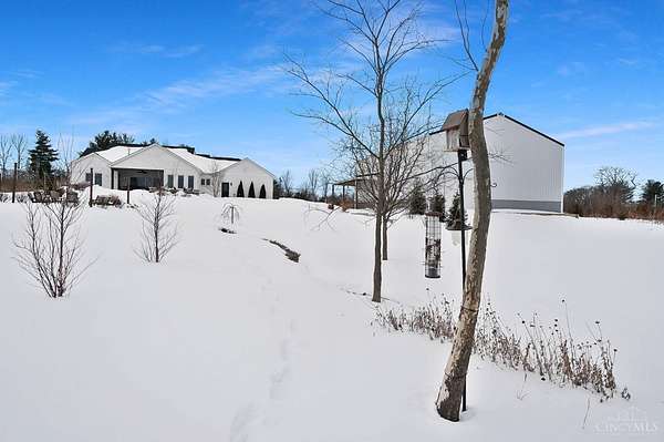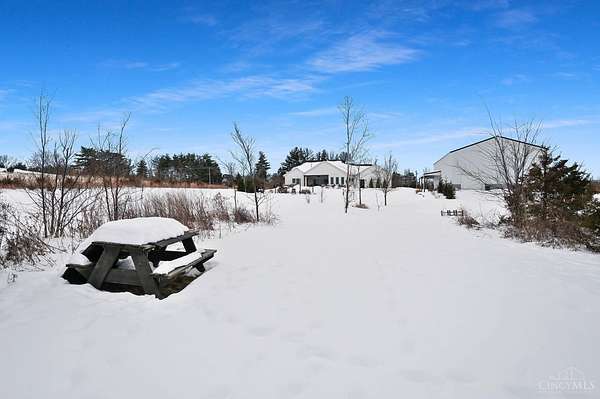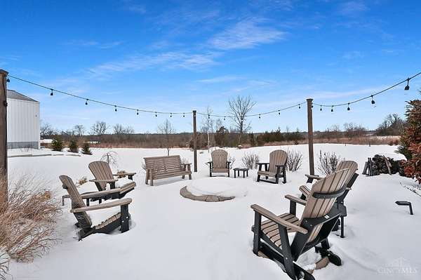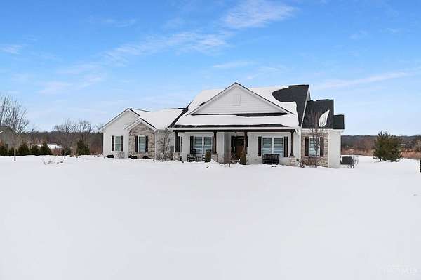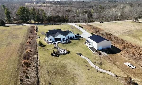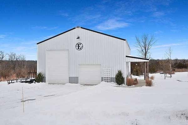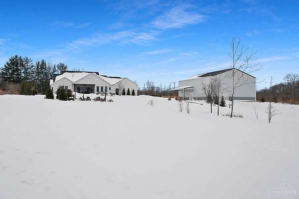 Nestled on just over 3 acres of private country setting only minutes from downtown Lebanon with quick access to I-71, this exceptional residence is designed for elevated living and effortless entertaining. A 36x48 pole barn accommodates a 45' RV or pickleball court with 30-amp shore power, loft storage, and a full bath, offering rare lifestyle flexibility. The open-concept interior flows from the living room to the dining area and designer white-on-white kitchen featuring an impressive 8' Cambria quartz island and custom barrel bar, extending to a resort-style outdoor retreat with a multi-level patio, covered lounge space, hot tub, and firepit area. The primary suite delivers a spa-inspired bath, walk-in closet, and adjoining laundry for everyday convenience. The finished lower level adds a spacious family room with wet bar, two bedrooms, full bath, and ample storage. This gorgeous home delivers a refined balance of luxury finishes, entertaining spaces, and serene acreage living.