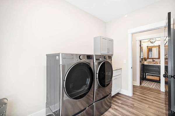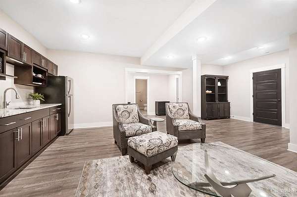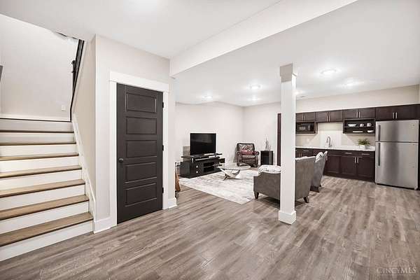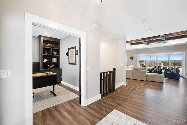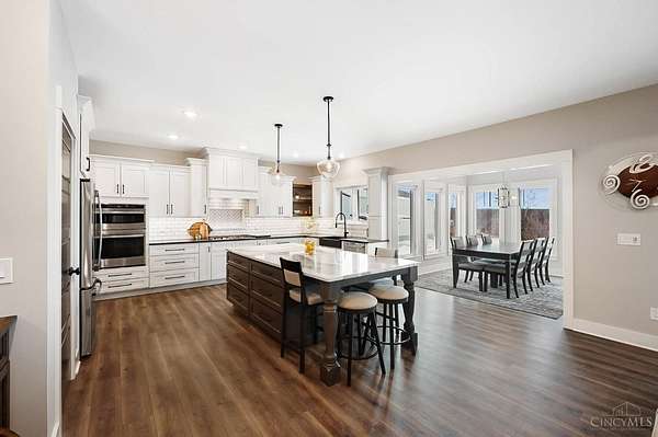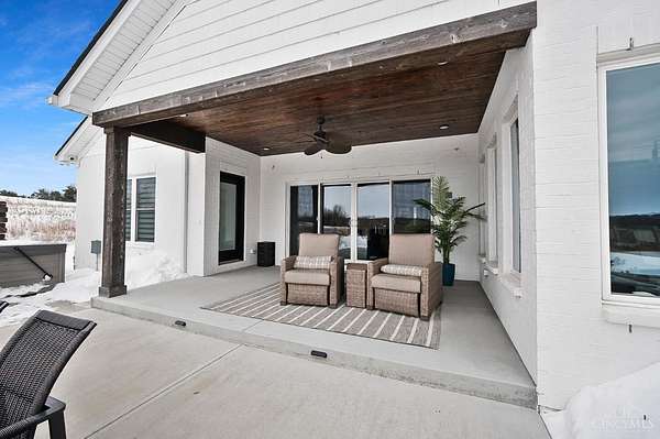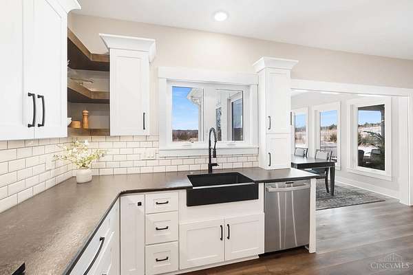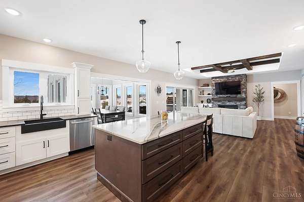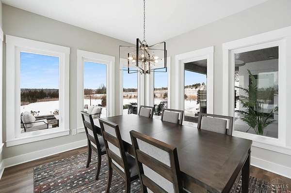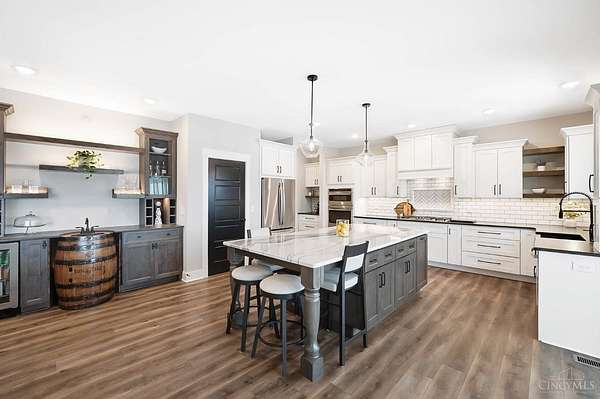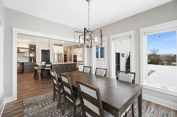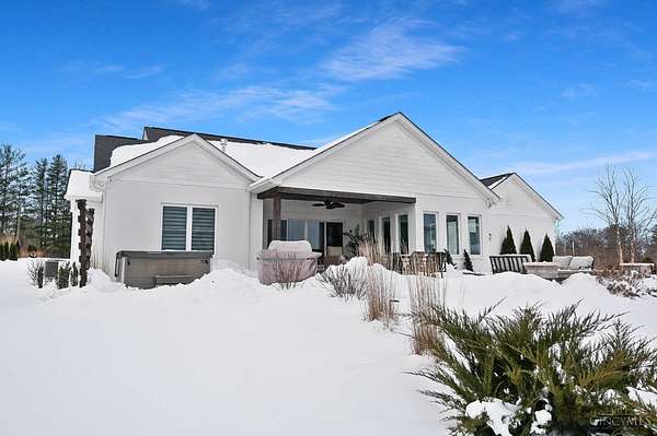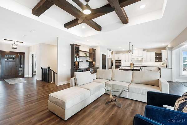 Nestled on just over 3 acres of private country setting only minutes from downtown Lebanon with quick access to I-71, this exceptional residence is designed for elevated living and effortless entertaining. A 36x48 pole barn accommodates a 45' RV or pickleball court with 30-amp shore power, loft storage, and a full bath, offering rare lifestyle flexibility. The open-concept interior flows from the living room to the dining area and designer white-on-white kitchen featuring an impressive 8' Cambria quartz island and custom barrel bar, extending to a resort-style outdoor retreat with a multi-level patio, covered lounge space, hot tub, and firepit area. The primary suite delivers a spa-inspired bath, walk-in closet, and adjoining laundry for everyday convenience. The finished lower level adds a spacious family room with wet bar, two bedrooms, full bath, and ample storage. This gorgeous home delivers a refined balance of luxury finishes, entertaining spaces, and serene acreage living.