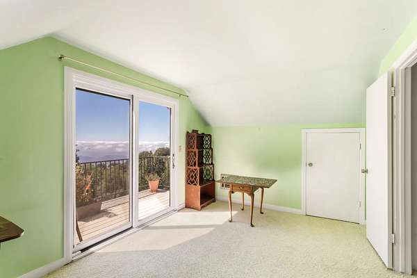 Inside, sunlight filters through a dramatic wall of windows, filling the open living area with golden light and revealing views that stretch across the forested ridge lines to the distant ocean on a clear day. Wood finished ceilings and a striking rock fireplace set the tone for relaxed mountain living, while the home’s thoughtful upgrades—including a dual-fuel cook stove, newer refrigerator and washer, and three sources of heat (fireplace, furnace, and electric wall heaters)—ensure both comfort and convenience in every season.
