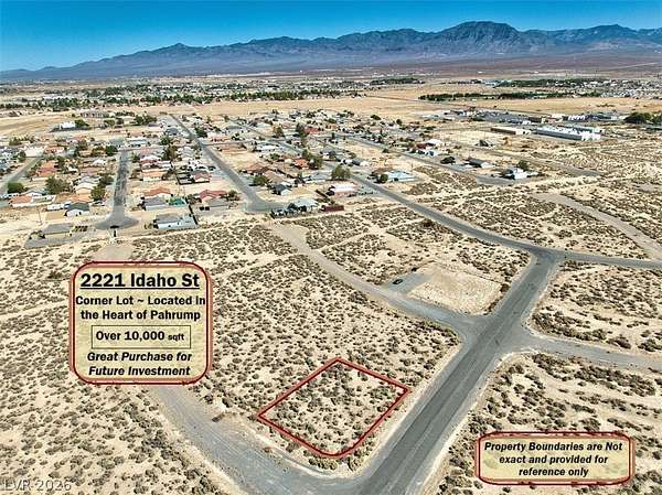 Est $138/mo2221 Idaho St, .27 Acres, Beautiful Corner Lot in Located in the heart of Pahrump, NV. The town that is known for its suburban/rural lifestyle with a lower cost of living and only 1 hour away from Las Vegas. As the population grows and demand increases this is a great investment option. Make your offer today!