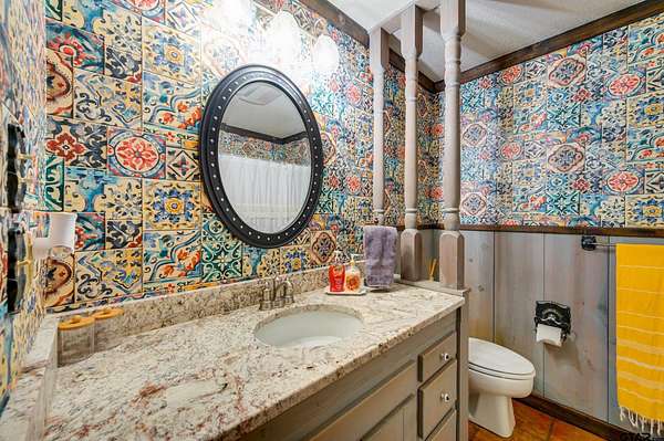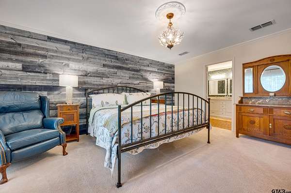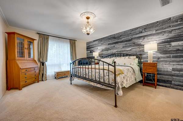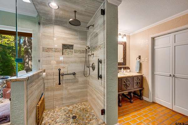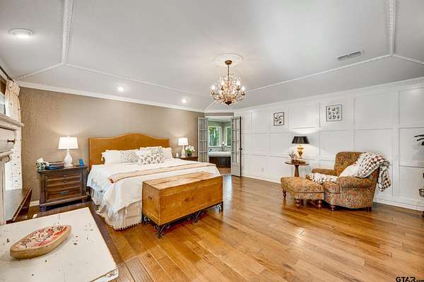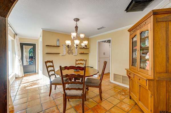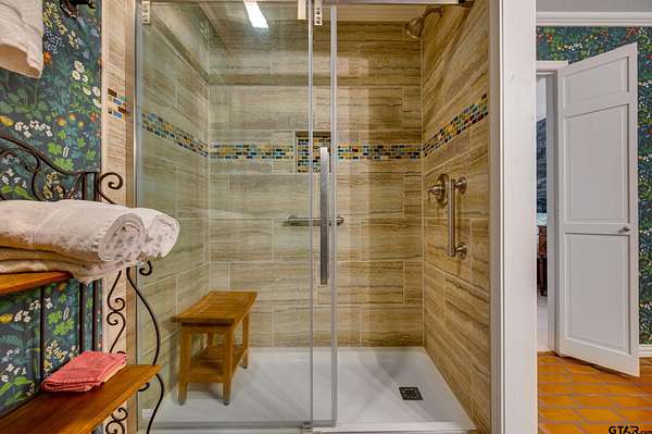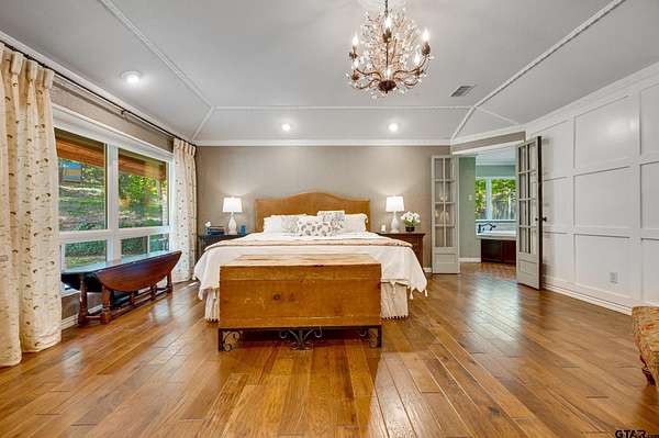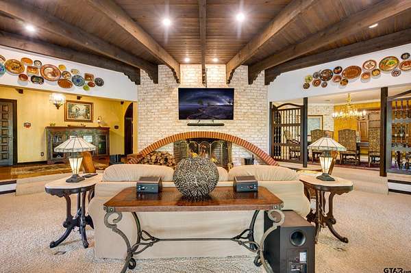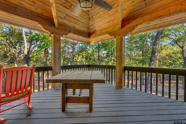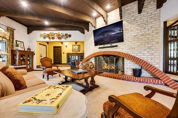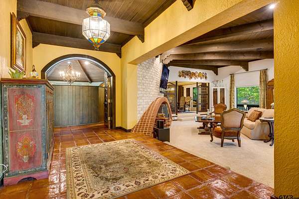 Hidden among towering trees in historic Palestine, this custom-built Mediterranean-style home is a one-of-a-kind sanctuary blending architectural artistry with the beauty of nature. Located on a 4.7-acre hill beside Davey Dogwood Park, a winding concrete drive leads you through lush foliage to the residence, where a charming fountain patio framed by azaleas and dogwoods sets a tranquil tone. The Saltillo-tiled front porch invites you to linger before stepping onto the elevated wraparound deck, where you're embraced by the canopy of trees and endless views of the surrounding landscape. Inside, double entry doors open to an impressive hexagonal living room anchored by a wide arched brick fireplace, while a stunning stained & beamed wood ceiling soars above. Expansive picture windows throughout capture the natural beauty outside, bringing light and tranquility into nearly every room. The dining room, featuring a painted wood ceiling, opens to the deck--perfect for alfresco dining or quiet moments overlooking the trees. At the heart of the home, a sunken octagonal kitchen surrounded by a Saltillo tile hall & walls of glass glows with tree shaded light. Three sets of intricately carved double wood doors add architectural distinction, while chefs will appreciate the Jenn-Air appliances and casual breakfast nook overlooking the private backyard. The primary suite offers a retreat with warm wood floors and a spa-inspired bath featuring a soaking tub, multi-head shower, dual sinks, and generous closets. A spacious family room showcases whitewashed wood walls, vaulted beamed ceilings, a bar with sink, and to the guest wing with an ensuite bedroom, an additional bedroom/office, and a full guest bath. Outdoors, enjoy a patio overlooking a large back yard as well as fruit trees & raised garden beds within a fenced garden area. For those who cherish privacy, nature, and distinctive design, this exceptional home is an inspiring haven unlike any other.