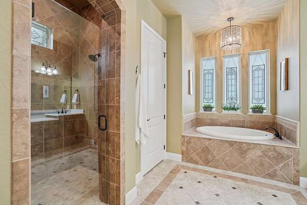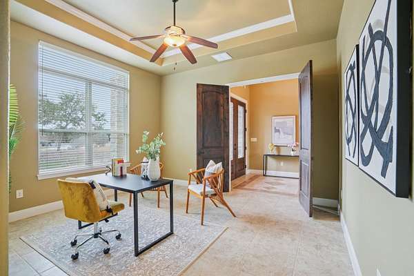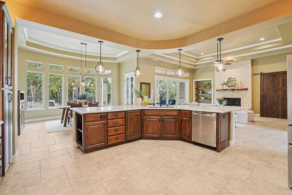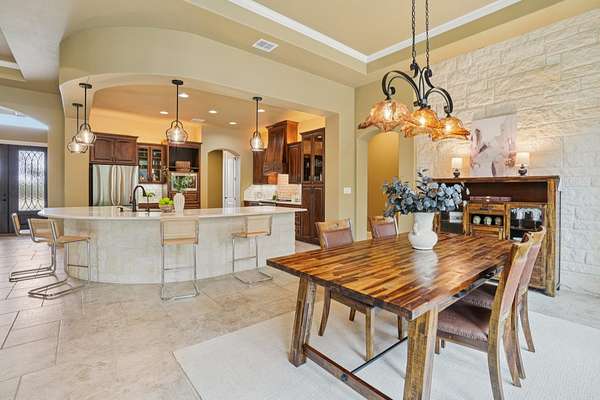 Set on 1.78 acres within the gates of Havenwood, this custom residence delivers scale, privacy, and craftsmanship rarely found in one address. The approach alone makes a statement - a long drive, 3-car garage, and a limestone-and-stucco exterior framed by mature landscaping. Inside, the home is built around space and flow. Expansive living areas are designed to feel open without ever feeling overwhelming. The fireplace commands attention in the main living room, while the kitchen operates as the centerpiece- anchored by a substantial limestone-wrapped island with ample seating. Wood cabinetry, quartz surfaces, double ovens, stainless appliances, and layered lighting create a kitchen that performs as beautifully as it presents. The rear of the home opens wide to an outdoor setting designed for everyday enjoyment. A vaulted, wood-paneled covered patio overlooks nature and roaming wildlife with multiple sittings areas. The primary suite is positioned for maximum privacy, creating a retreat that feels removed from the rest of the home. French doors introduce the space, tray ceilings elevate it, and panoramic windows soften it with natural light. The bath delivers scale and detail: dual vanities, a custom arched-entry shower, and a soaking tub set beneath a statement chandelier. Secondary bedrooms are thoughtfully placed for comfort and separation, including one with a private ensuite - ideal for guests or multigenerational living. All of this is set within Havenwood, where pools, courts, trails, and gathering spaces create a lifestyle that complements the property's presence. This isn't simply another home in the community. It's the one others are compared to.