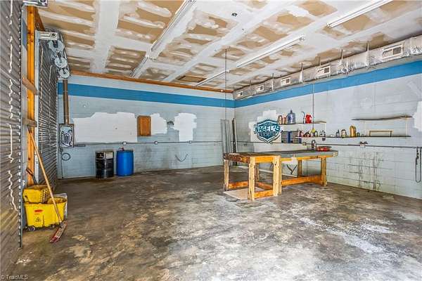The detached commercially zoned garage--complete with two roll-up doors, a private office, bathroom, and heating and cooling.