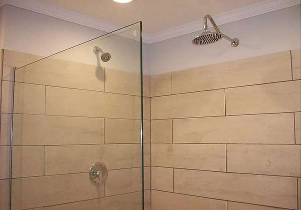 The home features tall ceilings with exposed beams, creating an open and inviting feel throughout. The modern kitchen offers a clean, updated design ideal for everyday living and entertaining. The bathroom includes a large walk-in shower with dual shower heads and a built-in bench, combining comfort and functionality. The interior has been newly painted, giving the home a fresh, move-in-ready finish.