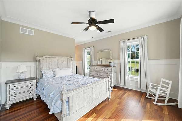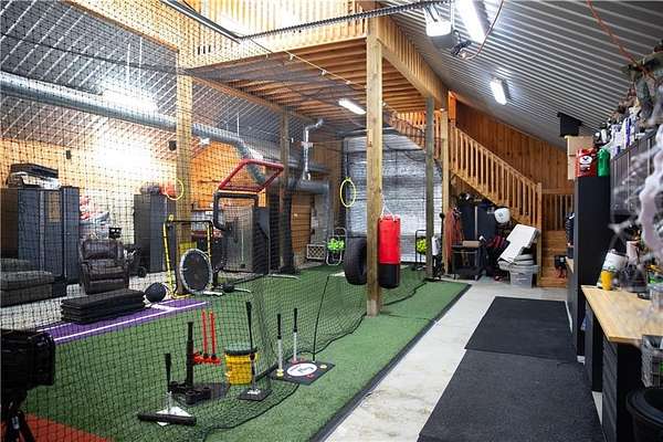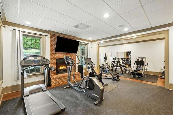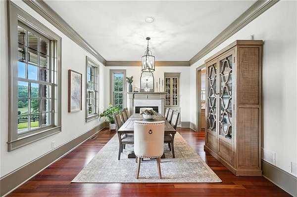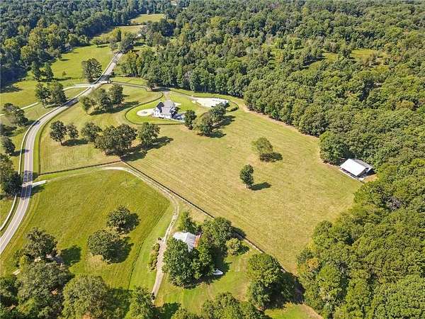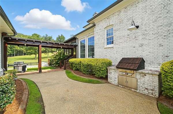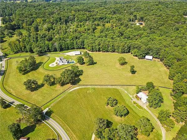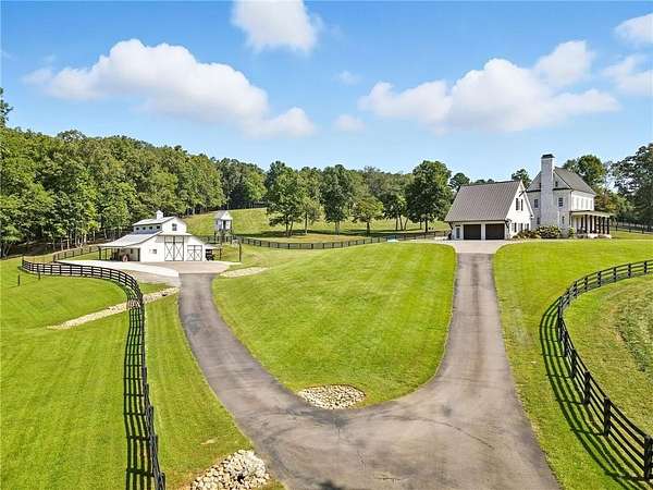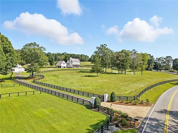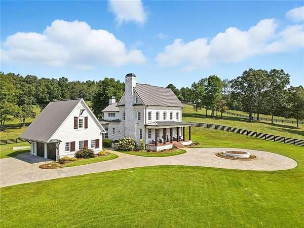 Prepare to be captivated by this extraordinary 18+ acre estate, a timeless Colonial Williamsburg masterpiece in the heart of sought-after Cherokee County. Fully fenced and gated, this property offers endless possibilities as an equestrian haven, private mini farm, or peaceful retreat with panoramic hilltop views. Two barns, subdivided pastures, and a sparkling PebbleTec pool anchor the grounds, framed by rolling hills and a quiet creek-lined rear border. The inviting front cedar porch showcases long-range views, while a detached garage with breezeway and loft offers potential guest or apartment space. A circular drive completes the perfect combination of classic charm and modern function. The elegant 6,500+ square foot main residence blends modern farmhouse design with refined craftsmanship. Freshly painted throughout, it features five bedrooms and five and one half baths. Brazilian cherry floors flow across the main level, where the formal dining room with fireplace, built-ins, and detailed millwork sets a warm and elegant tone. The light-filled gourmet kitchen includes marble countertops, a large island with prep sink, farmhouse sink, custom cabinetry, and a full butler's pantry. The adjacent dining area opens to a screened porch overlooking the pool and pastures. The main-level family room centers on a fireplace with custom built-ins and beadboard ceiling. The luxurious primary suite features crown molding, a dual-entry custom closet, and a spa-like marble bath with soaking tub, marble shower, and double vanity. The main-level laundry room provides custom cabinetry and a utility sink. Every detail, including Baldwin solid brass hardware, reflects thoughtful design and quality craftsmanship. Upstairs, wide-planked stairs lead to a loft landing with built-ins and a study nook. Three spacious bedrooms each offer private ensuite baths, one with a clawfoot tub, along with a second laundry room. The third floor includes two loft spaces that are ideal for guest rooms, an office, or a play area. The terrace level offers a third fireplace, gym area, fifth bedroom suite, full bath, laundry closet, and abundant storage. Outdoor living shines with a screened porch featuring hardwood floors and a fourth fireplace overlooking the PebbleTec pool with ozone purification, fountain, and waterfall. Lounge and covered patio areas create an entertainer's dream, while an under-deck system provides year-round outdoor enjoyment. The main barn with loft apartment adds incredible versatility. It includes a bedroom loft, full bath, and kitchenette with separate utilities and Wi-Fi, making it perfect for guests, rental income, or multigenerational living. Below, three oversized garage bays with high ceilings accommodate RVs or large vehicles, with workshop cabinetry and a stove stub for a potential studio or hobby space. A converted fitness area and fenced pastures support goats, chickens, or horses. The upper barn with tack room, currently used for boat storage, was originally designed with five 12x13 stalls and can easily convert back for equestrian use. A large fenced pasture and four-board fencing surround the property, supported by irrigation for lush grounds. A charming air-conditioned playhouse with electricity adds a whimsical touch, ideal for children or as a creative workspace. This rare property combines architectural elegance, modern comfort, and breathtaking land. Whether your dream is equestrian pursuits, multigenerational living, or a private sanctuary minutes from modern conveniences, this estate delivers the perfect balance of beauty, privacy, and possibility.