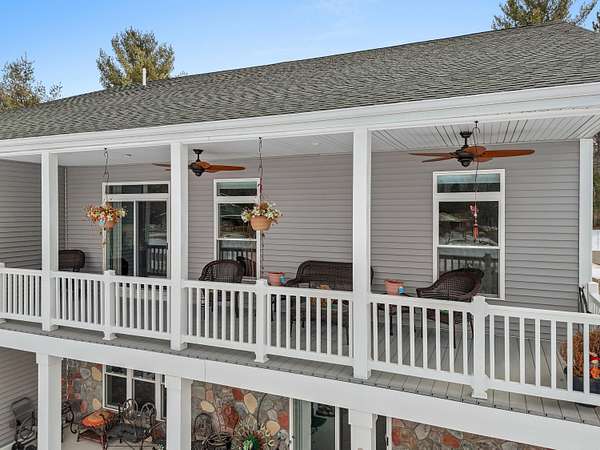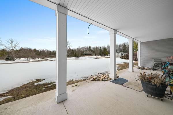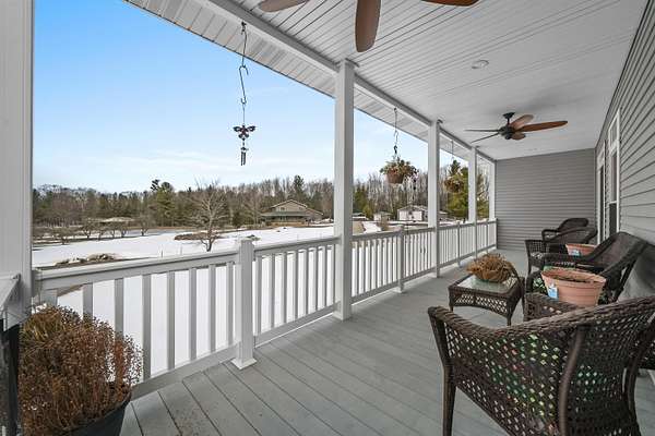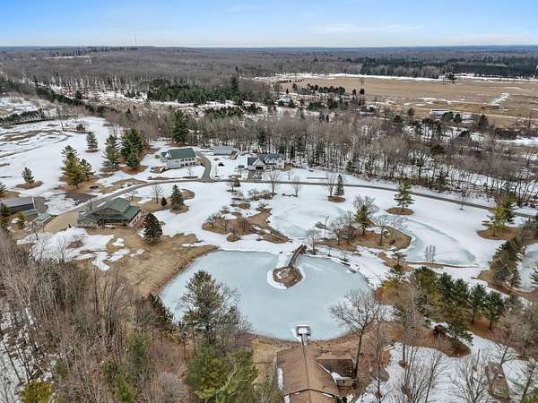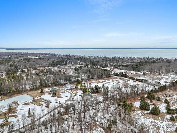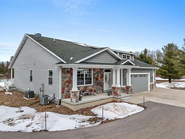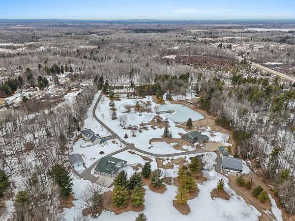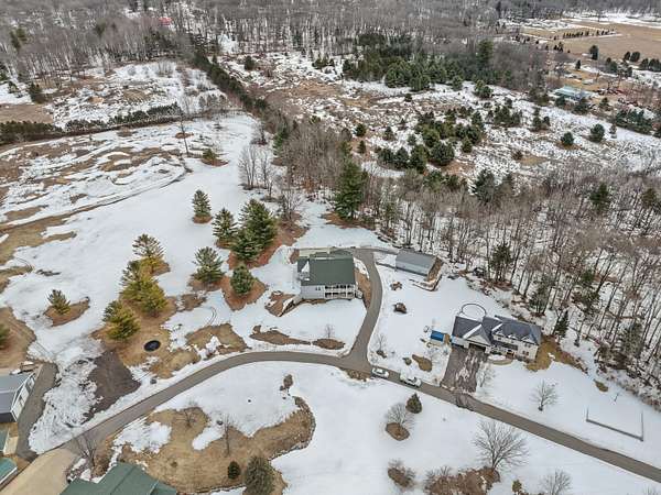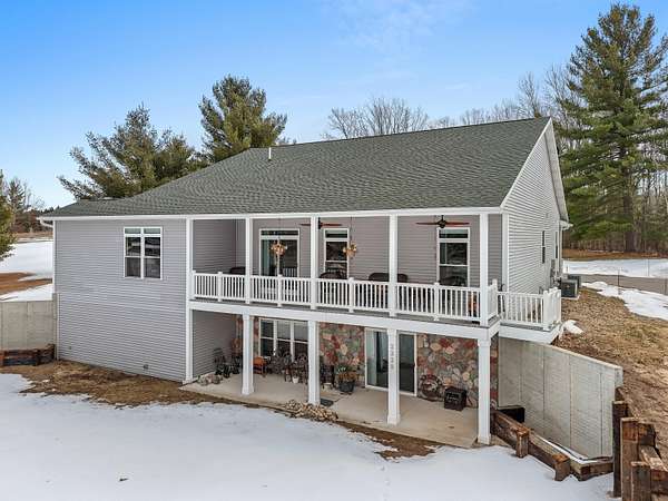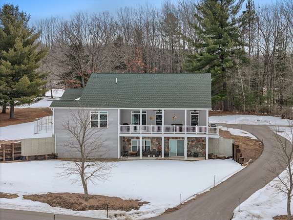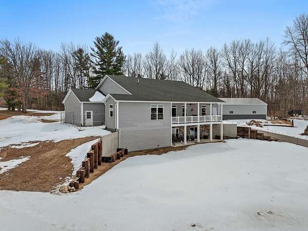 Tucked away on 2 acres along a shared private drive, this beautifully custom-built home overlooks three serene ponds and an abundance of wildlife. True Northern Michigan living while only being about a mile from the lake. Offering 3 bedrooms and 3 bathrooms, it features 10-ft ceilings, granite countertops throughout, custom kitchen cabinetry with a matching hood vent, and stainless steel appliances. The walkout basement is ideal for entertaining with a custom-built bar and spacious layout. Relax on the covered porch or balcony and take in the peaceful views. Extras include a whole-house generator, water softener and filtration system, dog run, and a 30x40 pole barn with 18-ft ceilings, 10-ft garage doors, concrete floor, drain, and separate electrical panel for all the extras.