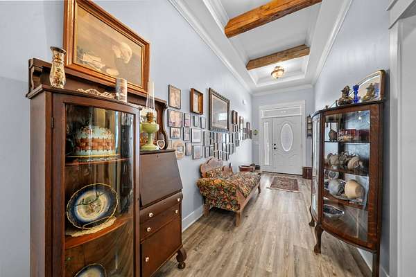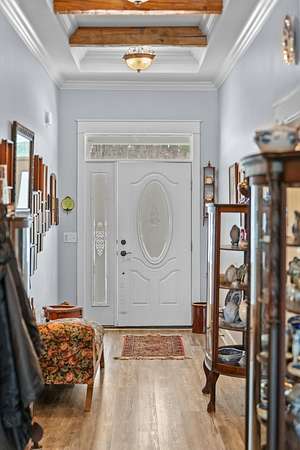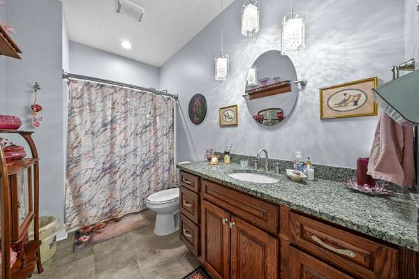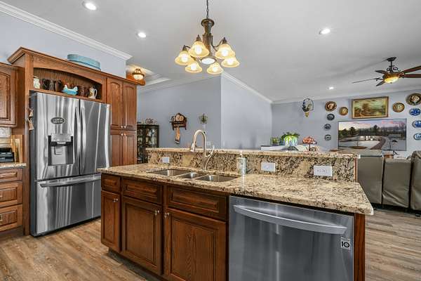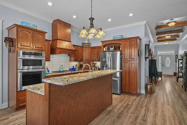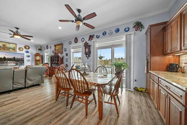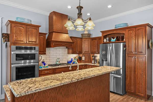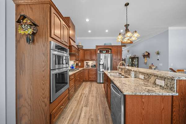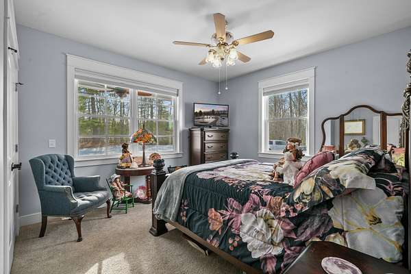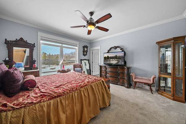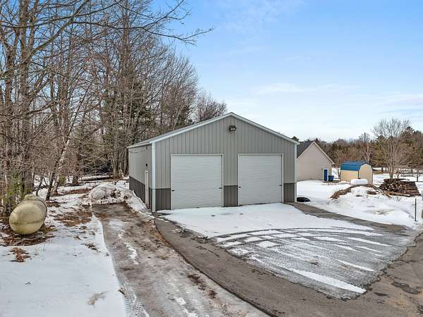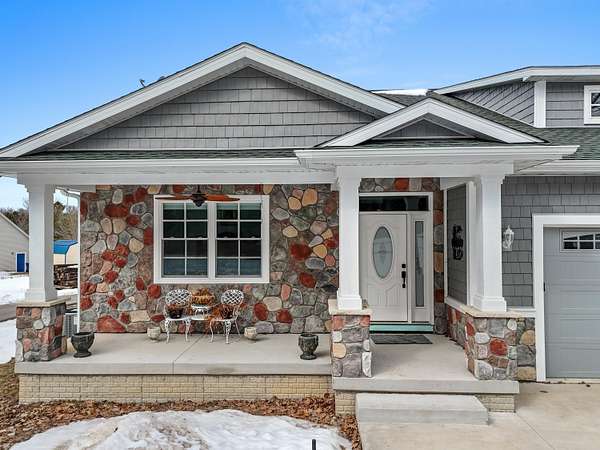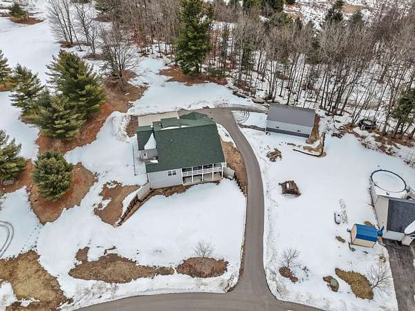 Tucked away on 2 acres along a shared private drive, this beautifully custom-built home overlooks three serene ponds and an abundance of wildlife. True Northern Michigan living while only being about a mile from the lake. Offering 3 bedrooms and 3 bathrooms, it features 10-ft ceilings, granite countertops throughout, custom kitchen cabinetry with a matching hood vent, and stainless steel appliances. The walkout basement is ideal for entertaining with a custom-built bar and spacious layout. Relax on the covered porch or balcony and take in the peaceful views. Extras include a whole-house generator, water softener and filtration system, dog run, and a 30x40 pole barn with 18-ft ceilings, 10-ft garage doors, concrete floor, drain, and separate electrical panel for all the extras.