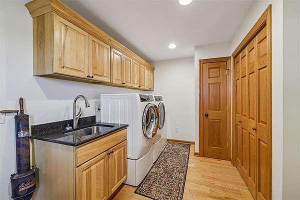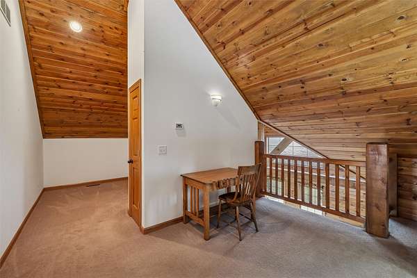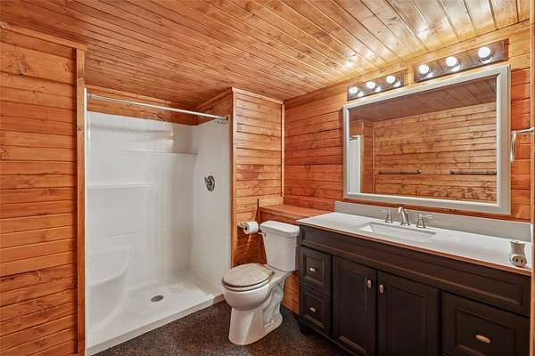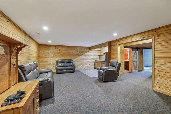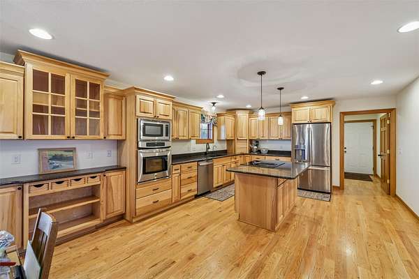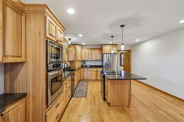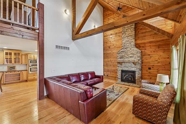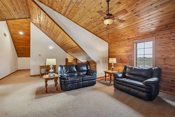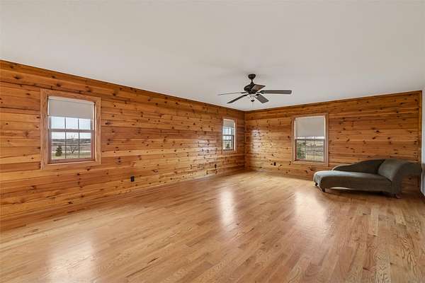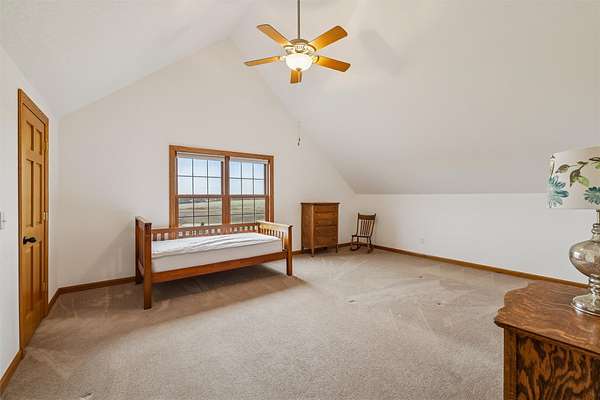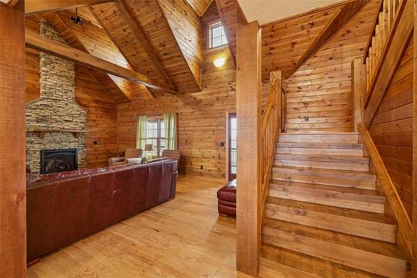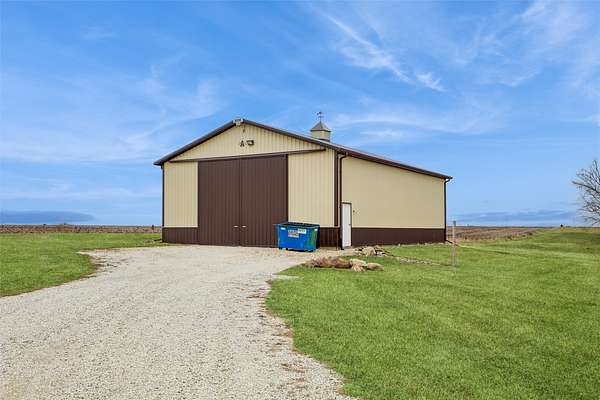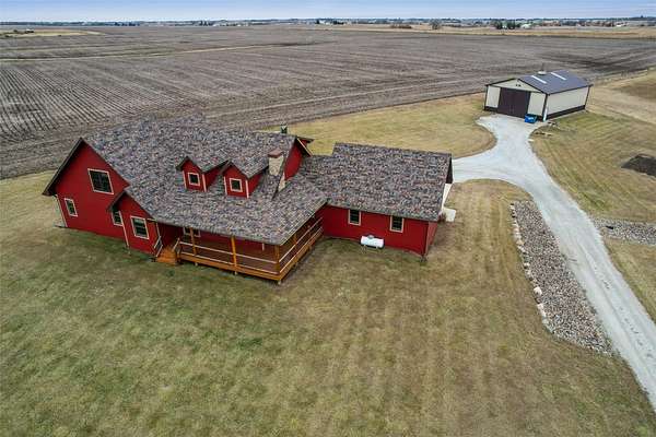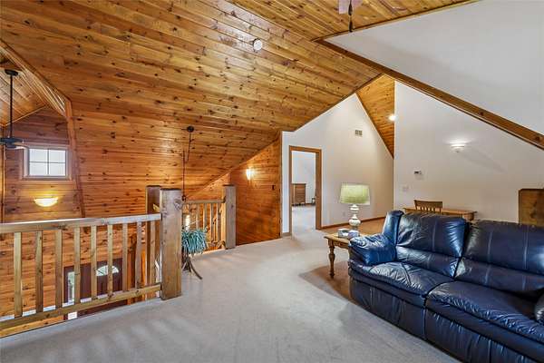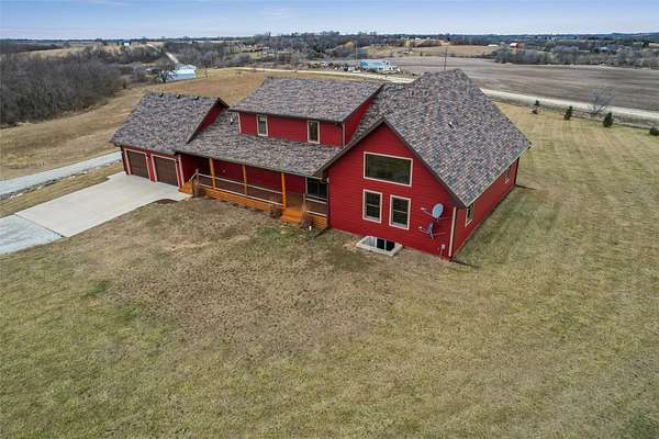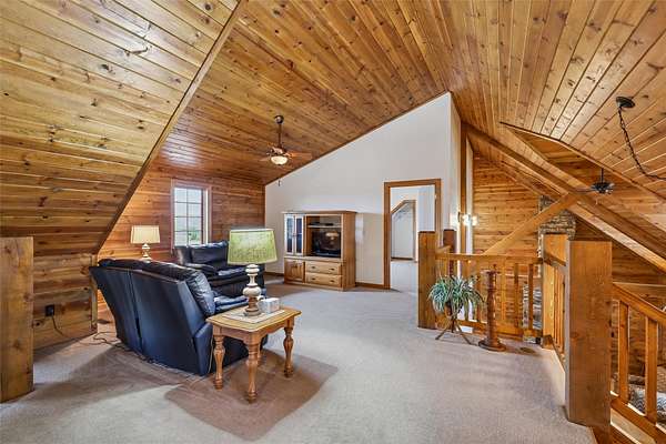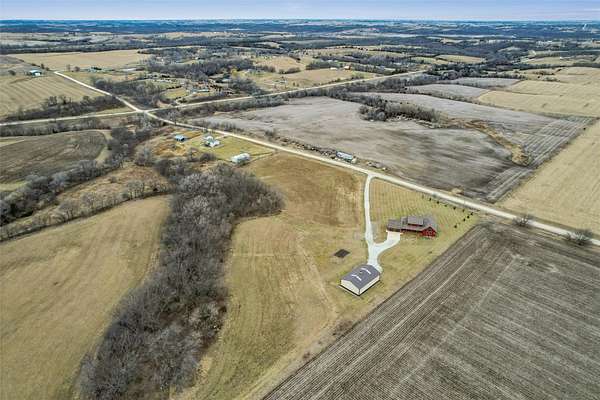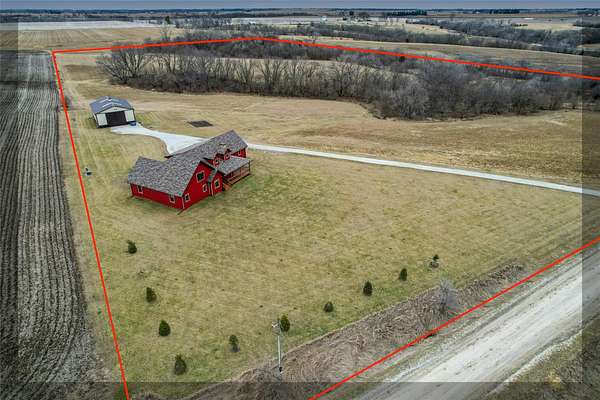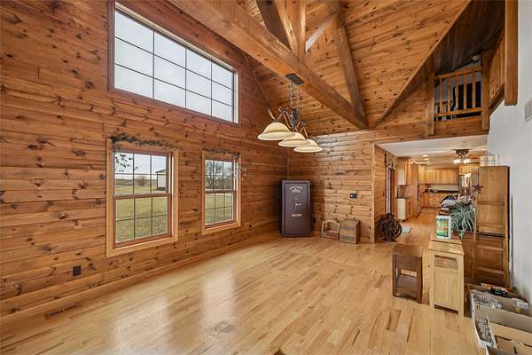 Situated on 20 acres, this 1 1/2-story home offers nearly 4,800 sq ft of finished living space designed with scale, quality and comfort in mind. The main level features vaulted wood ceilings, exposed beams, hardwood floors and a stone fireplace that anchors the living area. An open kitchen with solid wood cabinetry, island and generous counter space connects seamlessly to the dining and living spaces. The primary suite includes a tile shower, whirlpool tub and a sitting area within the bedroom, adding both comfort and functionality. The home includes 3 bedrooms and 4 bathrooms, providing flexibility for everyday living and guests. The finished lower level adds a large family room and wet bar, ideal for entertaining. The property is equipped with a geothermal heating and cooling system. Outdoor amenities include a covered front porch, a 36x54 outbuilding and approximately 13 acres of productive row crop. A rare acreage offering privacy, usable land, and substantial living space. All information obtained from seller and public records.